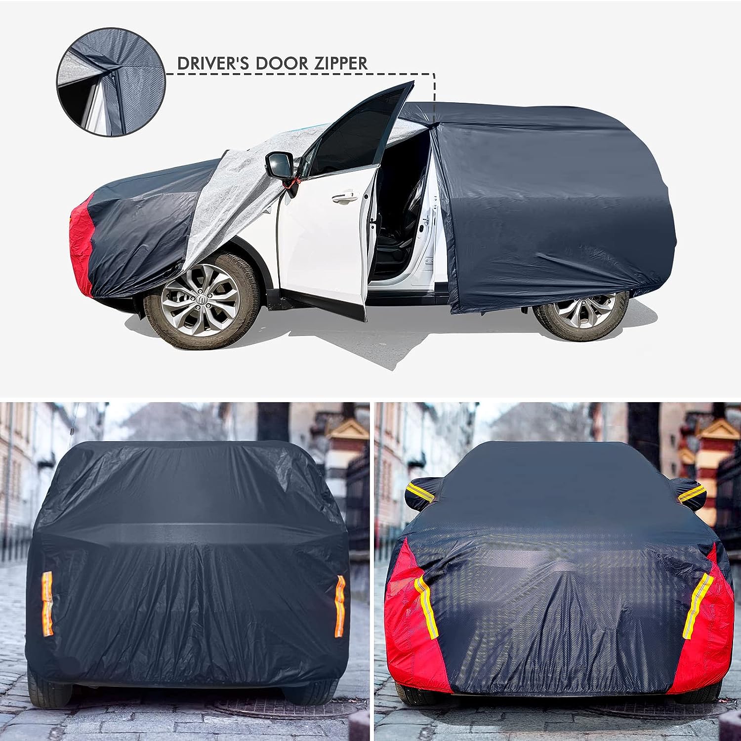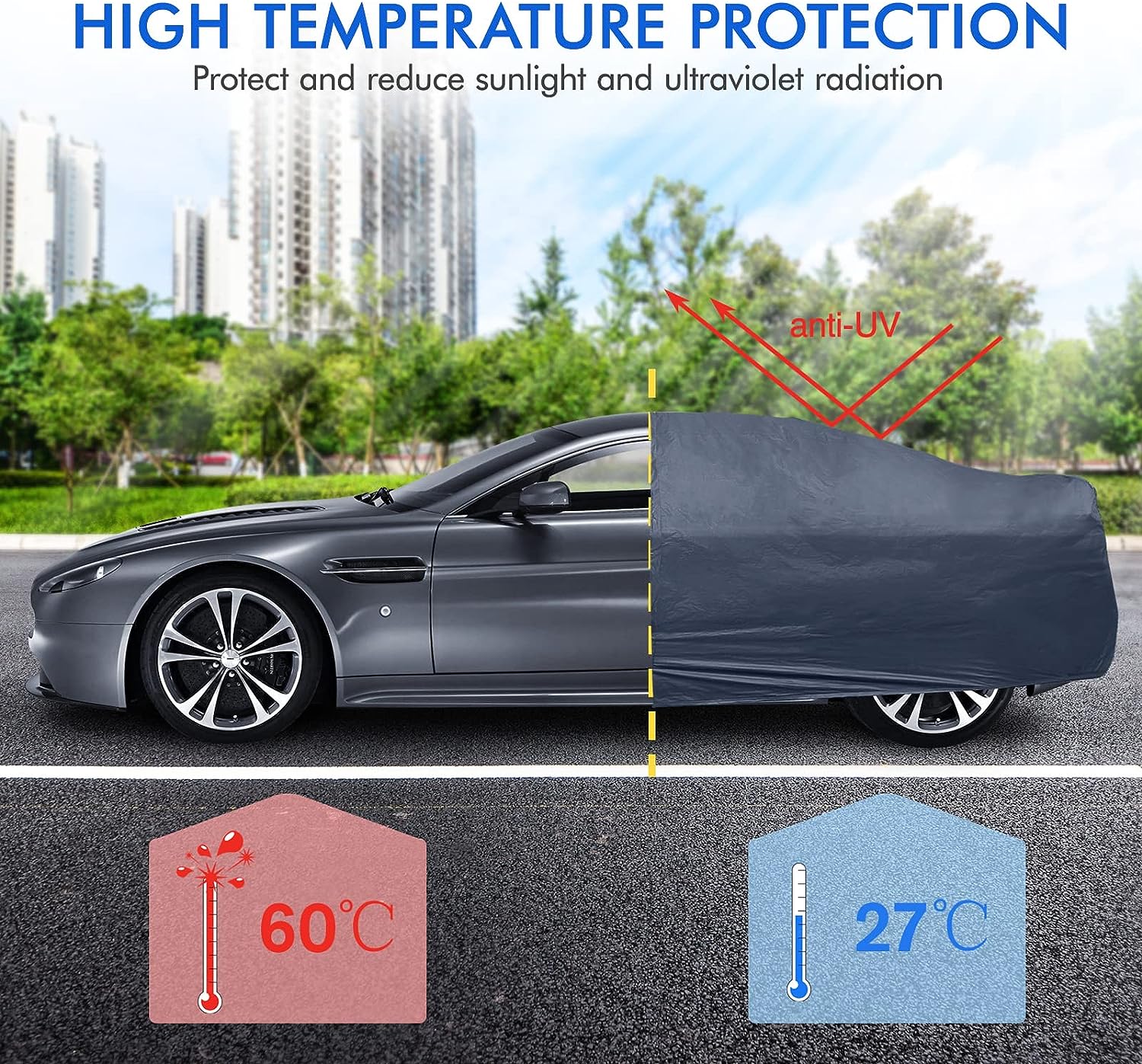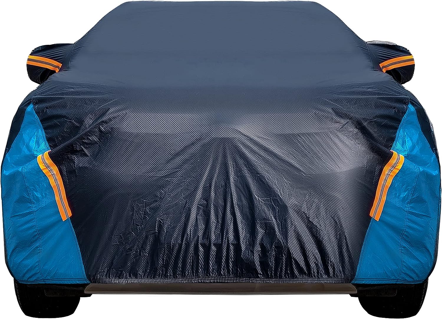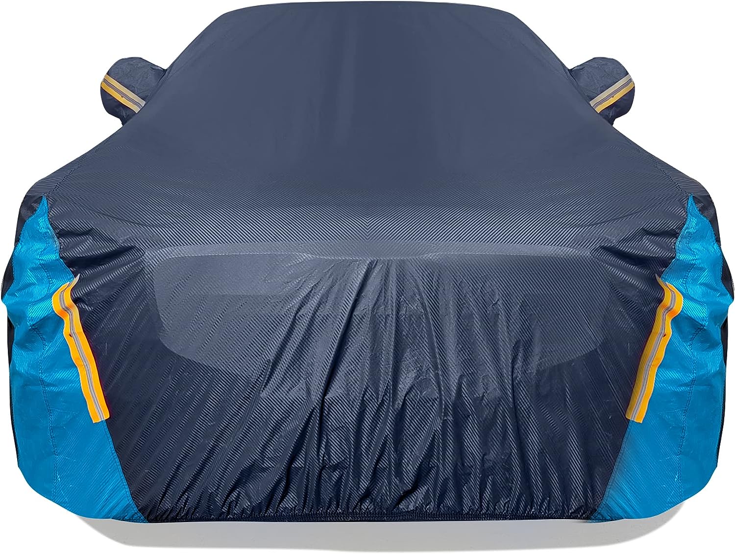 • 🚗【Multilayer Material】The car cover waterproof all weather is made of advanced materials with 6 layers of aluminum film, including non-woven fabric, PE, EVA and soft lining. These exterior materials are 100% waterproof. The highly reflective aluminum film has a good UV protection function. The reinforced aluminum film is used as a whole, so it will be more flexible and durable than other materials