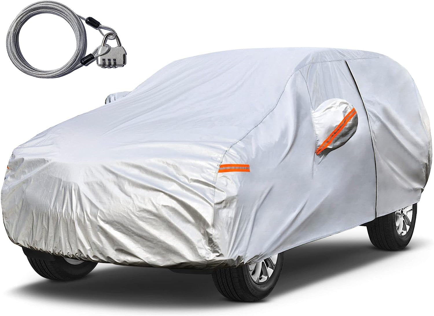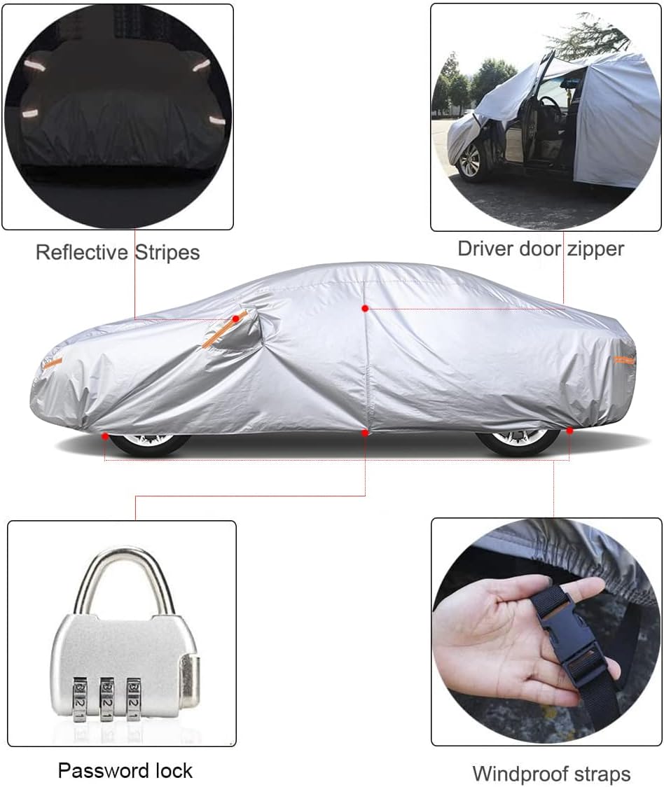 • 【 Product Details 】- 1) Kayme vehicle covered with a lock, Anti-theft. 2) Driver door zipper for easy access. 3) Windproof straps to protect your cover are not blown away by heavy wind. 4) Reflective strips, remind others at night. 5) Mirror pocket.