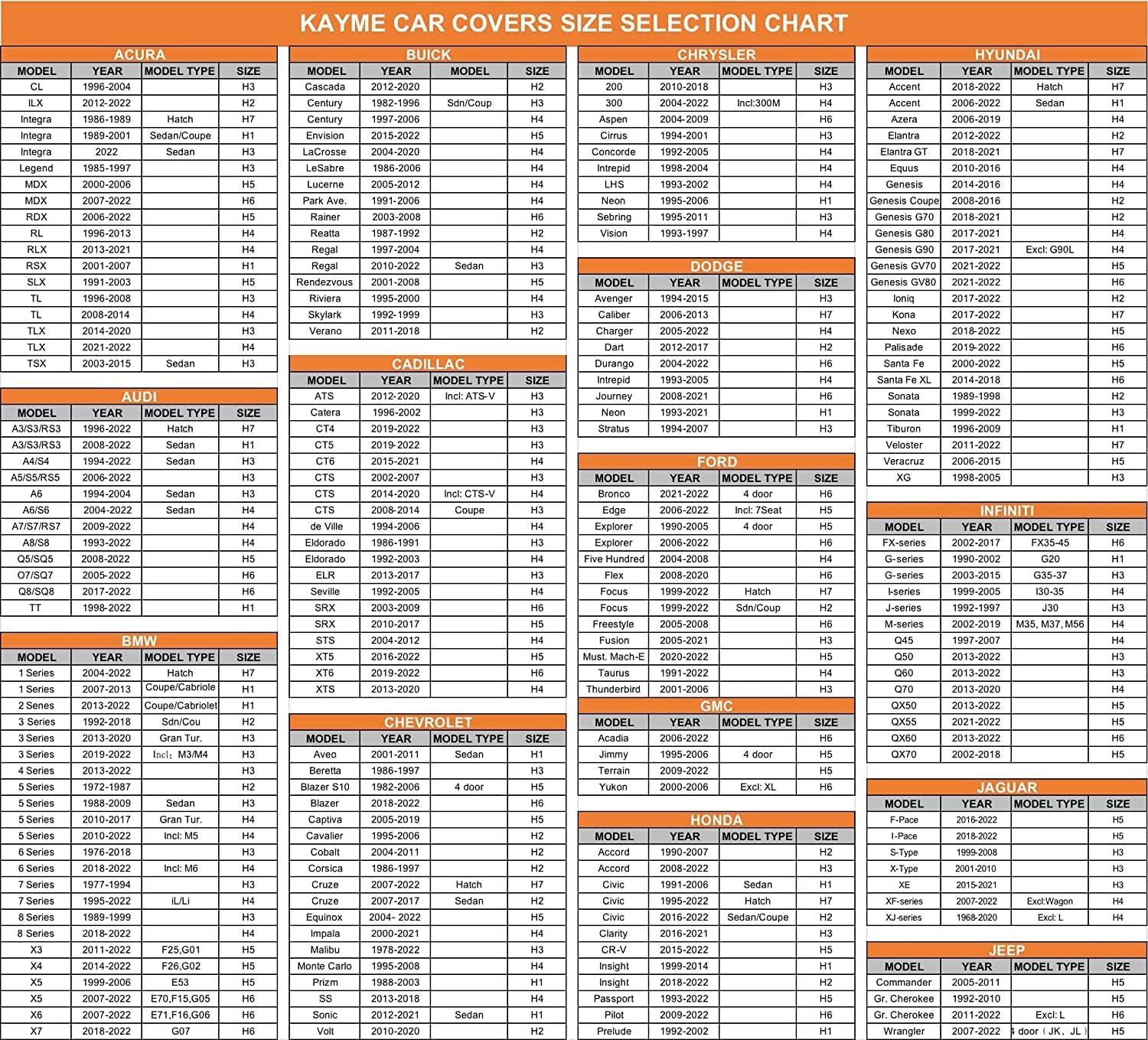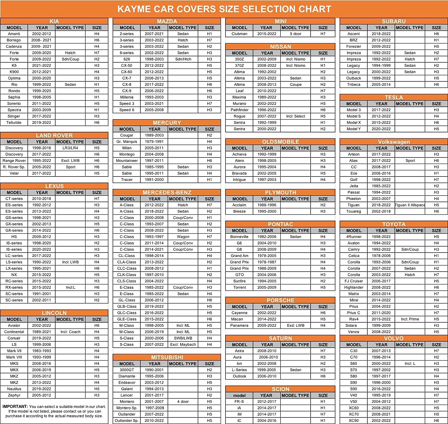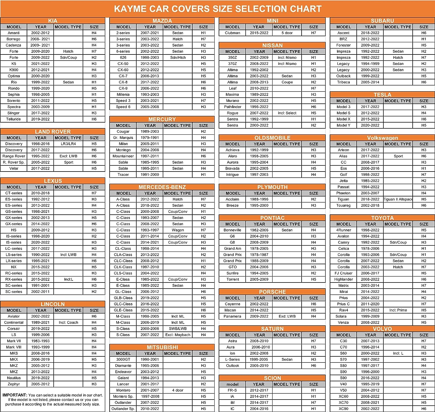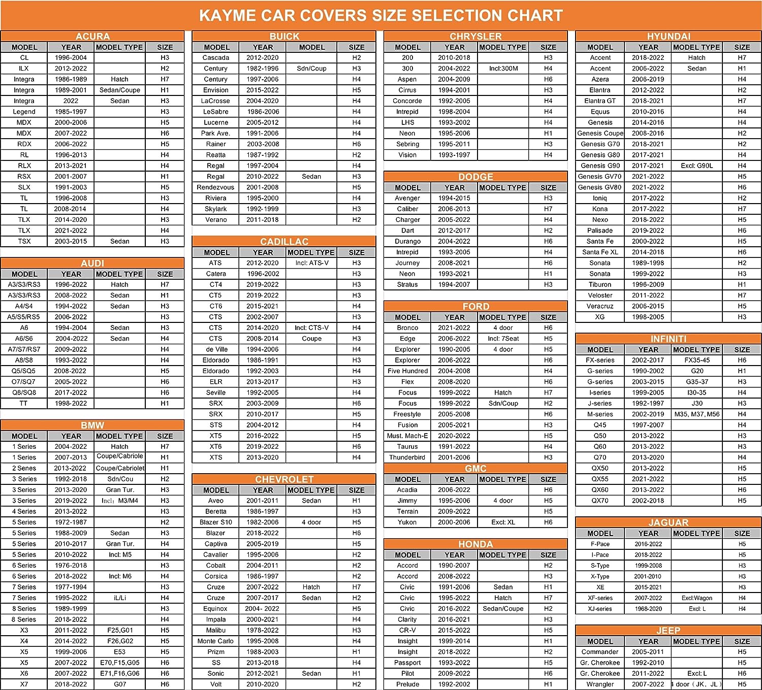 • 【 Product Function 】— Kayme Car Cover adopts prime material to achieve the best effect for Waterproof/ Windproof/ Dustproof/ Scratch Resistant .Outdoor Sun UV industrial pollutants snow corrosion bird droppings Protection to protect the car better.