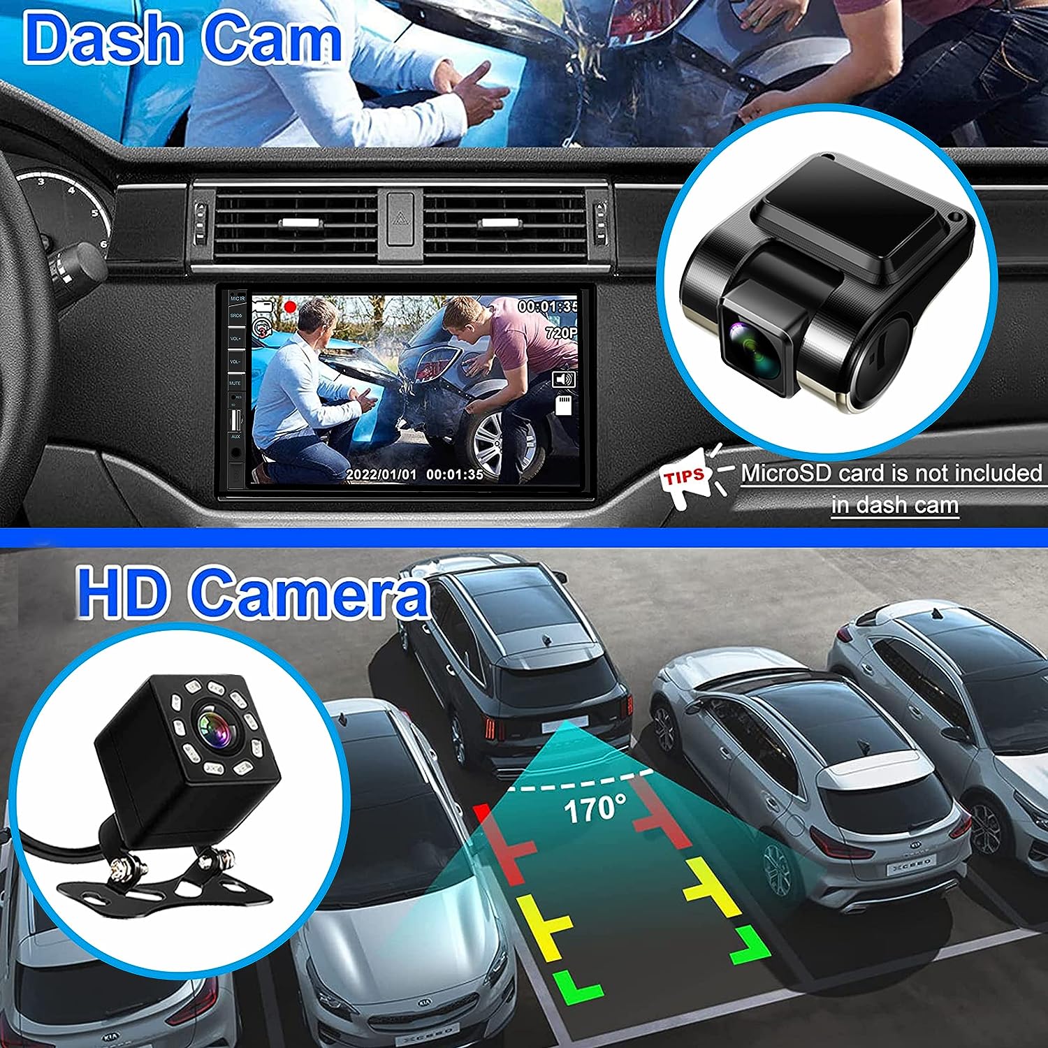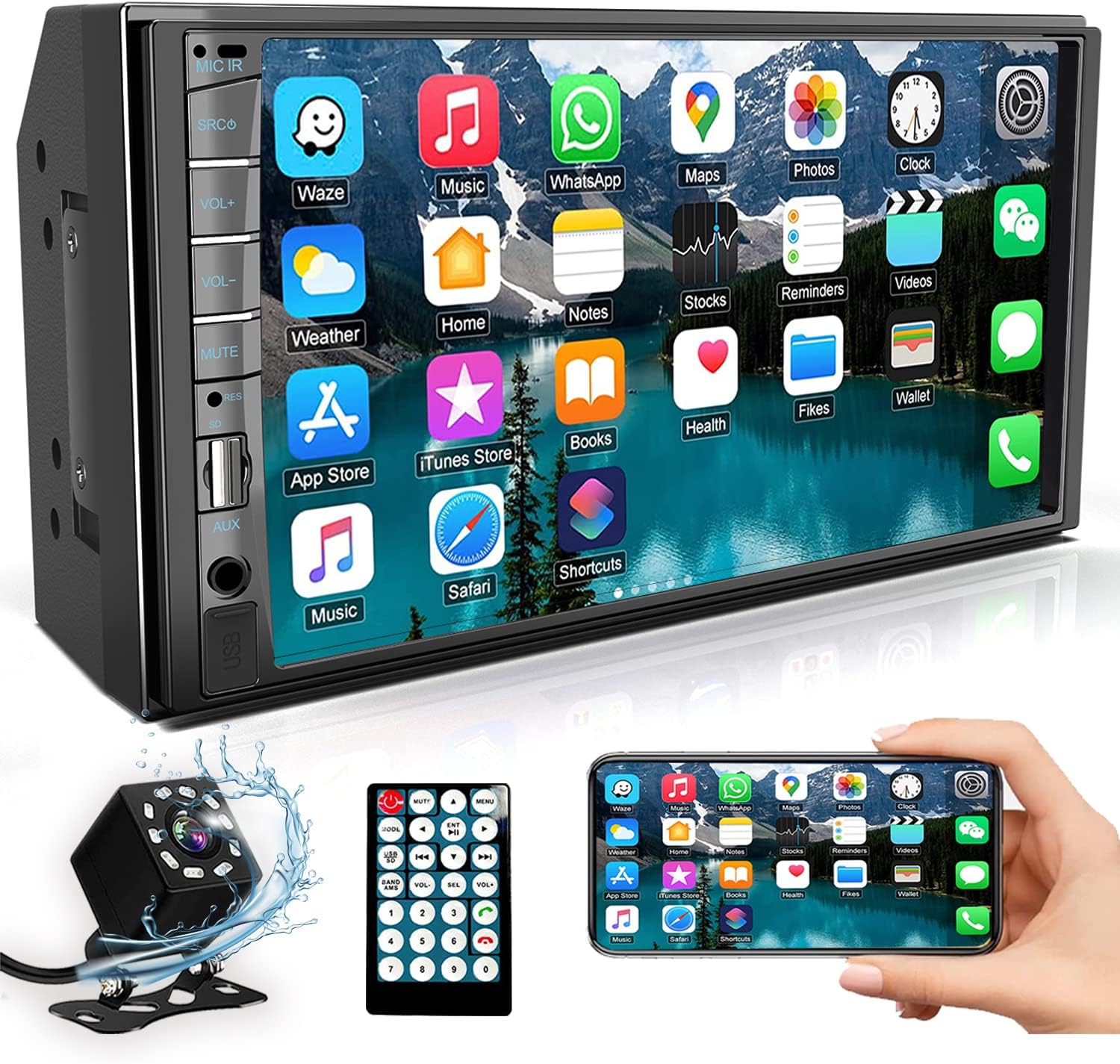 • 【HD Rear View Backup Camera】:This 2 din car radio with apple carplay comes with a free rear view camera supporting HD night vision, ultra-wide viewing angle of 170 ° and a fully waterproof design, automatic switching of video input signal when reversing, reverse assist allows you to reverse more safely, helping driver time-efficient.