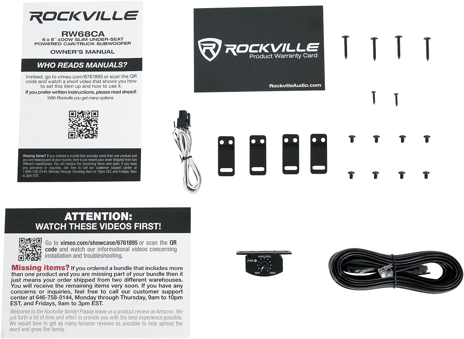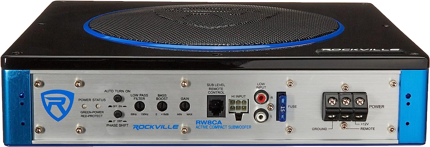 Rockville RW10CA 10" 800 Watts Peak/200 Watts RMS Slim Powered/Active Sealed Car Subwoofer With Bass Remote. Amplifier will not power up: Check to make sure you have a good ground connection, check that the Remote Input (Turn-On) has at least 5VDC, check that there is battery power on the (+) terminal, check that there is at least 12v, check all fuse, replace if necessary, make sure that the Protection LED not illuminated. If it is lit, shut off the amplifier briefly, and then repower it.
