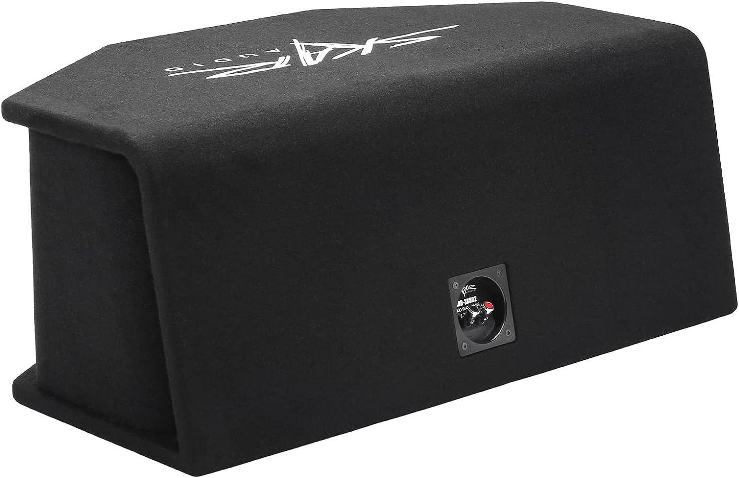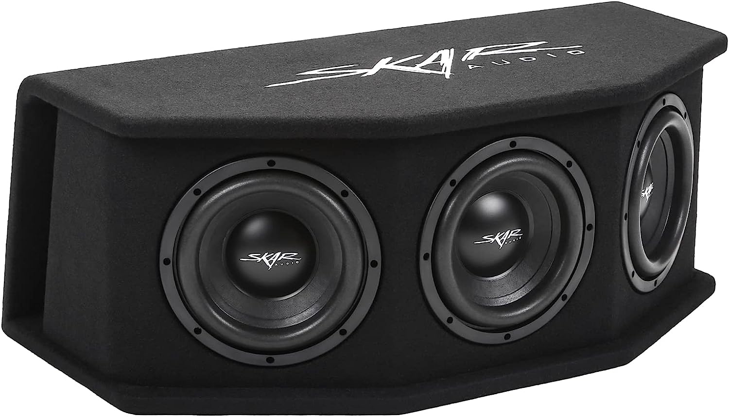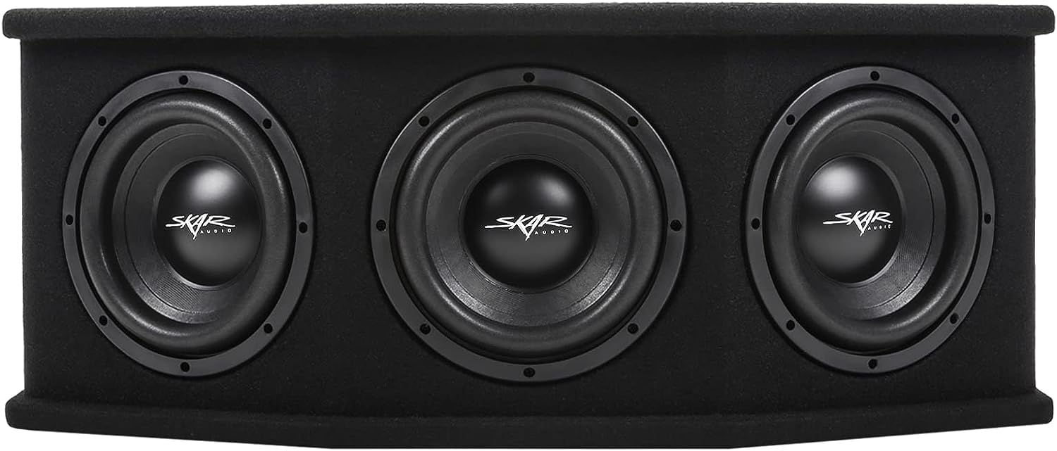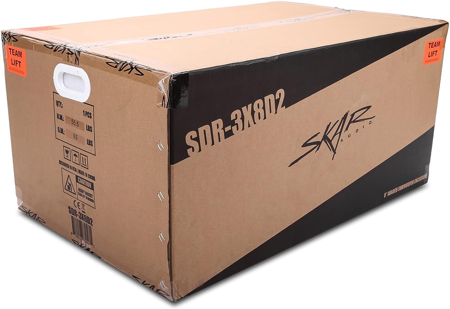 Skar Audio introduces the SDR-3X8D2 triple 8-inch loaded vented subwoofer enclosure for those seeking extreme bass output in their car audio system but who are limited by space in their vehicle. Featuring three of the Skar Audio SDR-8 700 Watt dual 2-ohm subwoofers, this 2, 100 Watt max power loaded enclosure was engineered to get loud and low. Achieve head turning levels of bass output with this loaded enclosure and let size and space limitations be a thing of the past. The three dual 2-ohm subwoofers come pre-loaded and wired up inside of this custom triple 8" ported enclosure with a final impedance load of 1. 33-ohms to a single speaker terminal cup located on the backside of the enclosure. This competition grade ported enclosure was designed for ultra responsive, low end frequency response, with all three drivers utilizing a single large shared chamber that shares two advanced slot ports located on opposites sides of the rear of the enclosure. We engineer our products to not only sound great, but to stand the test of time - which is why we construct this enclosure out of only the finest grade medium density fiberboard (MDF). Furthermore, the craftsmanship and build quality of this enclosure are world class and exemplified top to bottom. One such example of this being a double front baffle for enhanced strength that also doubles as a design enhancement allowing the subwoofers to be mounted with a flush finish. Finally, the loaded enclosure is finished in a premium black carpeting that features the Skar Audio logo centered across the top surface of the box. Peak Power: 2, 100 Watts, RMS Power: 1, 050 Watts.