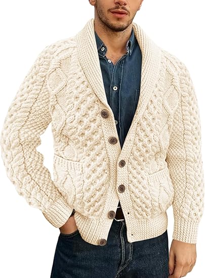 Runcati Mens Cable Knit Cardigan Sweater Oversized Long Sleeve Shawl Collar Sweaters with Pockets
