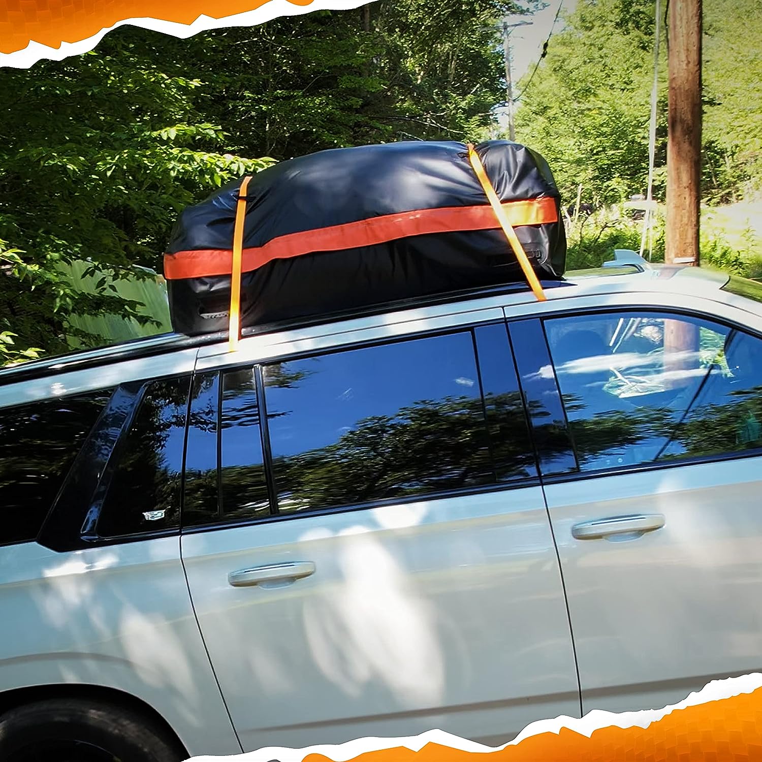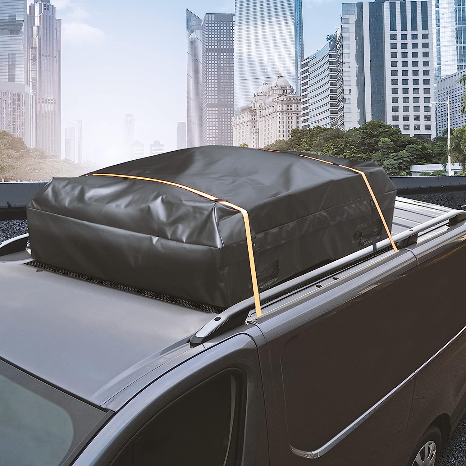 • 𝗛𝗲𝗮𝘃𝘆 𝗱𝘂𝘁𝘆 𝗮𝗯𝗿𝗮𝘀𝗶𝗼𝗻 𝗿𝗲𝘀𝗶𝘀𝘁𝗮𝗻𝘁 𝘃𝗶𝗻𝘆𝗹: Cargo carrier for top of vehicle bags are made from heavy duty abrasion resistant vinyl and offers the best weather protection for even extreme conditions and elements such as wind, sun, rain, snow, or sand the car tops carrier storage bag is 100% waterproof not just water resistant to ensure your stuff stays nice and dry during your drive.