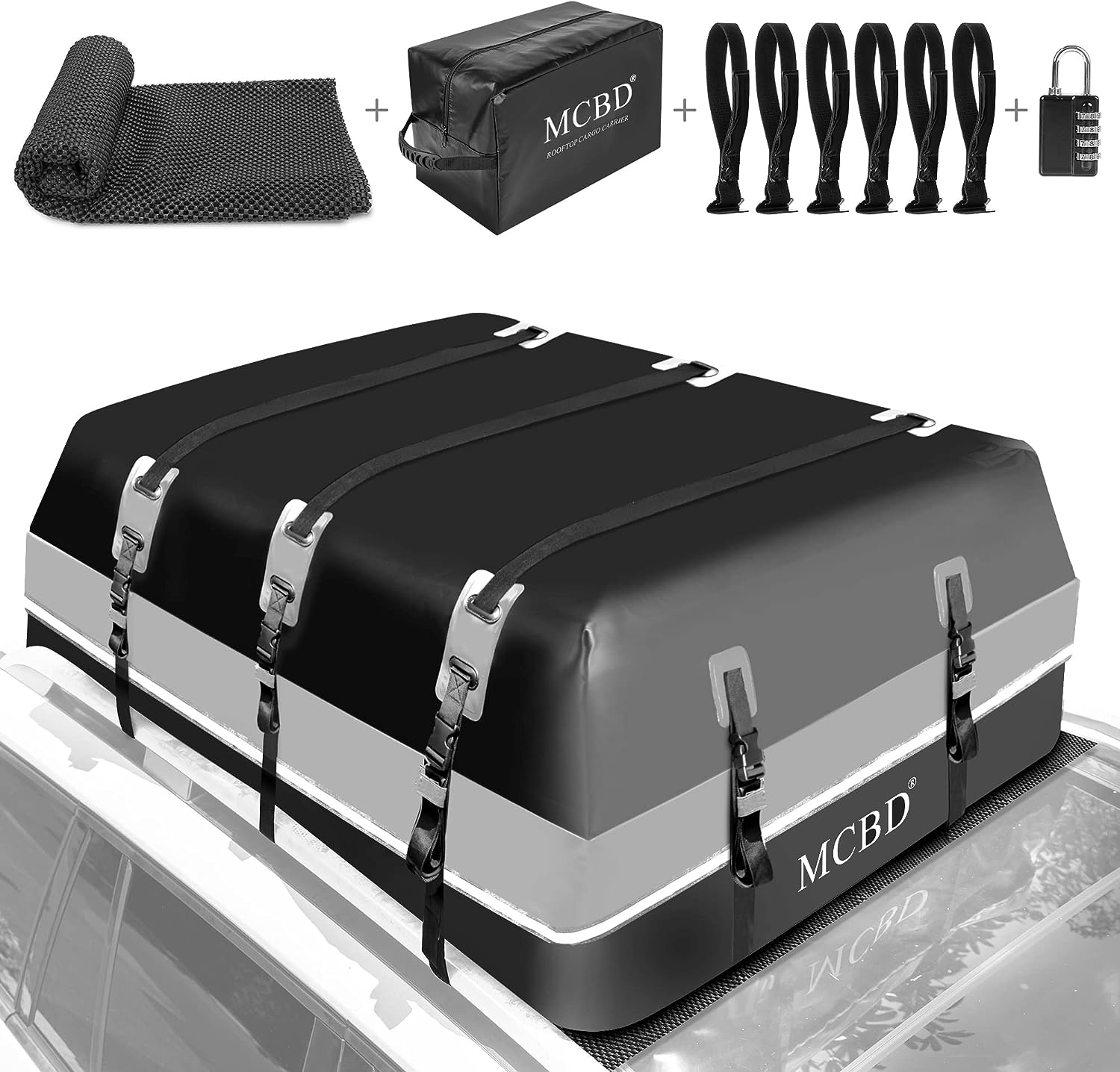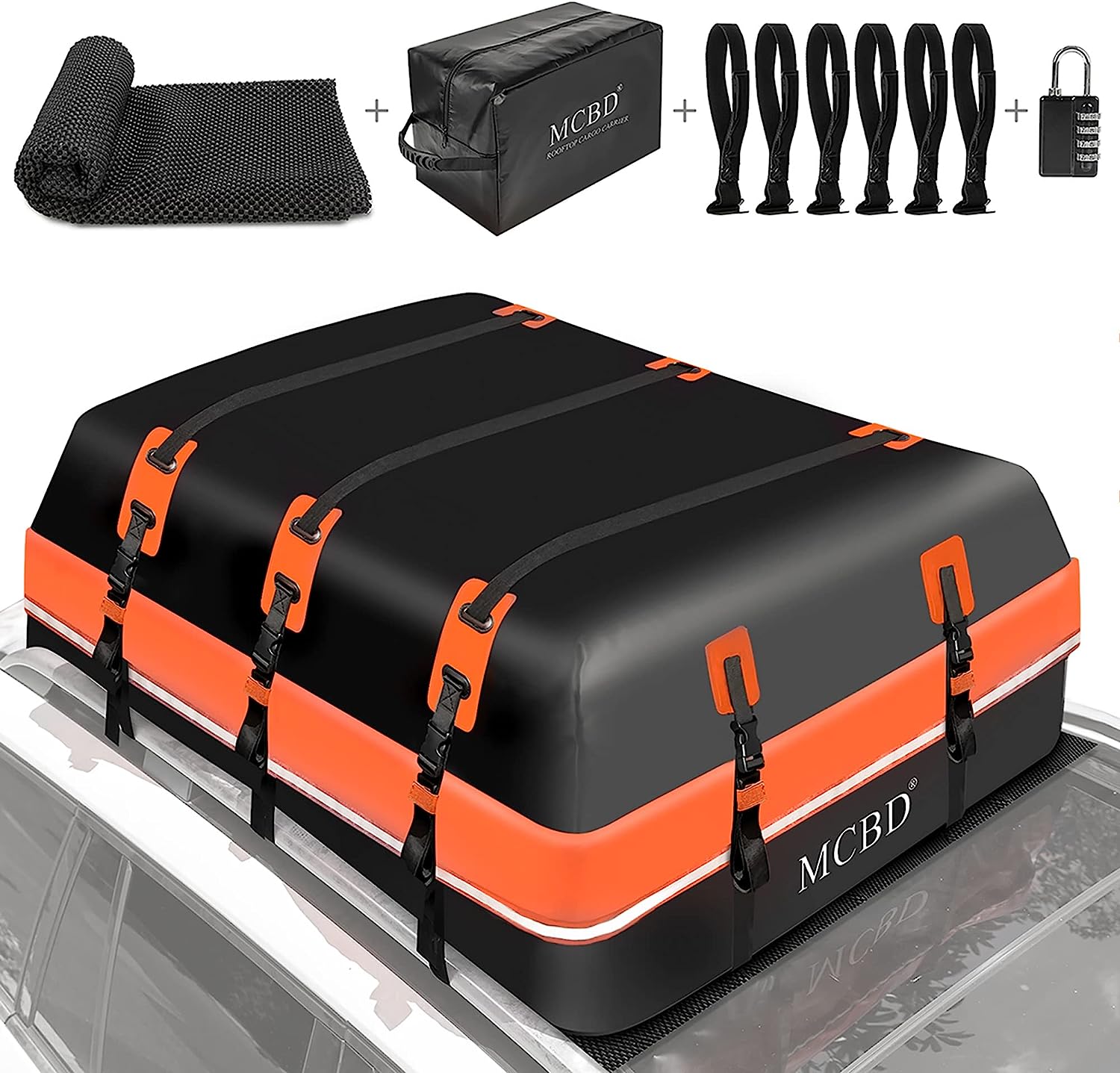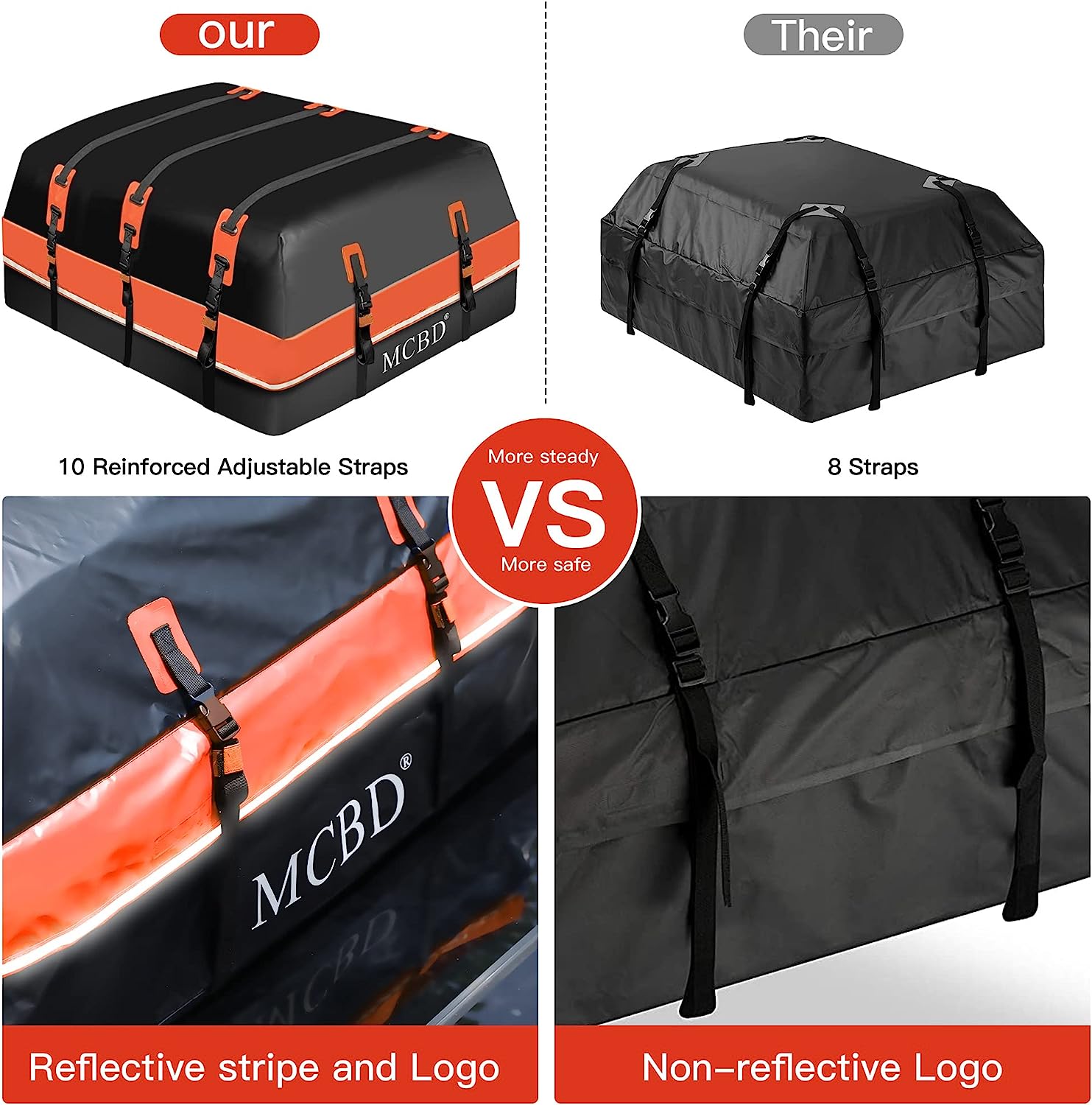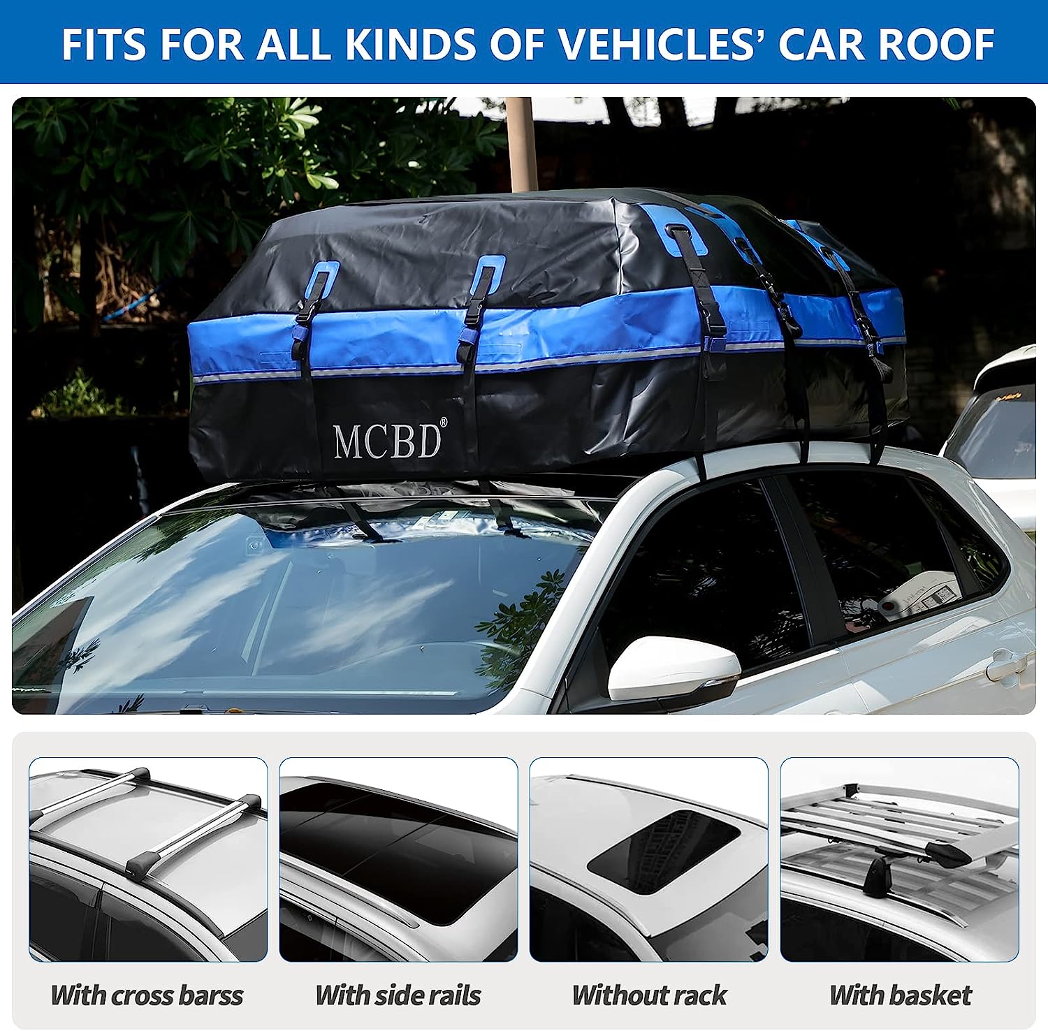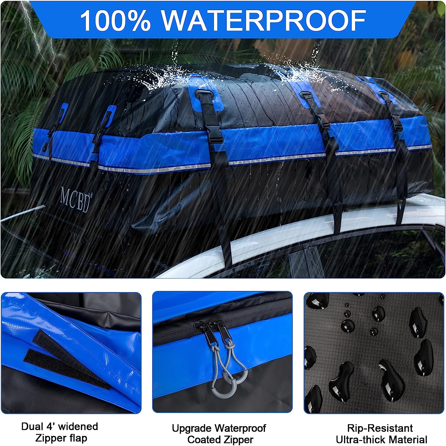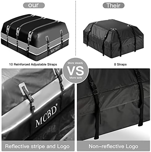 • 🚗UPGRADED WATERPROOF ZIP: We notice that the straps of other cargo bags can easily rip from the seam, so the MCBD roof bag doubly reinforced the strap seam. And all seams of this cargo bag are heat welded and stitched to ensure they are watertight. 100% Waterproof, waterproof zipper with 6 inches extra wide velcro zipper flaps. It provides perfect weather protection even in extreme conditions such as wind, sun, rain, snow, and sand.