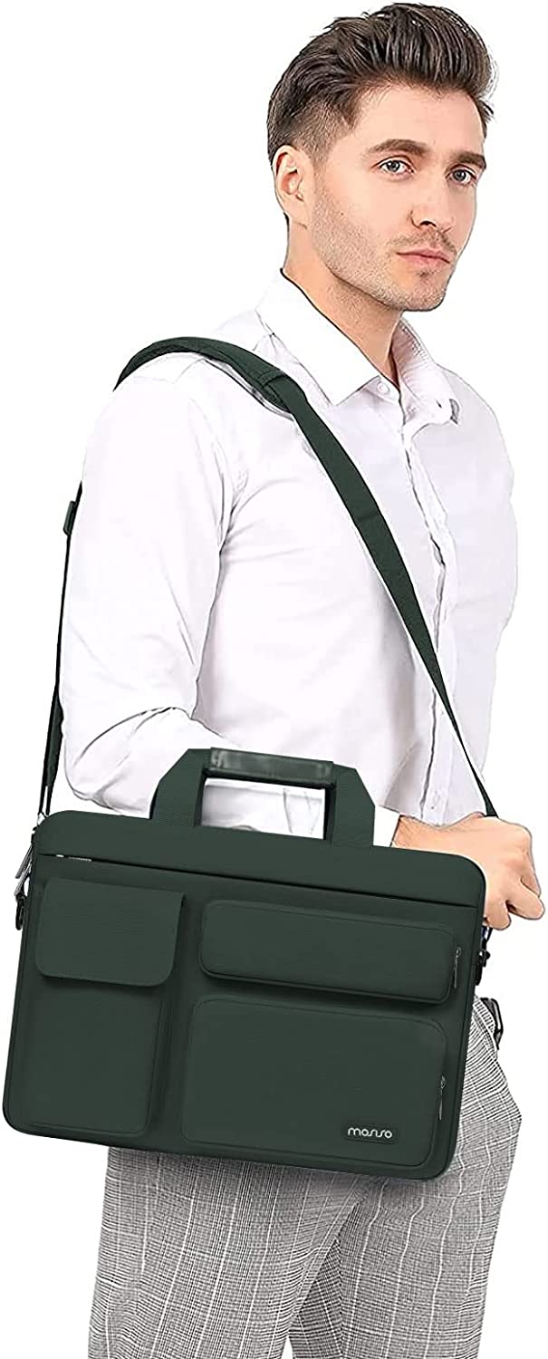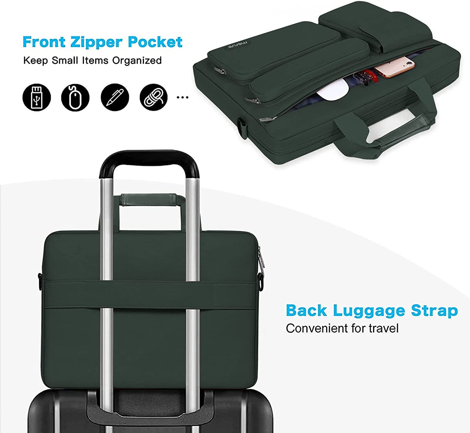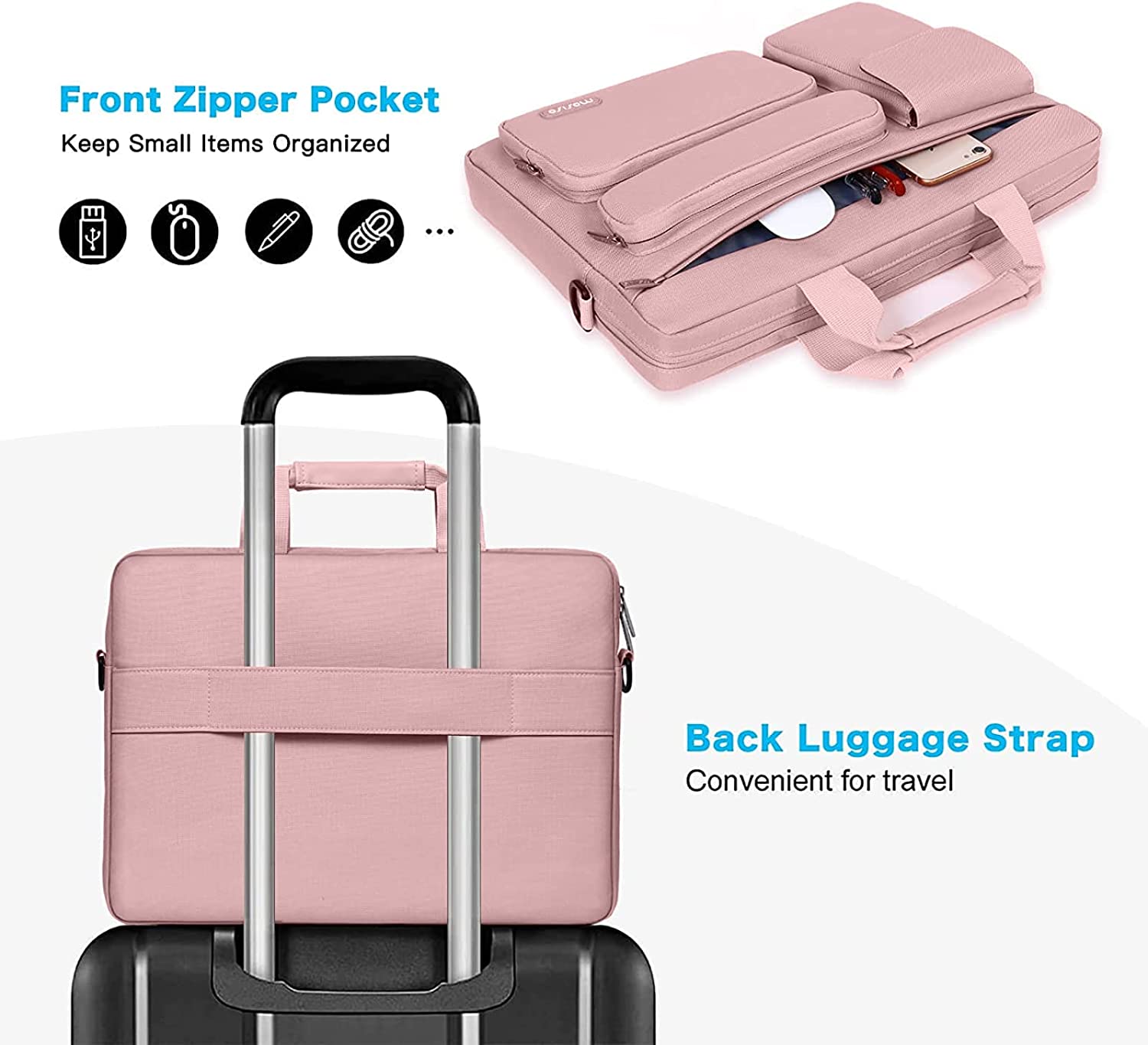 • The main inner compartment holds your laptop and other important things. 2 raised & 1 flapover & 1 horizontal pockets are convenient for quick-access and store cell phone, pen slots, wallet, keys and other small items. Multifuncional 4 front pockets design laptop shoulder bag enables you to carry your laptop/notebook/ultrabook computer in a uniquely sleek style.