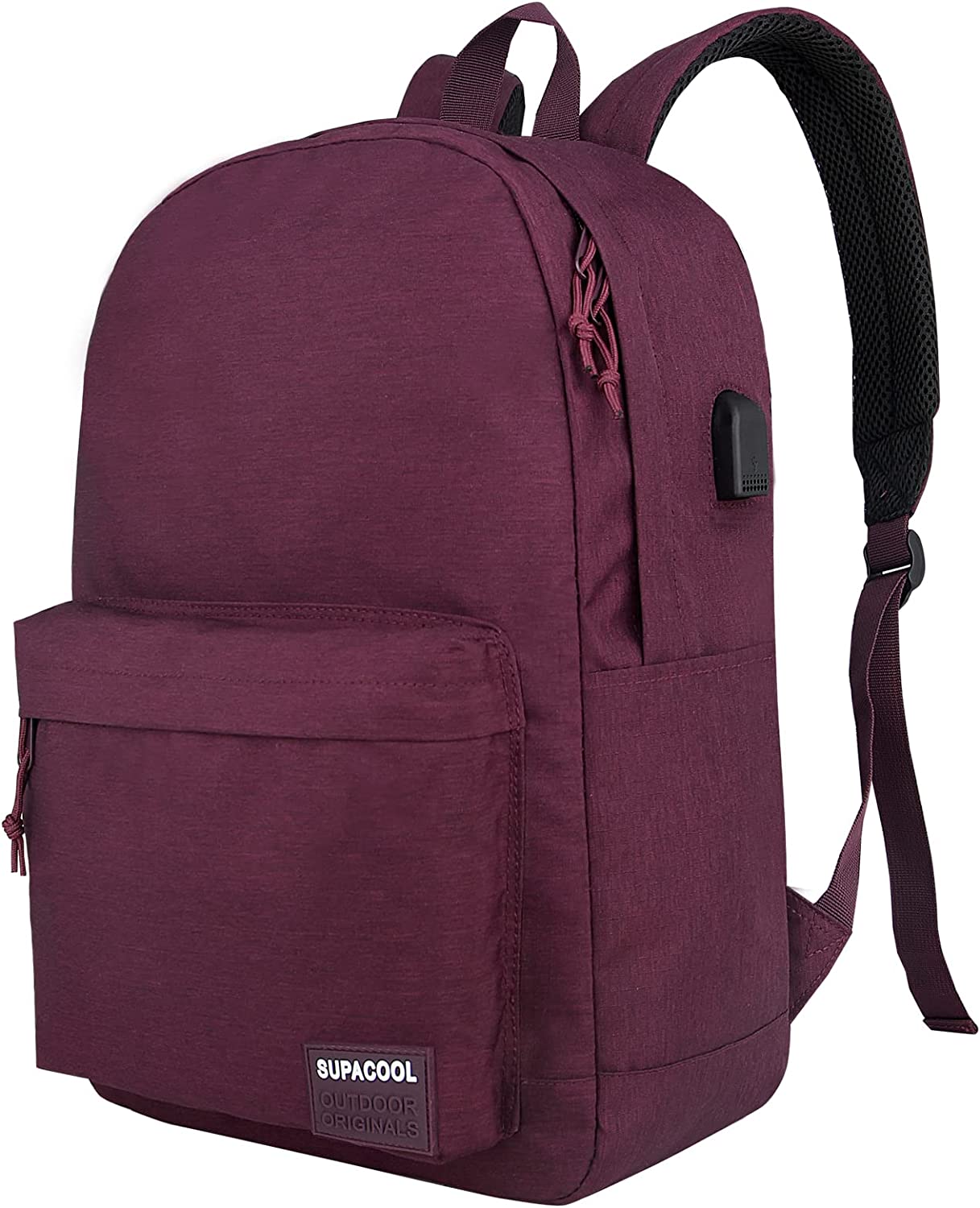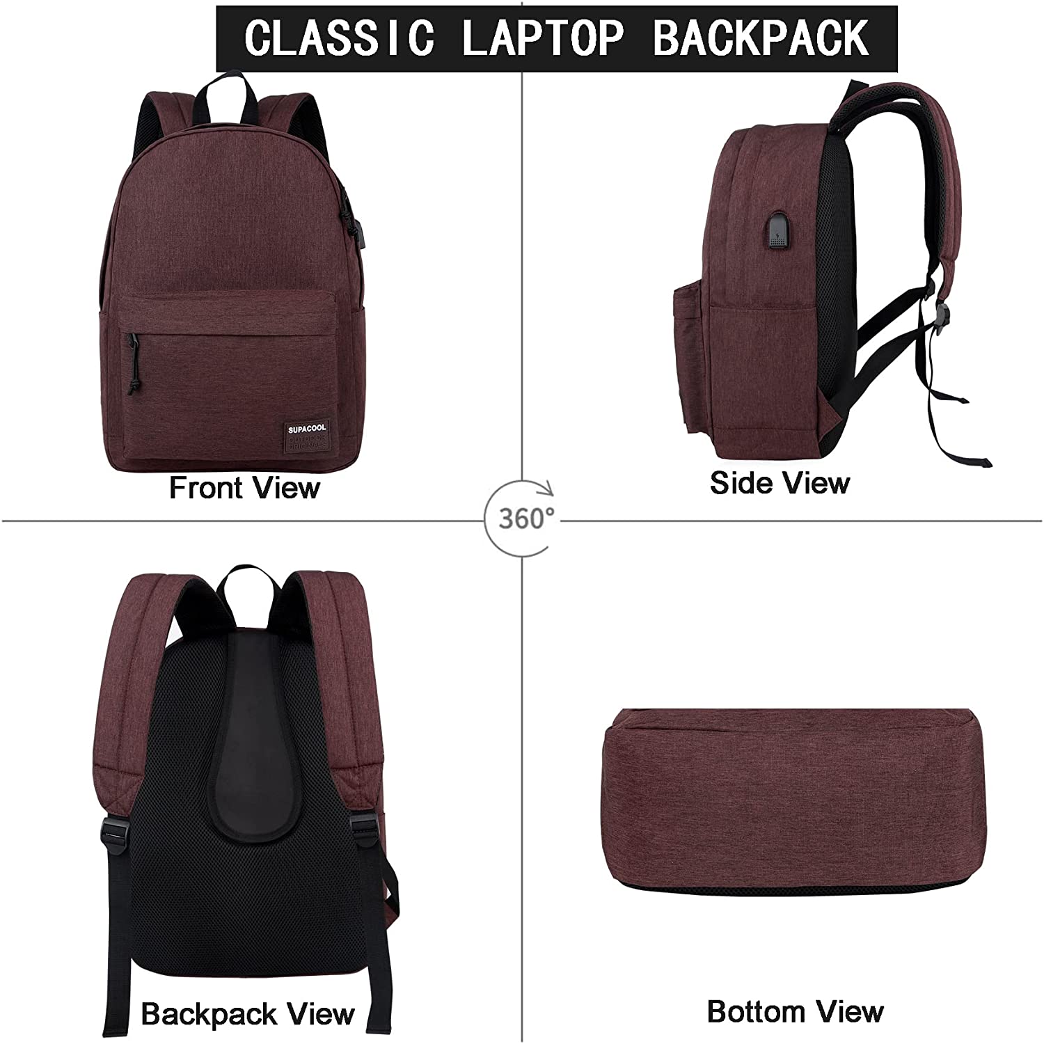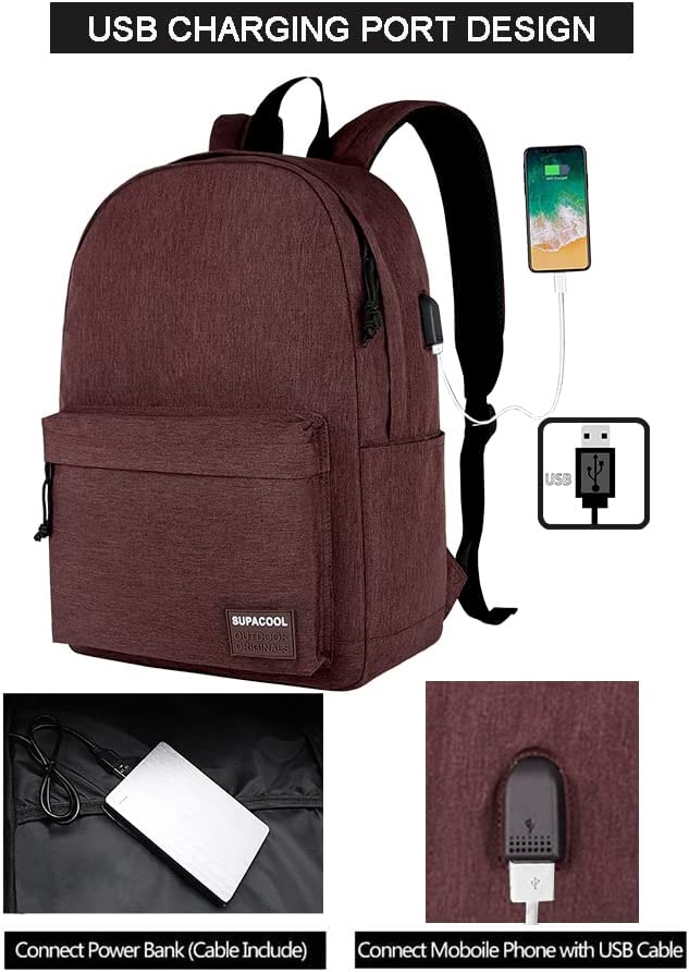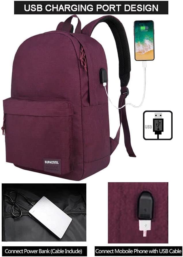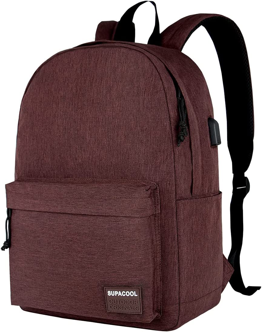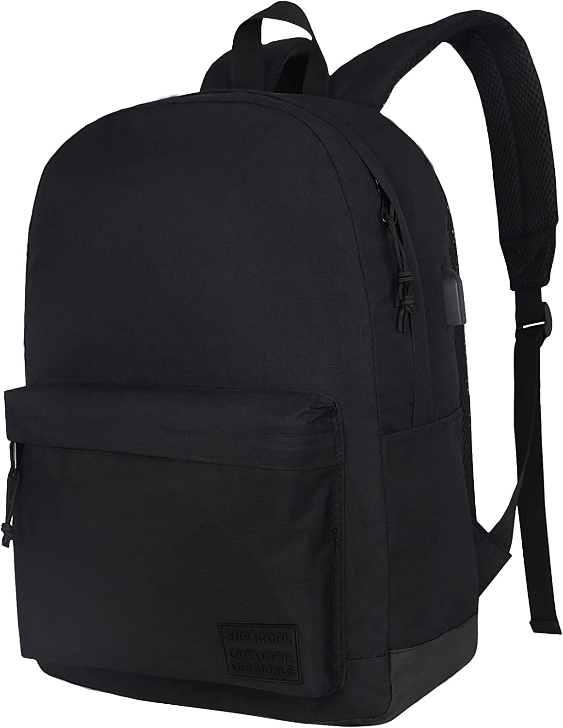 SUPACOOL Lightweight Casual Laptop Backpack with USB Charging Port For for Men and Women, School Bookbag for College (Full Black)