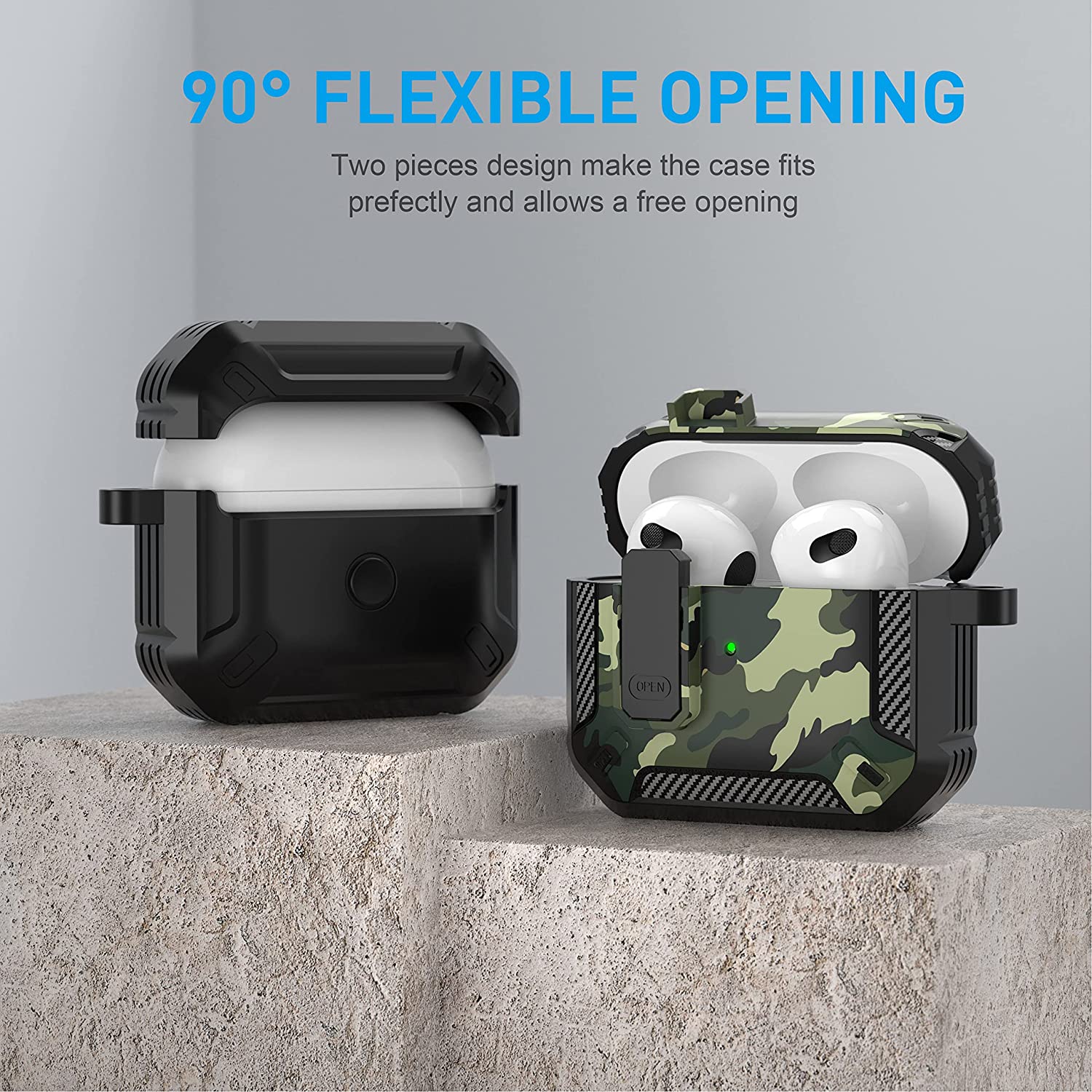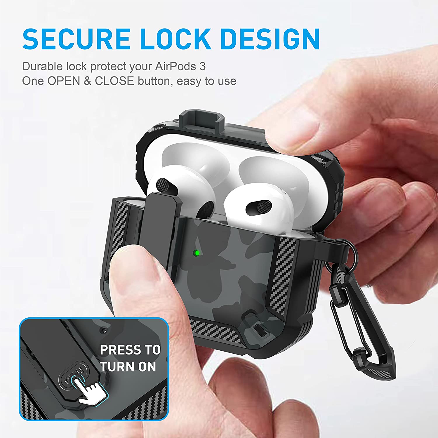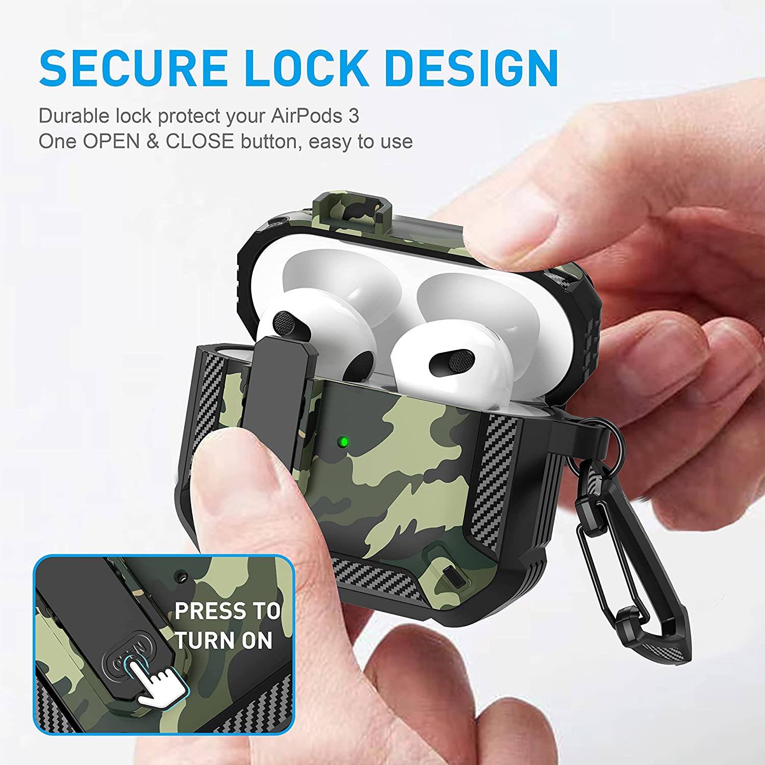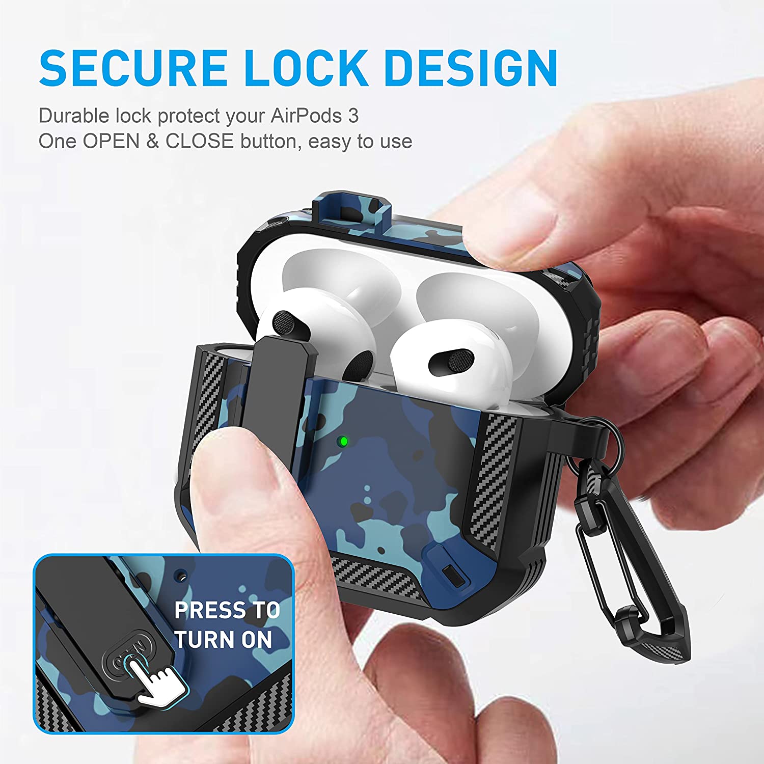 • 【Military AirPods 3 Cover with Secure Lock】 Military shockproof Airpods 3 cover made of TPU and PC materials to makes the AirPods 3 case anti-shock, anti-slip and anti-fingerprint. Secure lock design, easy to open and close top cover with the open button