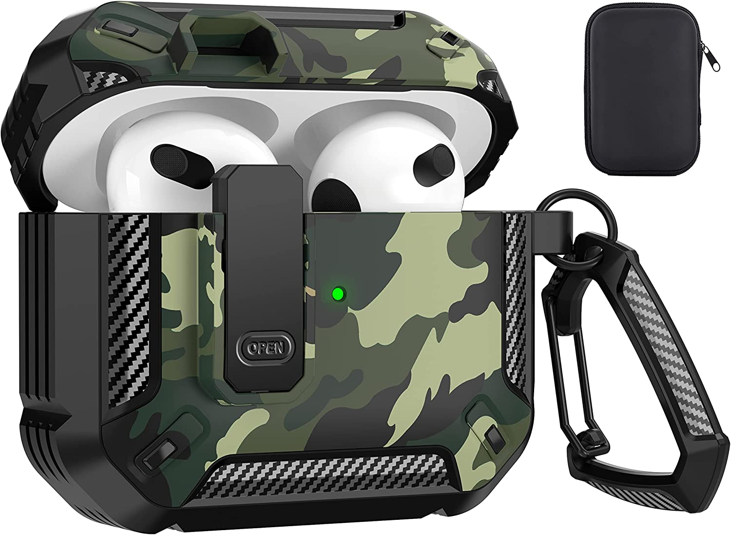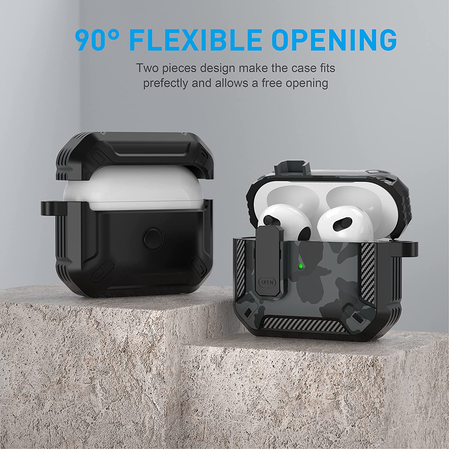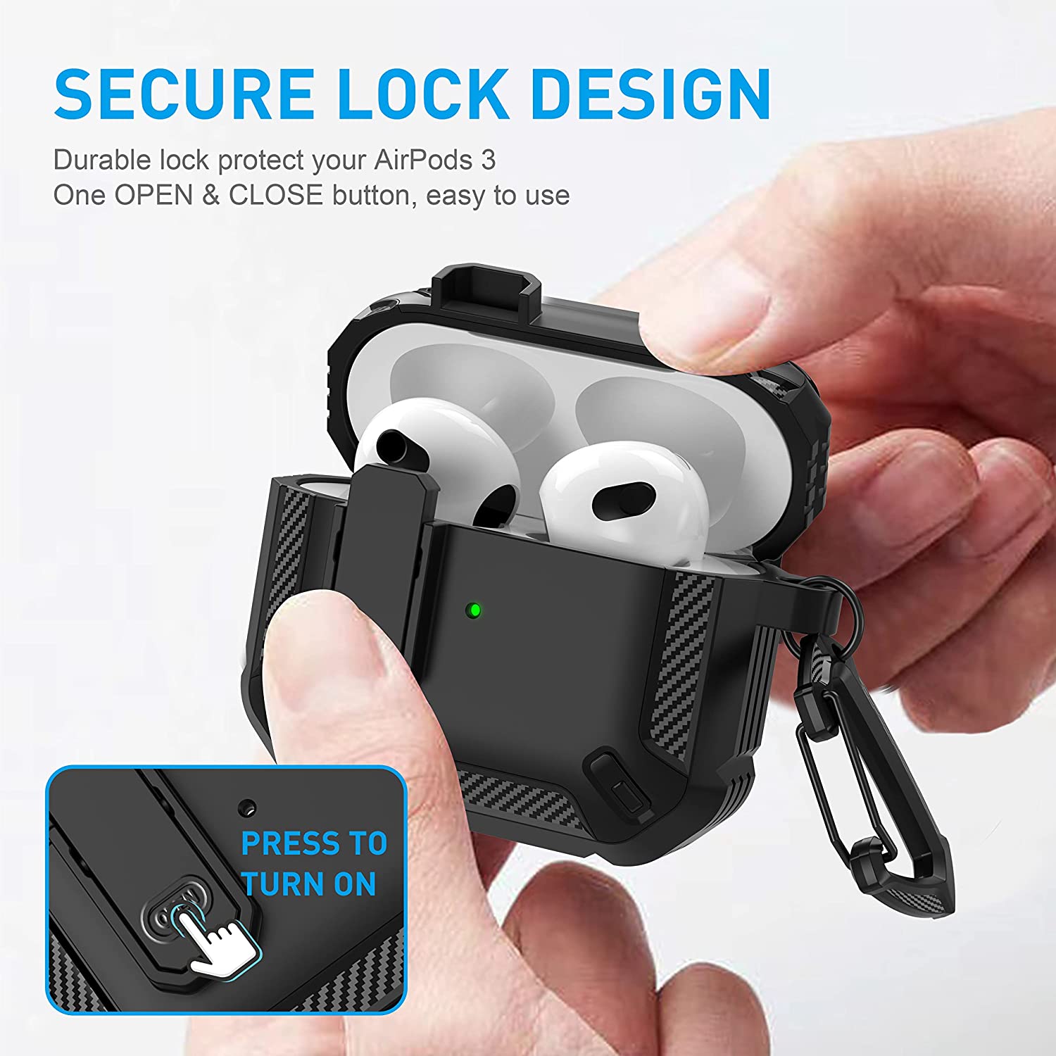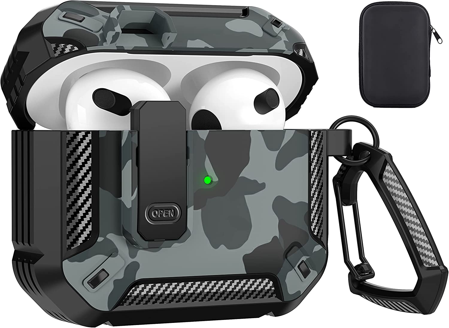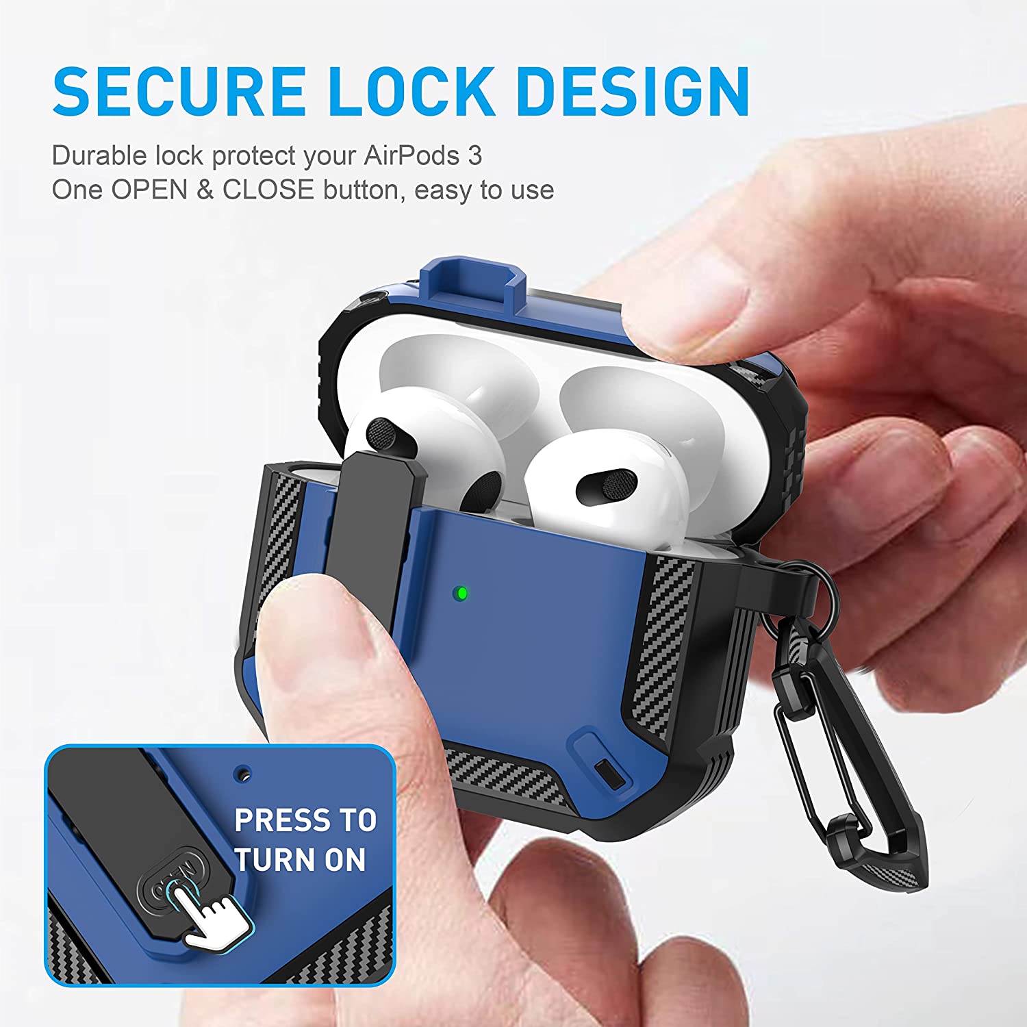 • 【Military AirPods 3 Cover with Secure Lock】 Military shockproof Airpods 3 cover made of TPU and PC materials to makes the AirPods 3 case anti-shock, anti-slip and anti-fingerprint. Secure lock design, easy to open and close top cover with the open button
