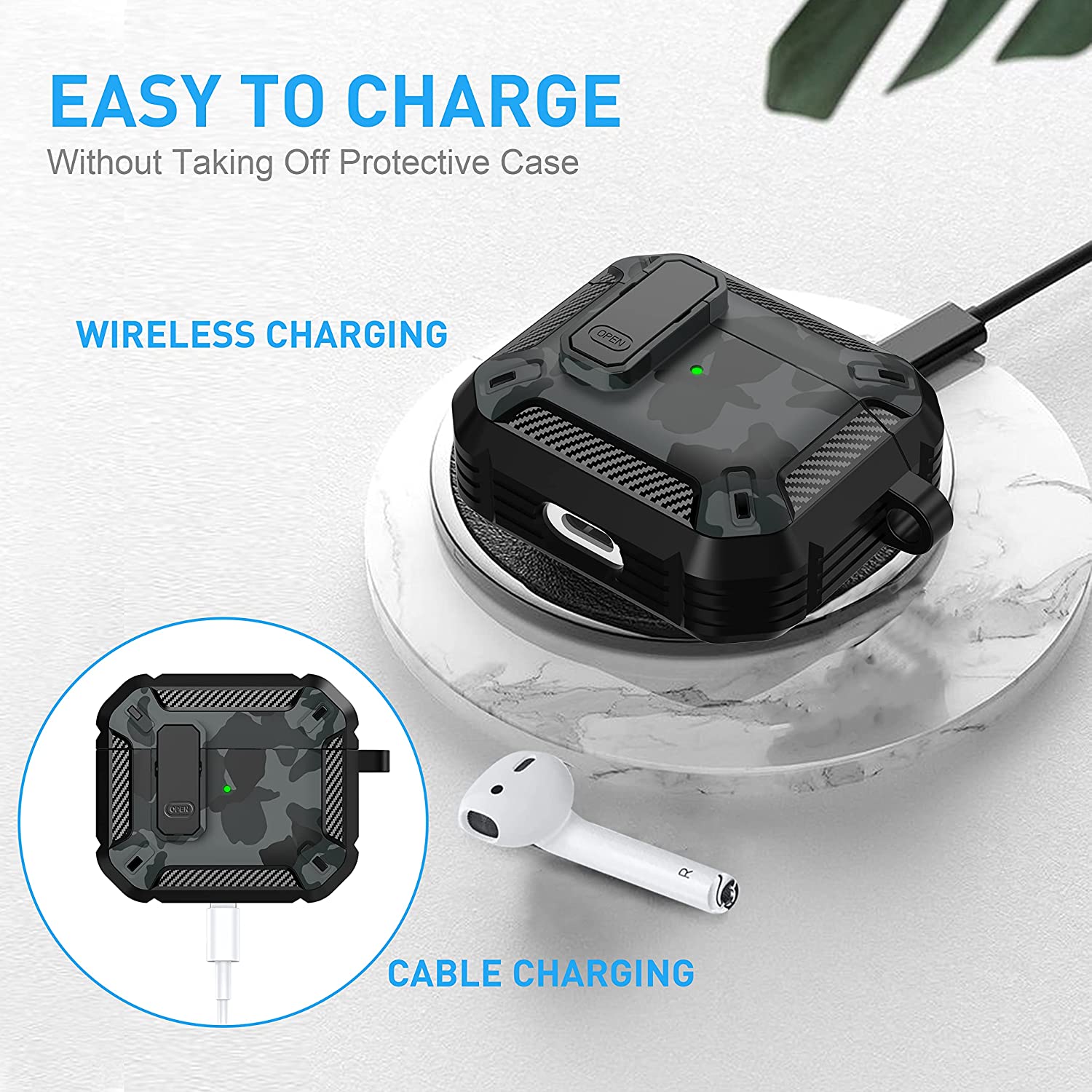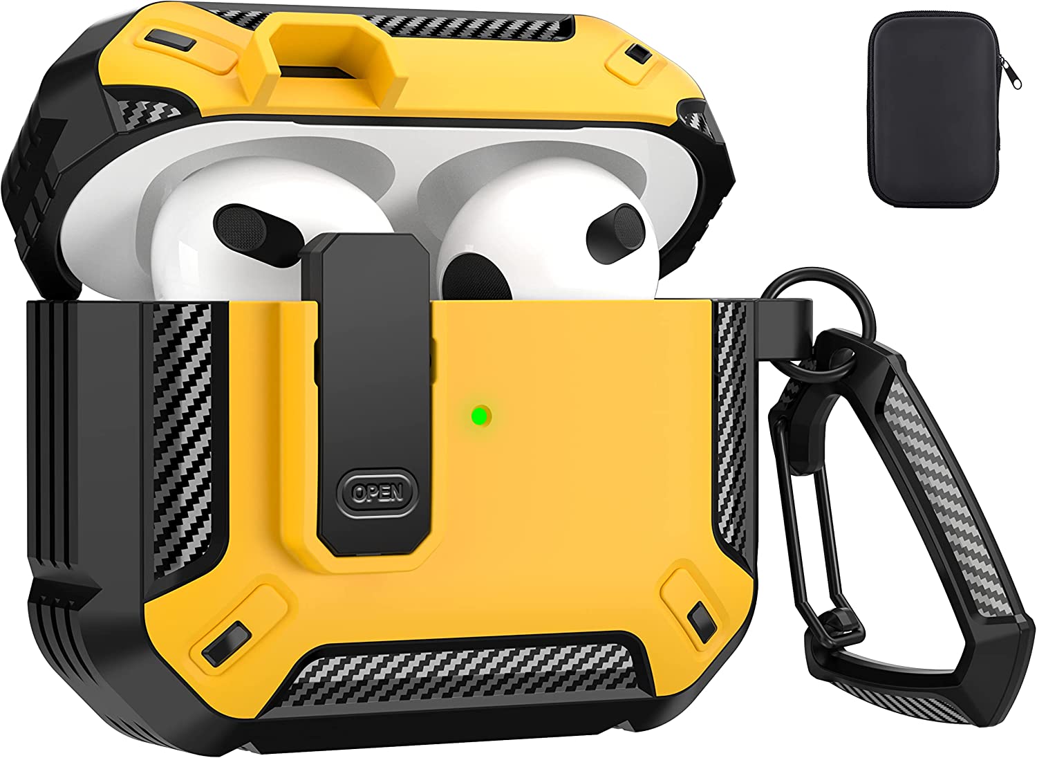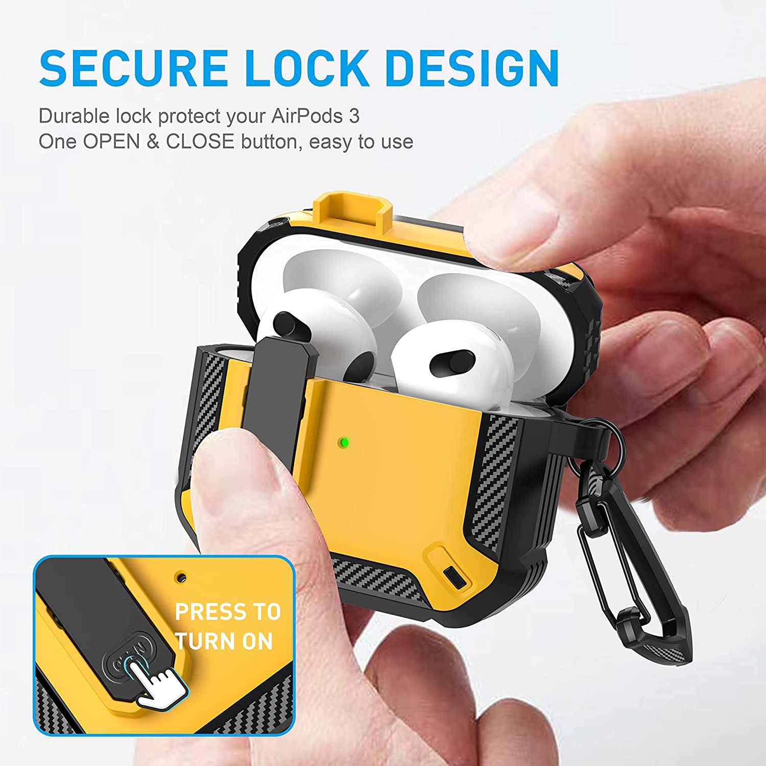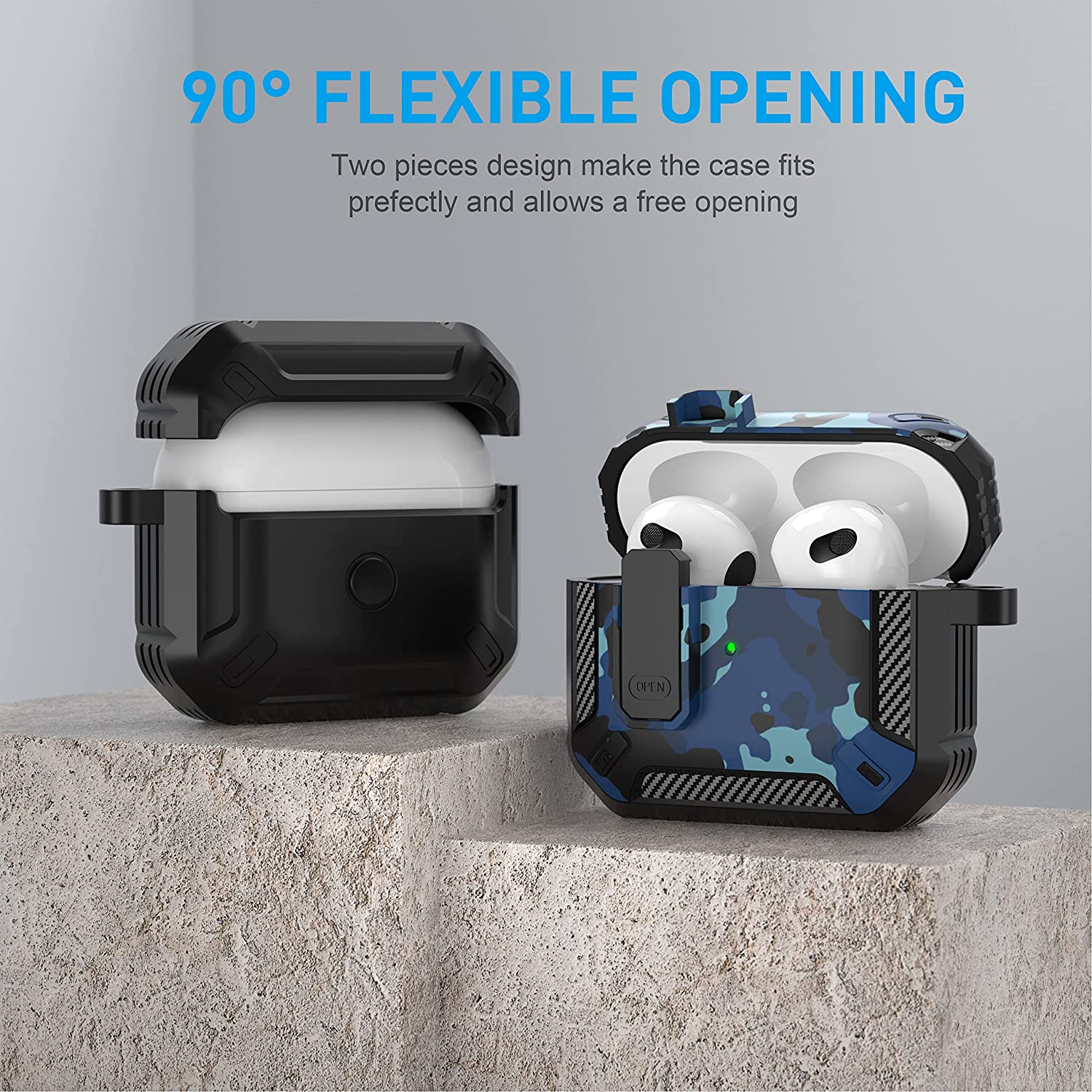 • 【Military AirPods 3 Cover with Secure Lock】 Military shockproof Airpods 3 cover made of TPU and PC materials to makes the AirPods 3 case anti-shock, anti-slip and anti-fingerprint. Secure lock design, easy to open and close top cover with the open button