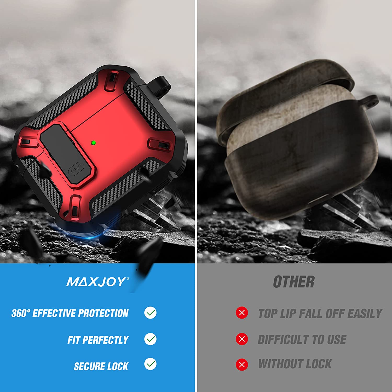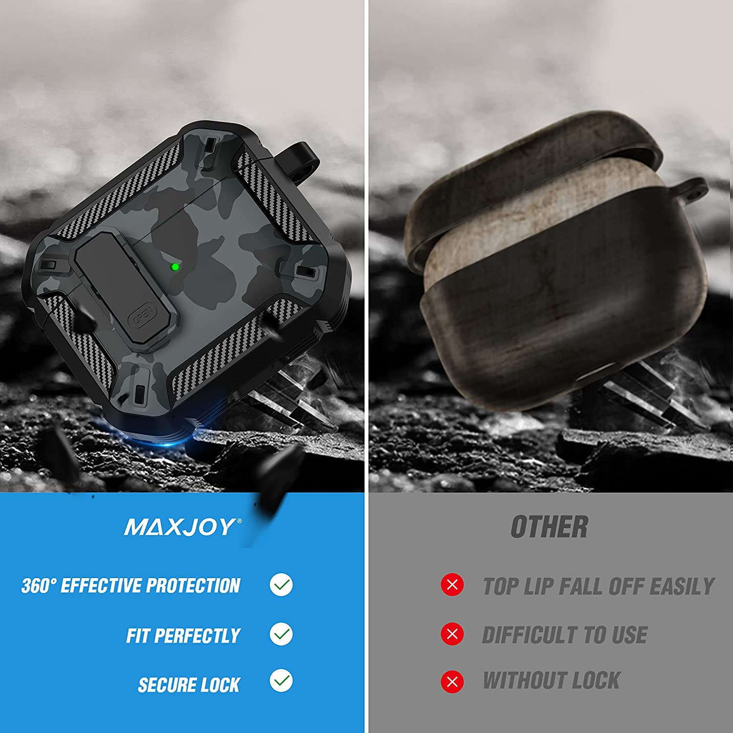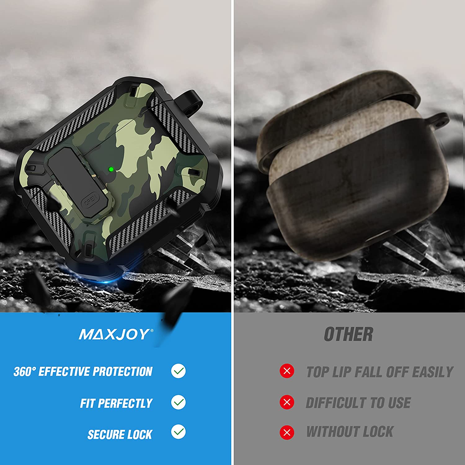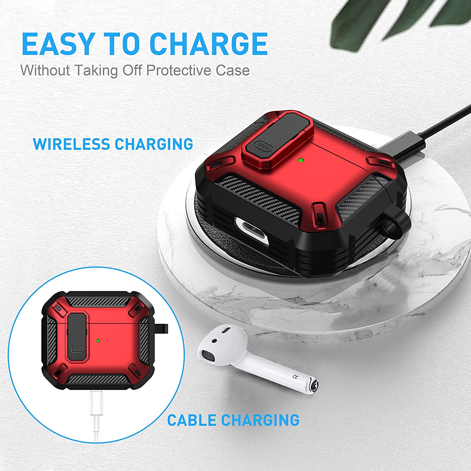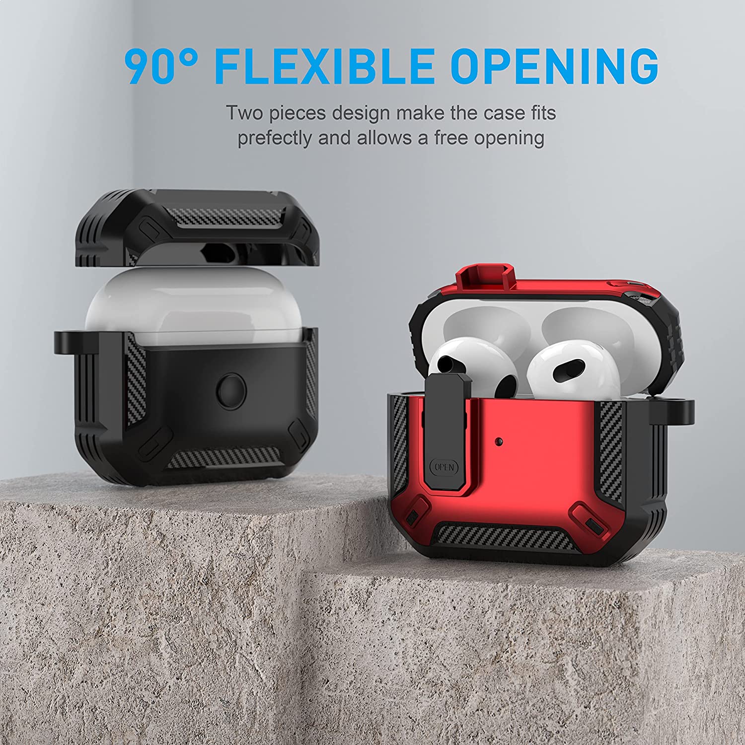 • 【Military AirPods 3 Cover with Secure Lock】 Military shockproof Airpods 3 cover made of TPU and PC materials to makes the AirPods 3 case anti-shock, anti-slip and anti-fingerprint. Secure lock design, easy to open and close top cover with the open button