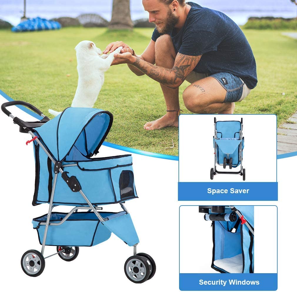 BestPet 3 Wheels Pet Stroller Dog Cat Cage Jogger Stroller for Medium Small Dogs Cats Travel Folding Carrier Waterproof Puppy Stroller with Cup Holder & Removable Liner,Blue