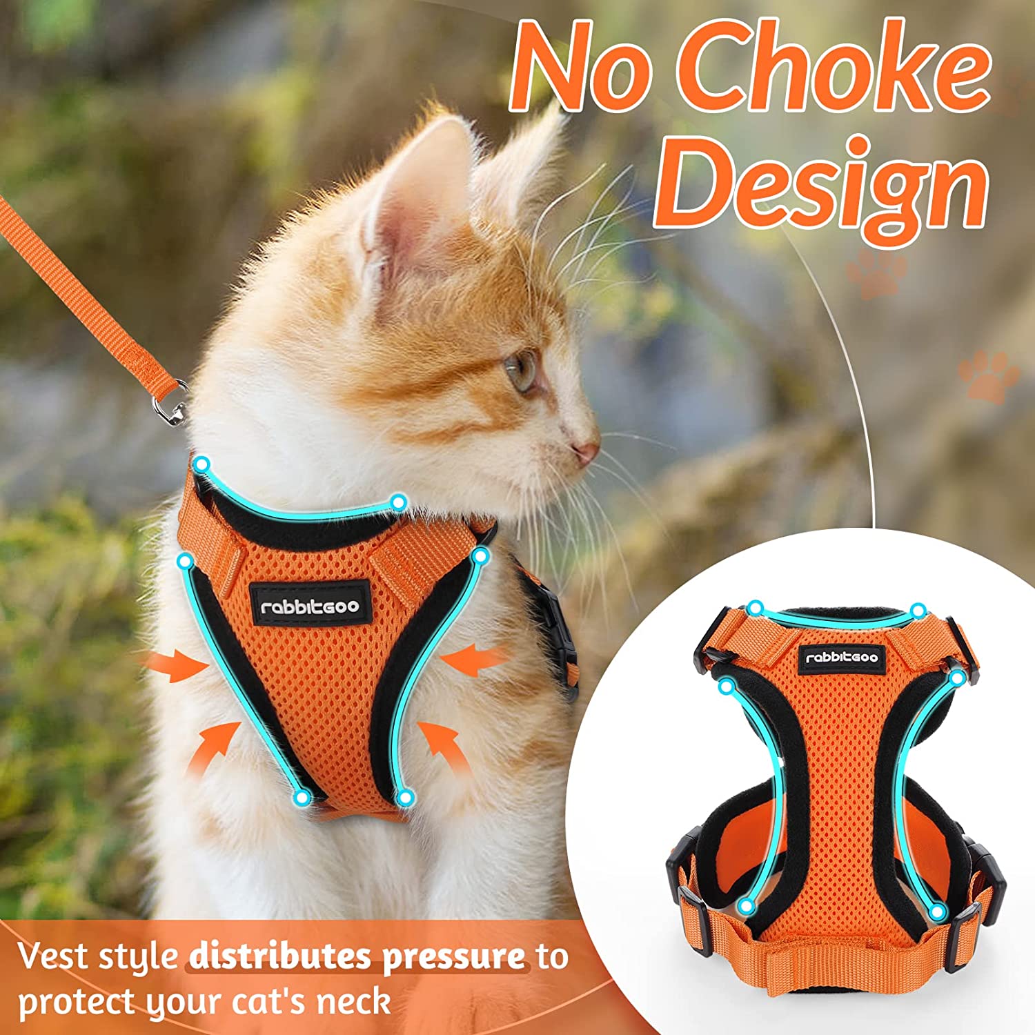 • Cat Safety Harness: You can attach the long, sturdy nylon leash to the metal leash clip on the back, allowing your kitty to explore the great nature safely and enjoyable. Its vest-style design can evenly distribute leash pressure across the chest and shoulder to prevent choking or neck strain, which is much safer and more comfortable than a basic halter or H-style harness. The reflective strips will keep your kitty always visible in dark environments
