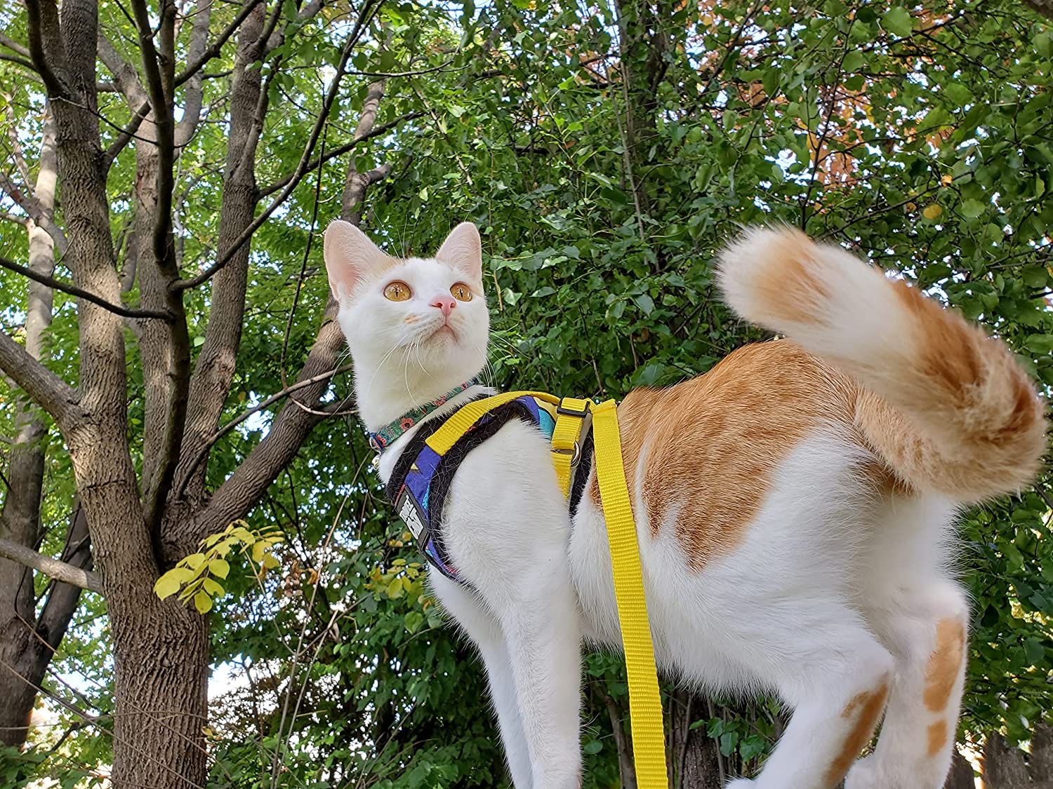 • PREMIUM SAFETY FEATURES: Our cat leash and harness set features reflective strip, which enables you and others to safely spot your fur baby even when it starts to get dark. As for the sturdy snap clip, it is constructed with premium quality metal alloy and features a 360-degree rotation that adjusts to your cat’s every move.