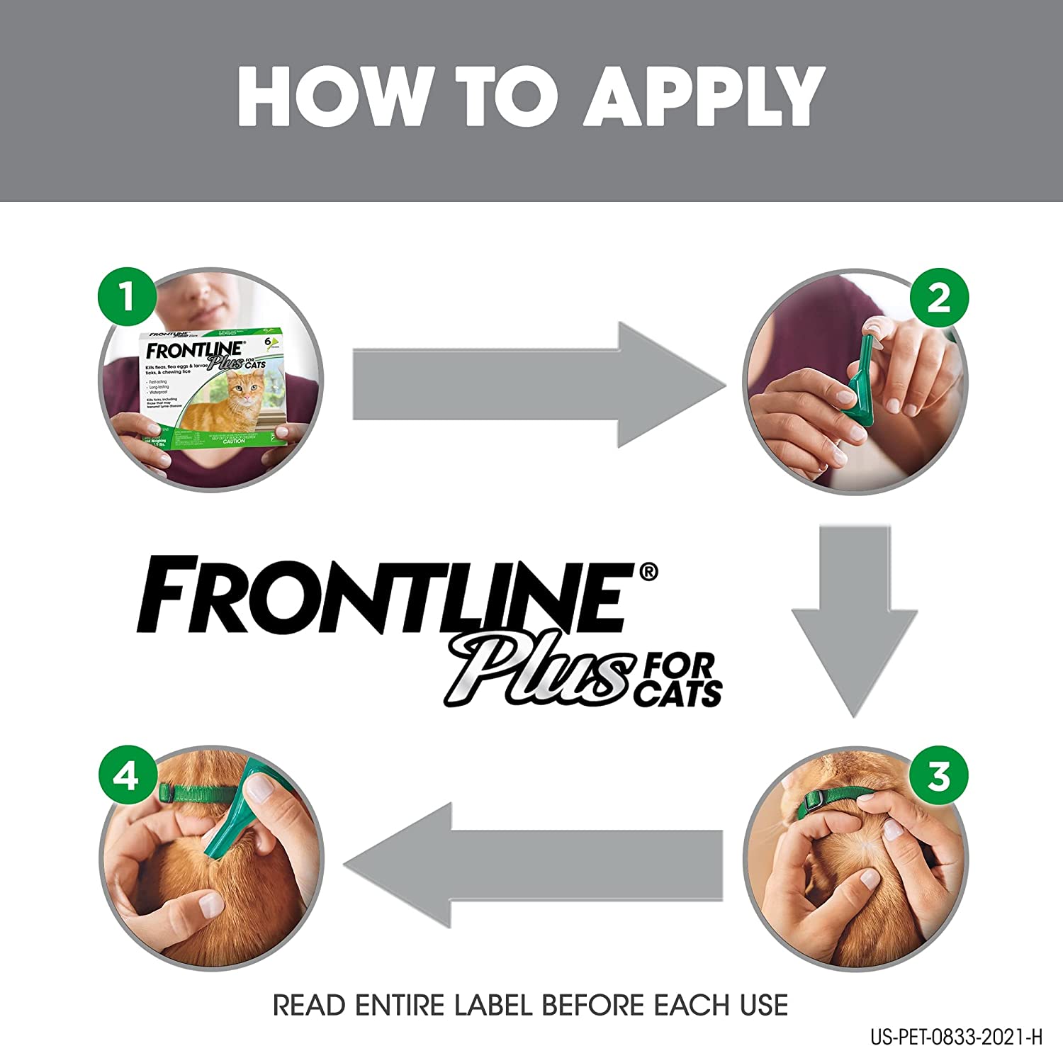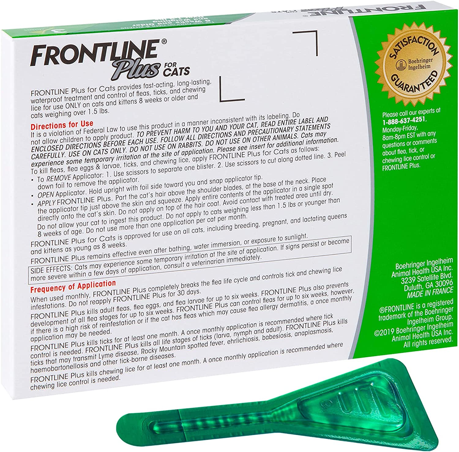 Protect your cat with the #1 name in flea and tick protection.* FRONTLINE Plus flea and tick control for cats and kittens is a long-lasting, fast-acting, waterproof flea and tick treatment proven to kill adult fleas, flea eggs, flea larvae, chewing lice and ticks. This flea and tick treatment kills ticks that may transmit Lyme disease. FRONTLINE Plus for Cats has been trusted by pet owners for over 20 years.** This month-long treatment is made for cats eight weeks or older, weighing 1.5 pounds and greater. Made with two active ingredients — fipronil and (S)-methoprene — this treatment breaks the flea life cycle by killing adult fleas as well as the eggs and larvae and prevents new infestations. One fast-acting topical application protects for a full 30 days. (References: *Data on file at Boehringer Ingelheim; **Data showing 20 years of trust in killing fleas and ticks is on file at Boehringer Ingelheim.)
