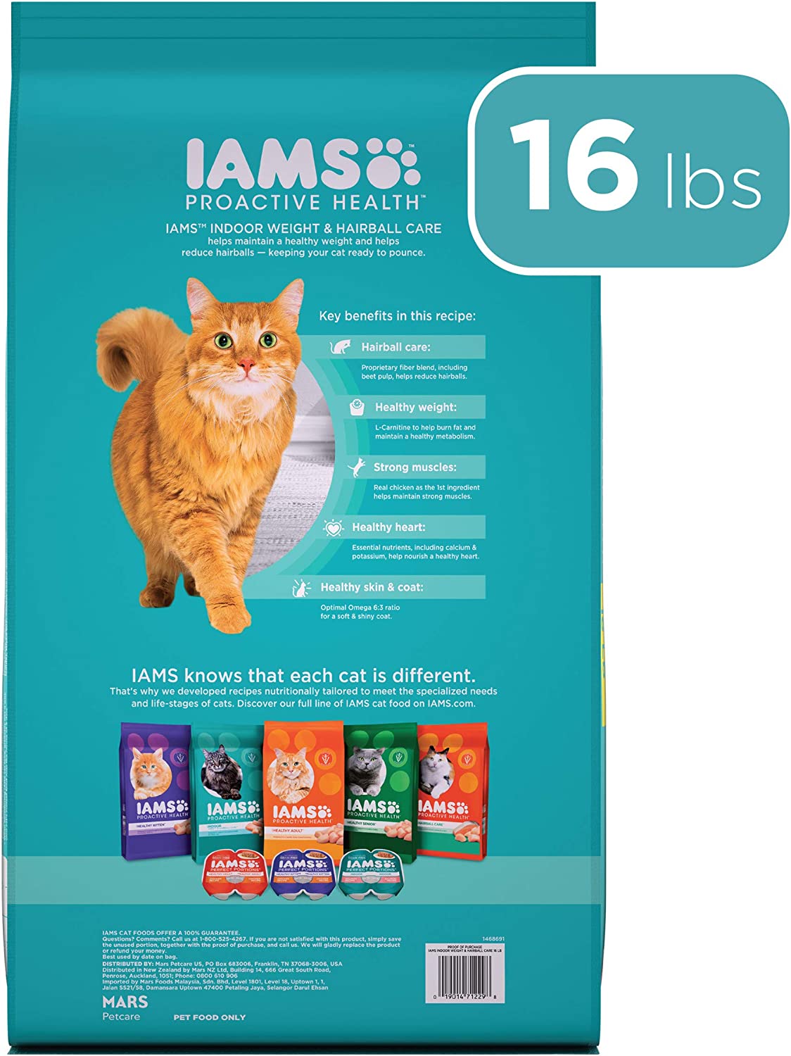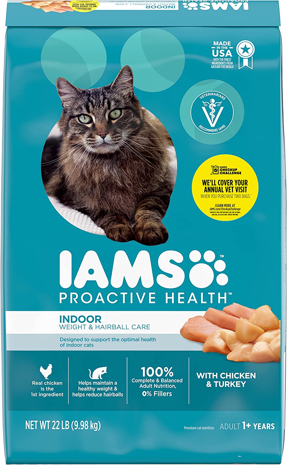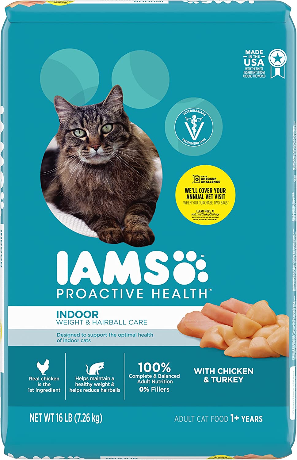 Your cat is unique that’s why IAMS makes a cat food that’s just as unique as they are. Help keep your cats at their best with IAMS Proactive Health Adult Indoor Weight Control & Hairball Care Dry Cat Food with Chicken & Turkey. This formula is designed to provide your indoor cat with the nutrients they need. It can also assist with a healthy weight loss or weight management, thanks to L-carnitine, which helps burn fat and maintain a healthy metabolism. And, with its tailored fiber blend (featuring beet pulp) to help support healthy digestion, it might just be the hairball remedy your cat needs. This cat food formula is made with real chicken as the first ingredient and contains the optimal omega 6:3 fatty acid ratio to help your feline grow and maintain a soft, shiny coat. It’s also full of essential vitamins and nutrients, including vitamin E, to help maintain a strong immune system. Plus, it nourishes heart health with calcium and potassium. Your cat will be eager to get their paws on this purr-fect chicken & turkey, cat food formula, and you can rest easy knowing you’re feeding them a meal that contributes to healthy nutrition.