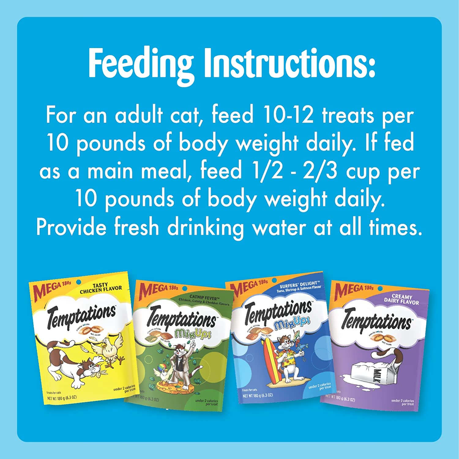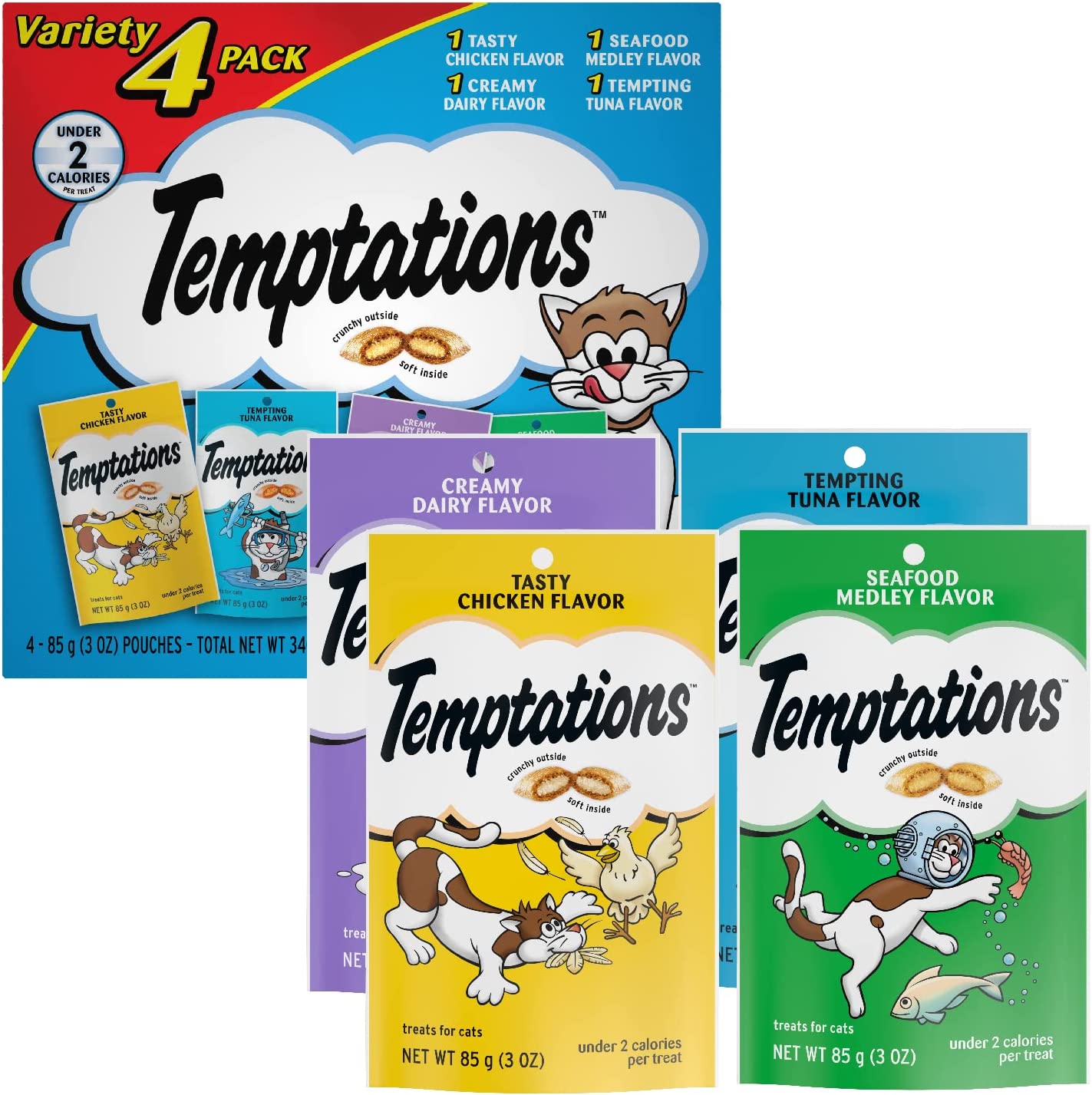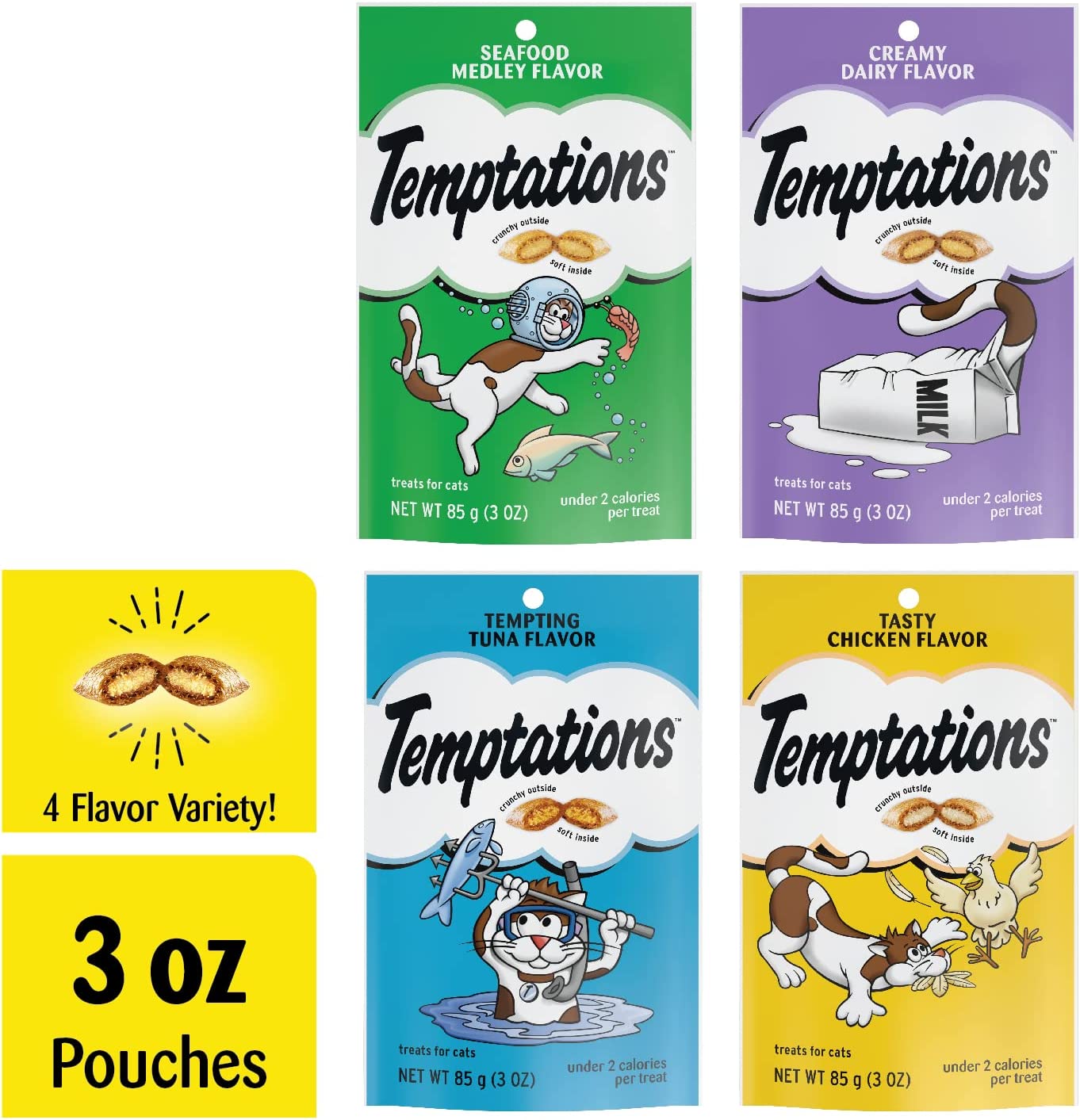 Cats can’t resist the delectable taste of Temptations, so give your cat these perfect Temptations Classic Cat Treats they’ll come running the moment you open the pack. Each of these low calorie seafood flavor, chicken flavor, dairy flavor, and tuna flavor cat snacks has less than 2 calories and provides an irresistible combination of both crunchy and soft textures. These healthy cat treats also come in a cat-proof, stay-fresh pouch, so your feline friend can enjoy their favorite snack when you open it, but never when they shouldn’t. These Temptations Classic Cat Treats are a perfect addition to your cat’s normal feeding routine: Use them as a treat, a meal, or a cat food topper. They also are the perfect size treats for cat toys try mixing up playtime by placing a few inside a treat dispensing toy and watch your cat chase and swat away. Based on 2019 Nielsen sales data.