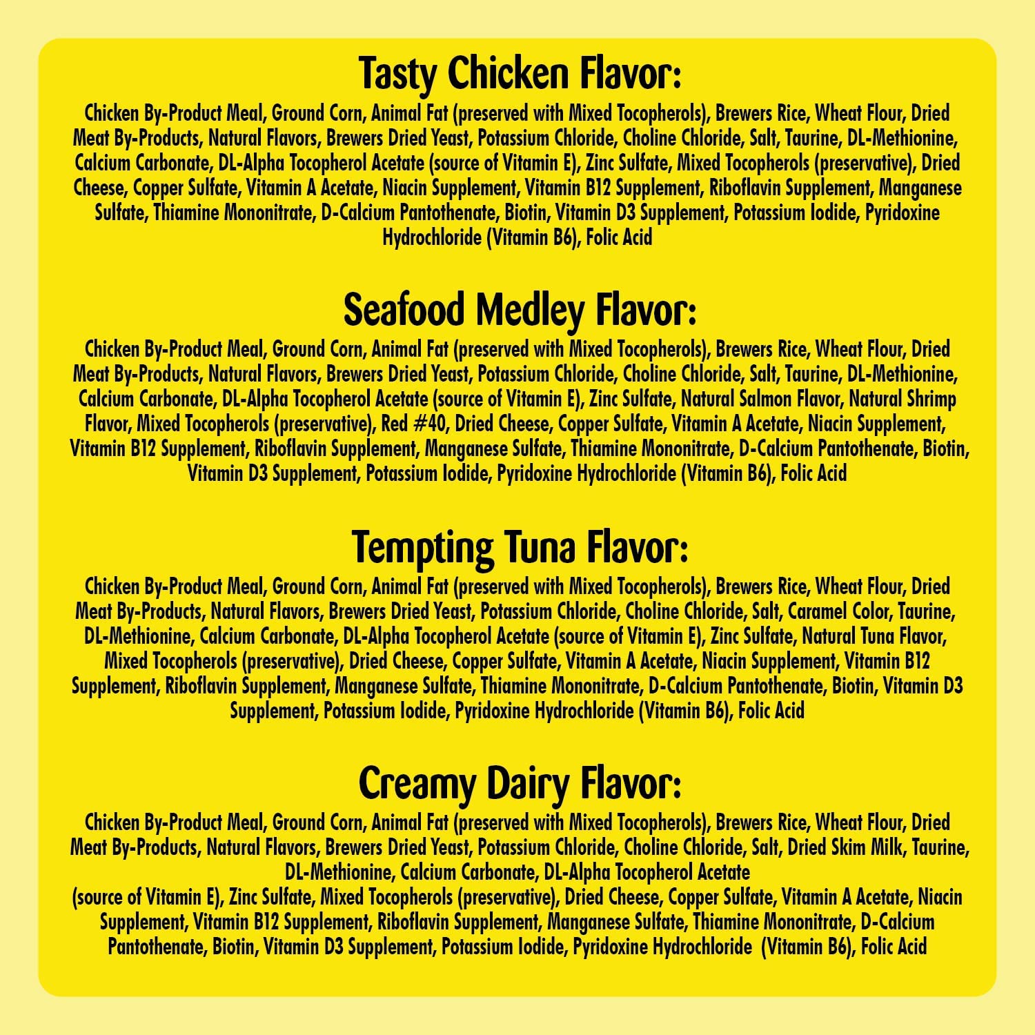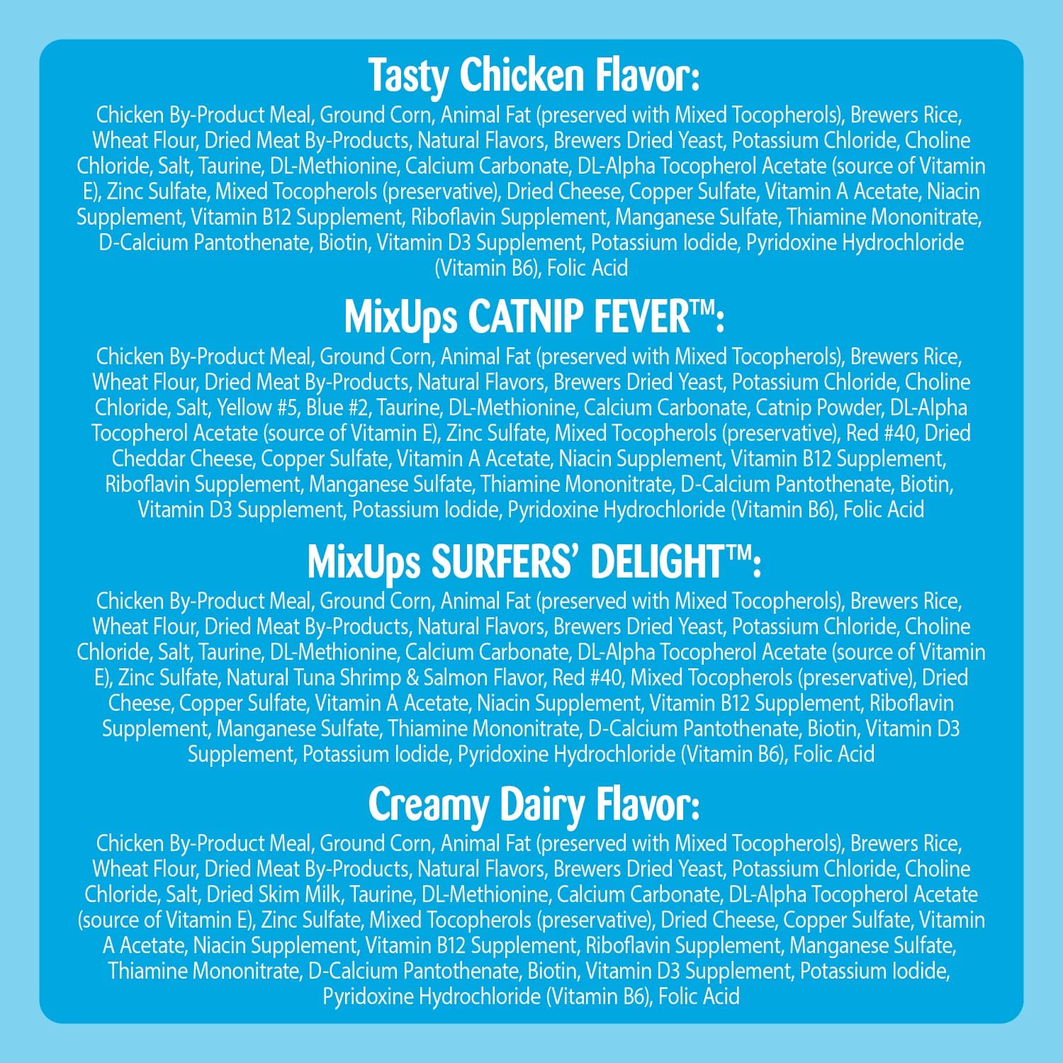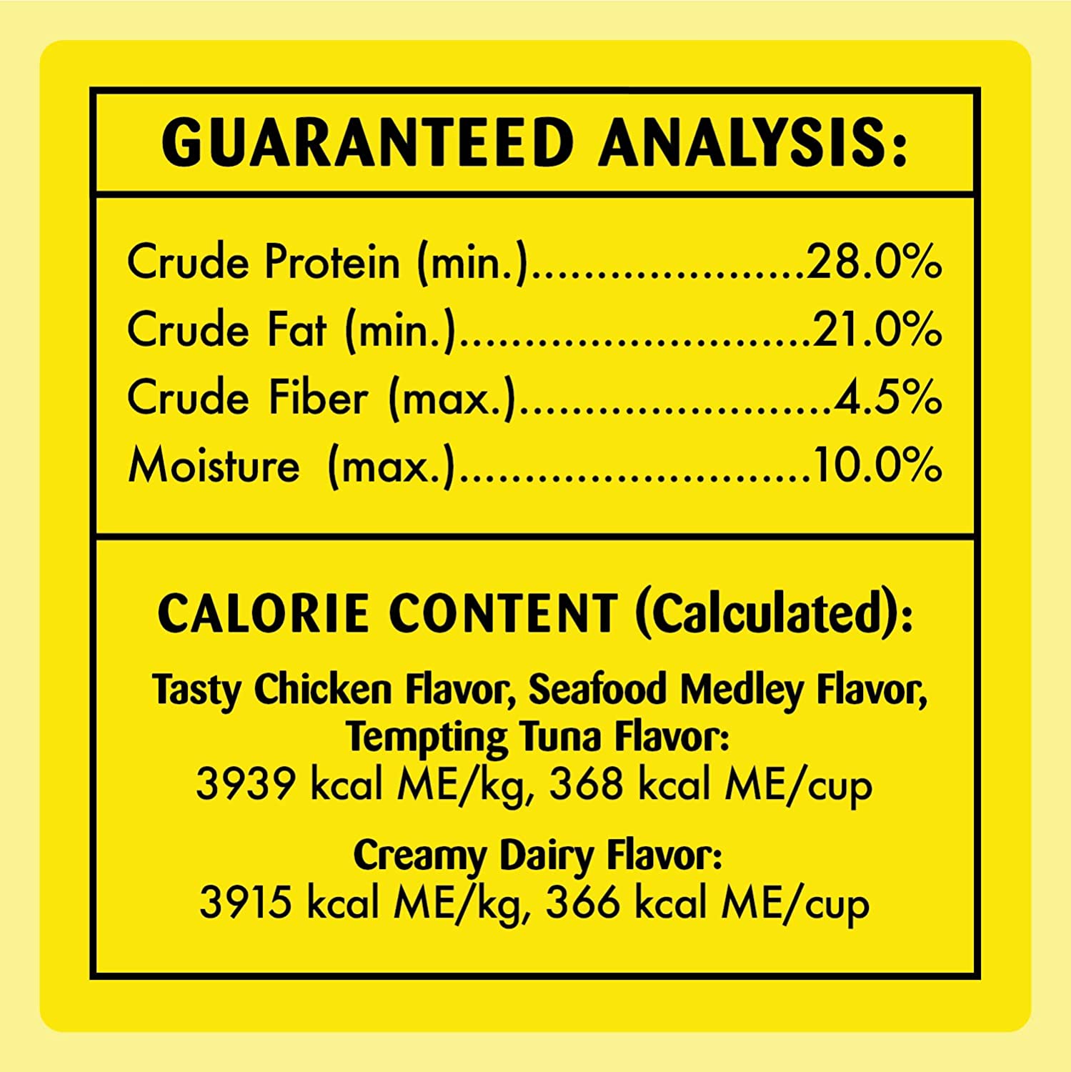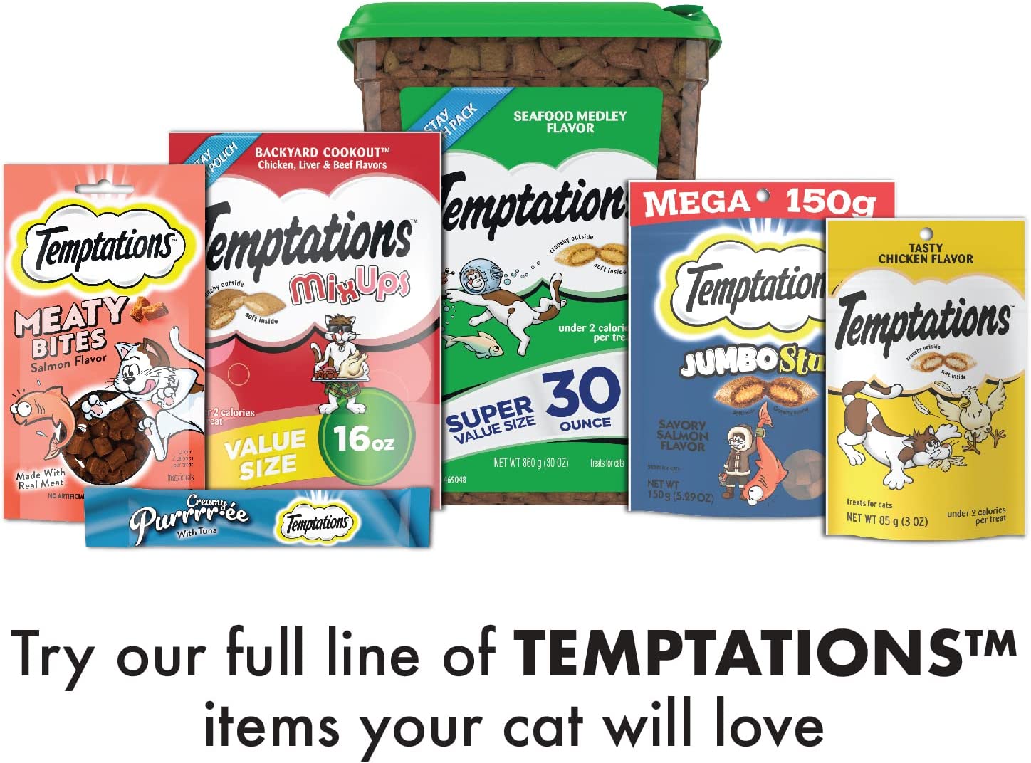 Cats can’t resist the delectable taste of Temptations, so give your cat these perfect Temptations Classic Cat Treats they’ll come running the moment you open the pack. Each of these low calorie seafood flavor, chicken flavor, dairy flavor, and tuna flavor cat snacks has less than 2 calories and provides an irresistible combination of both crunchy and soft textures. These healthy cat treats also come in a cat-proof, stay-fresh pouch, so your feline friend can enjoy their favorite snack when you open it, but never when they shouldn’t. These Temptations Classic Cat Treats are a perfect addition to your cat’s normal feeding routine: Use them as a treat, a meal, or a cat food topper. They also are the perfect size treats for cat toys try mixing up playtime by placing a few inside a treat dispensing toy and watch your cat chase and swat away. Based on 2019 Nielsen sales data.
