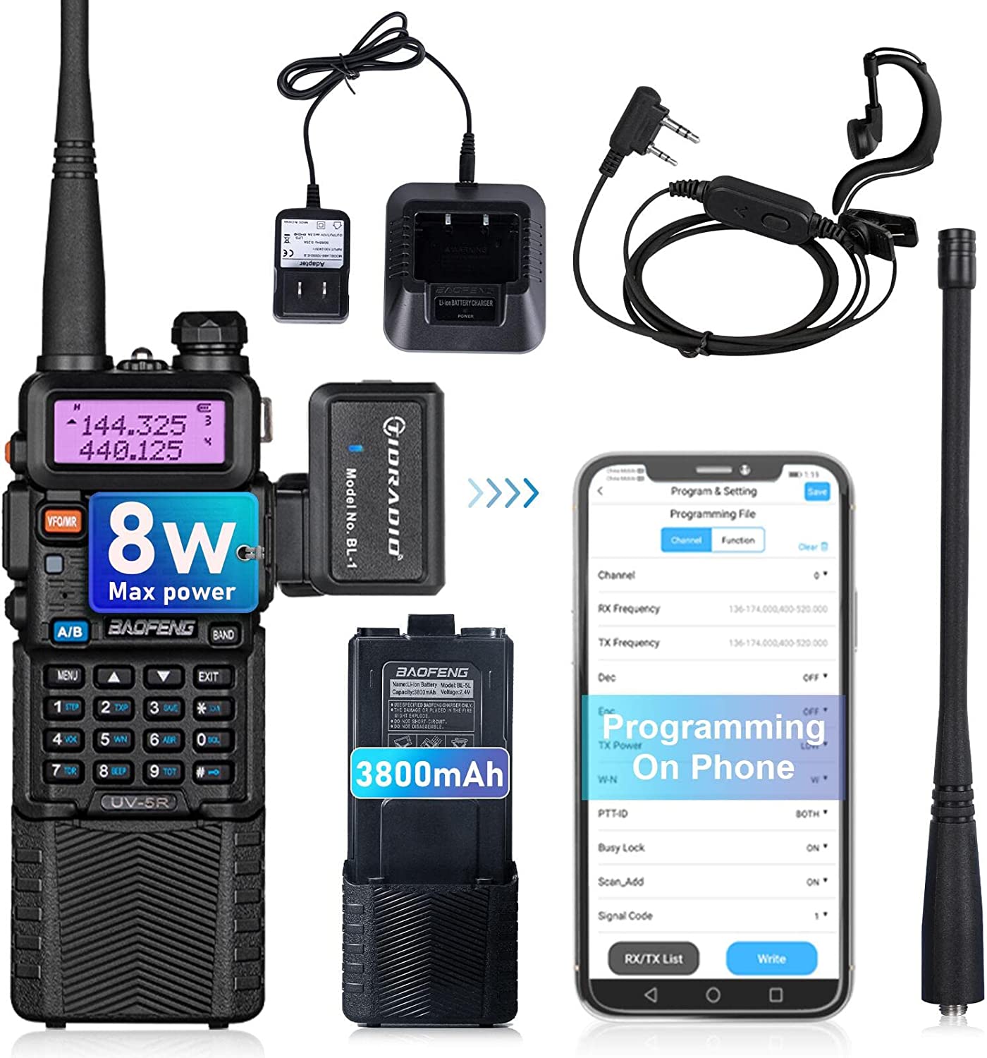 BaoFeng UV-5R 8 Watt Ham Radio BaoFeng Radio with Extra 1800mAh Battery and TIDRADIO 771 Antenna Dual Band Ham Radio Handheld Includes Full Kit BaoFeng Walkie Talkie