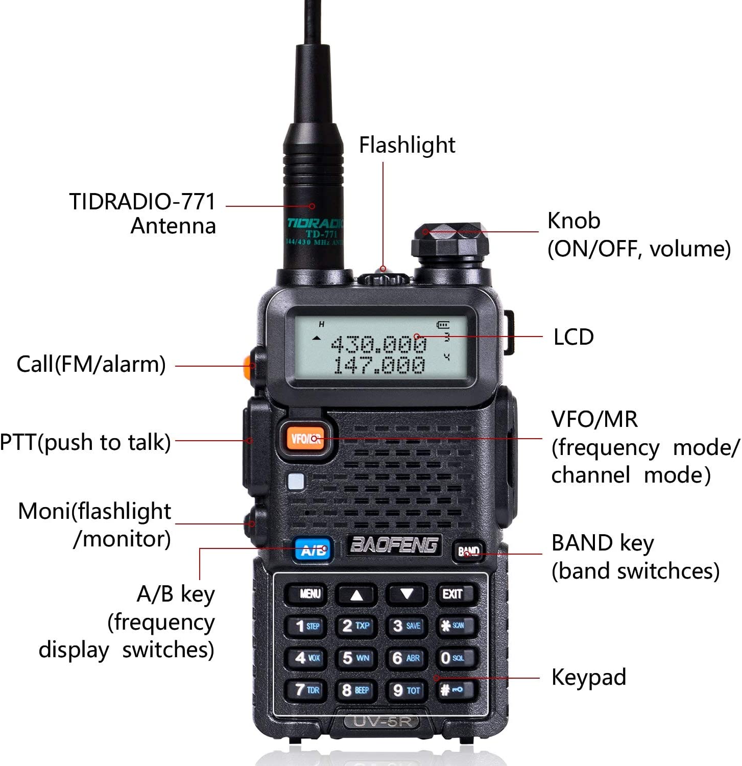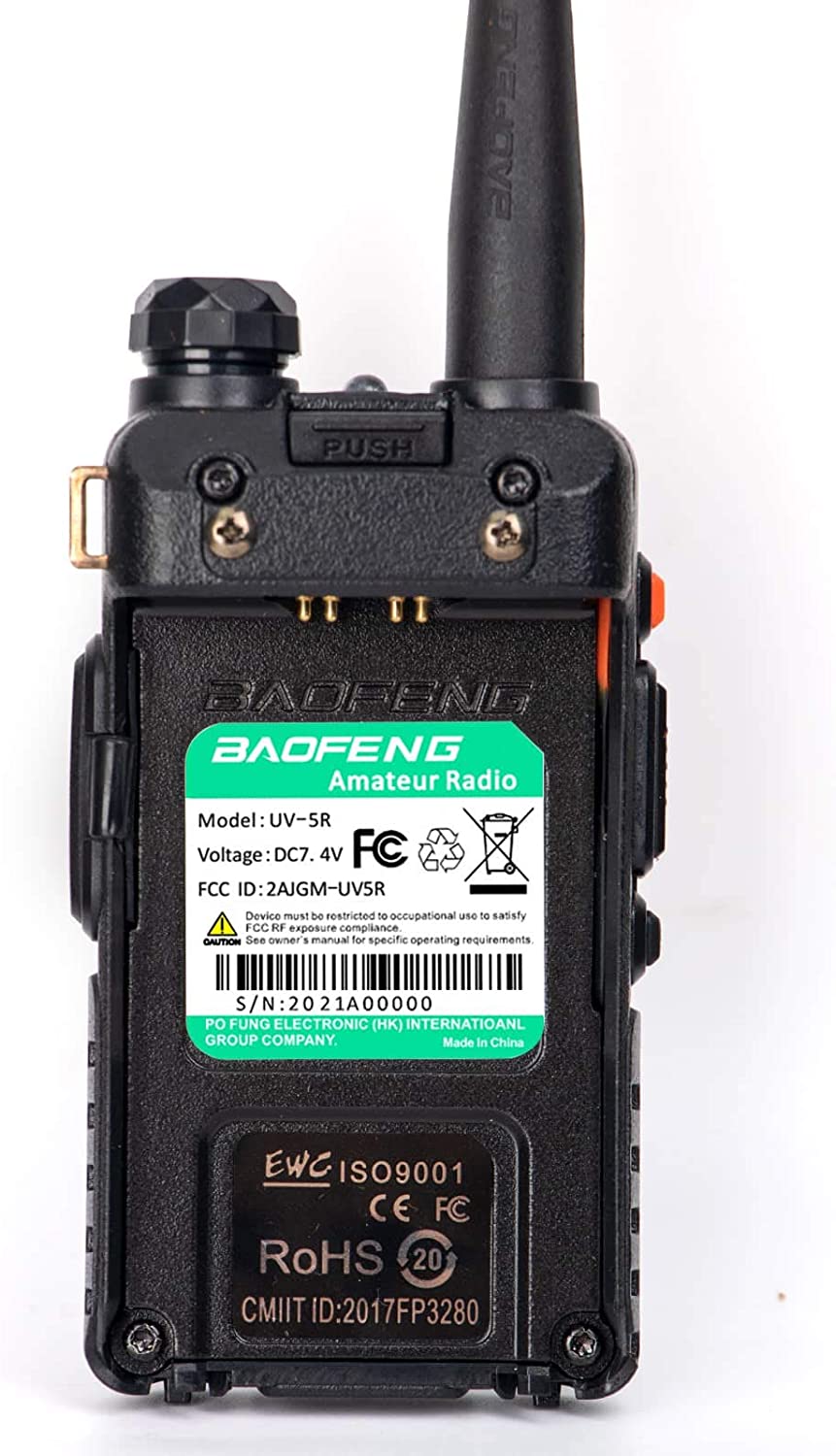 • ✔️According to FCC rules, baofeng uv-5r has passed part 15B and part 97 tests; FCC ID: 2AJGM-UV5R; Transmit frequency range: VHF 144-148MHz and UHF 420-450MHz; Receive frequency range: VHF 136-174 MHz and UHF 400-480 MHz.