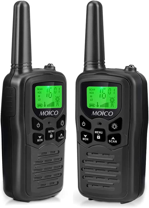 • 【Back-lit LCD Screen and LED flashlight】This walkie talkies has bold green back-lit LCD screen provides high visibility in night. Built-in LED torch can be used as both flash and emergency light.Small size and light weight, Hard and durable shell, drop-proof.MOICO walkie talkie let you and your family enjoy games or outdoor adventures.