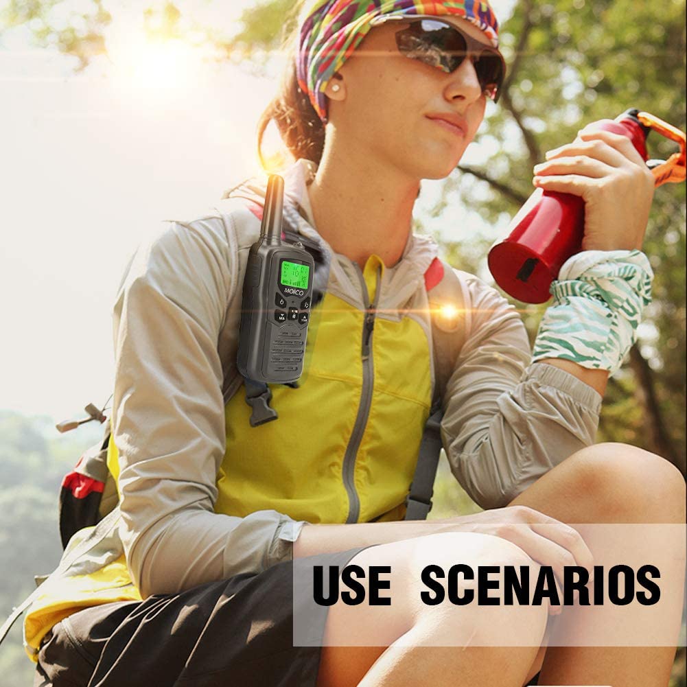 • 【Back-lit LCD Screen and LED flashlight】This walkie talkies has bold green back-lit LCD screen provides high visibility in night. Built-in LED torch can be used as both flash and emergency light.Small size and light weight, Hard and durable shell, drop-proof.MOICO walkie talkie let you and your family enjoy games or outdoor adventures.