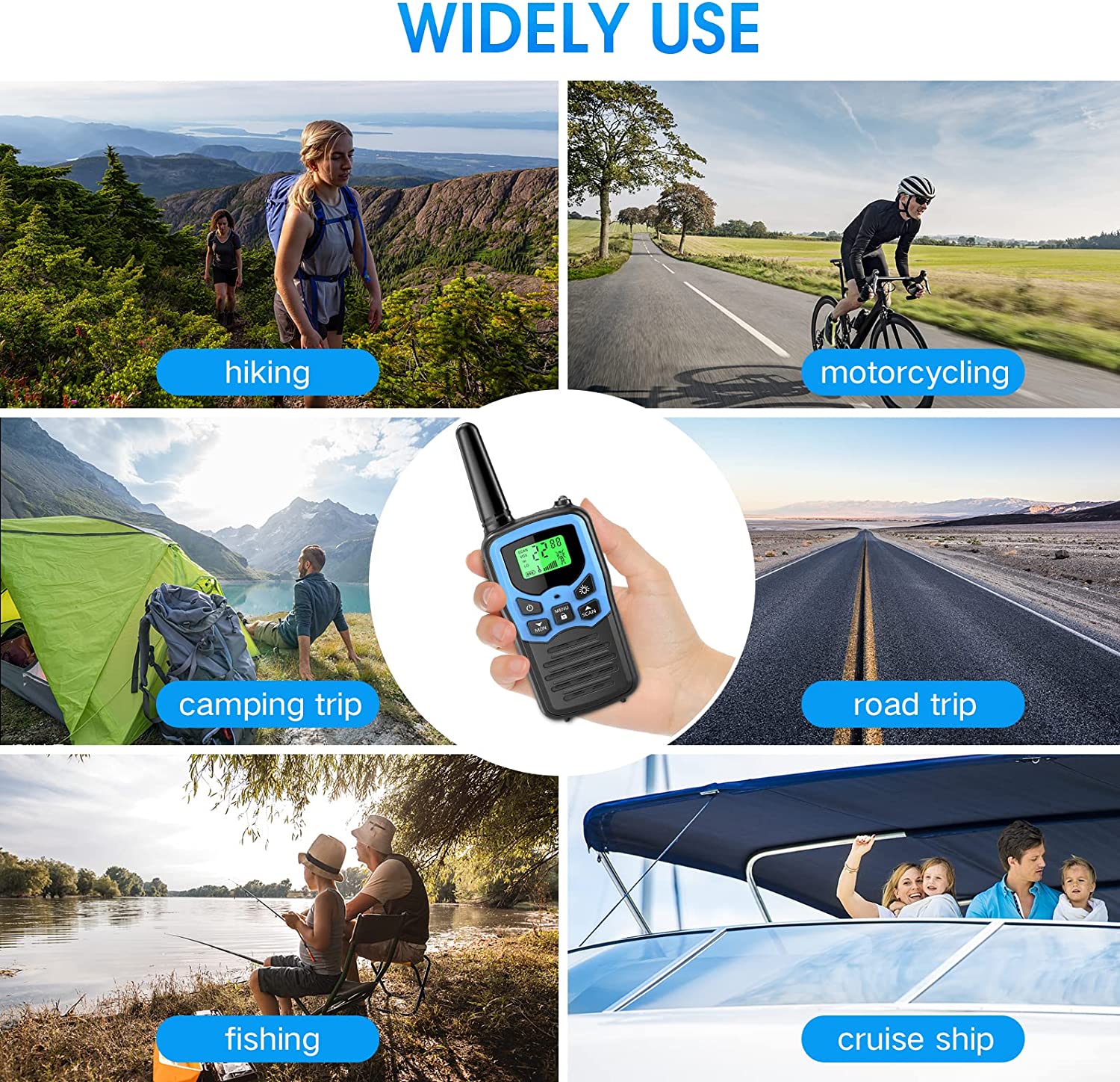 • 【 Long Distance Walkie Talkies】Walkie talkie can reach 3-5 miles communication range in open areas such as rural areas, suburbs or seaside, etc. where there is no shelter. If in cities or towns, walkie talkies can reach 0.6-1.2 miles. Adverse weather, car(Iron material), voyage and buildings will affect the range. The actual distance depends on the obstruction of the current environment.