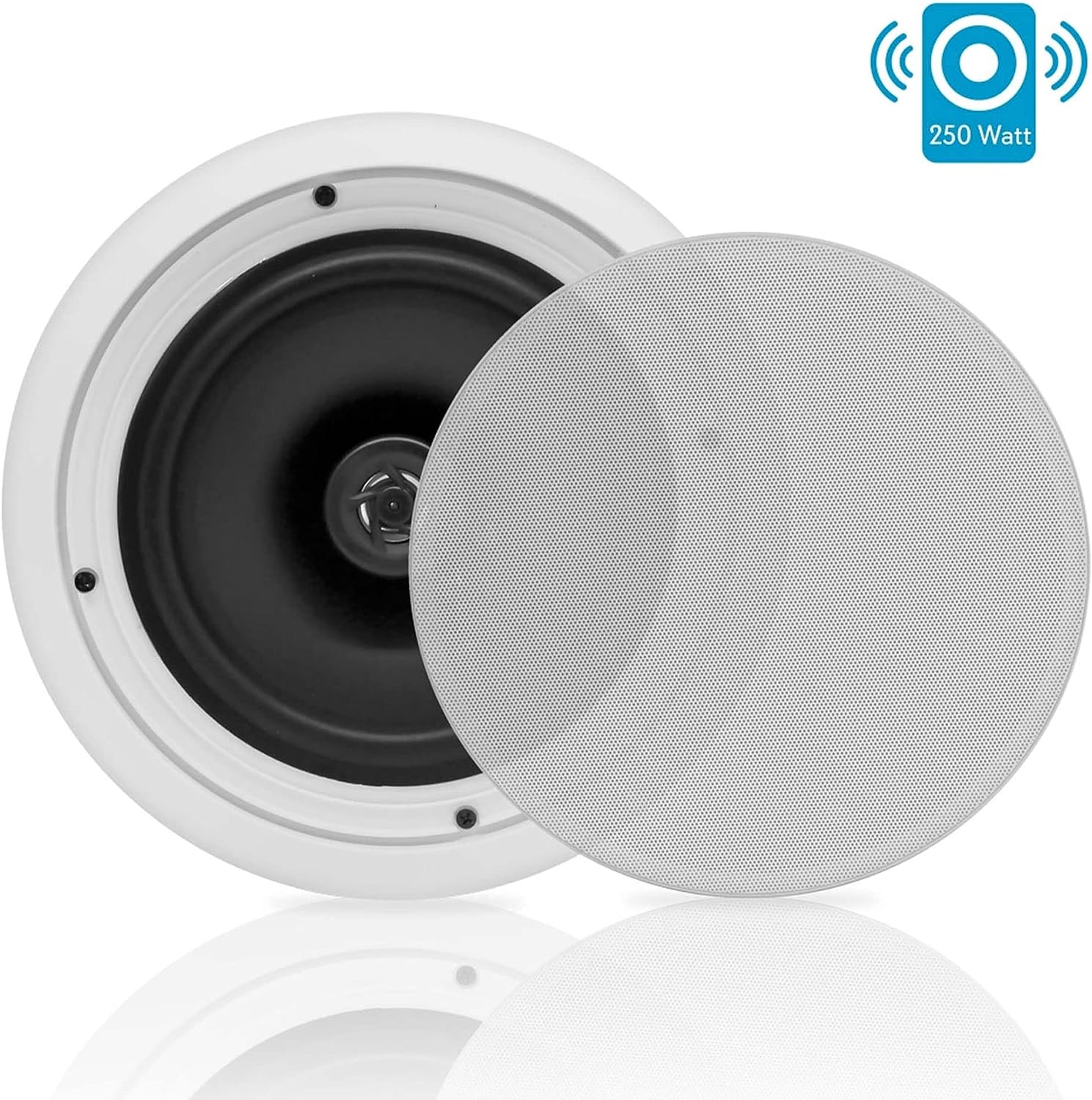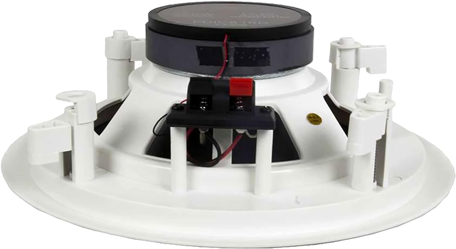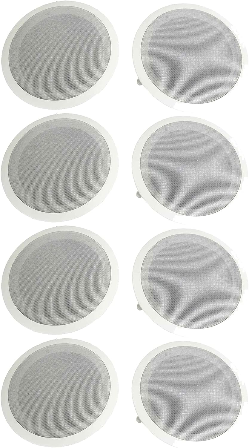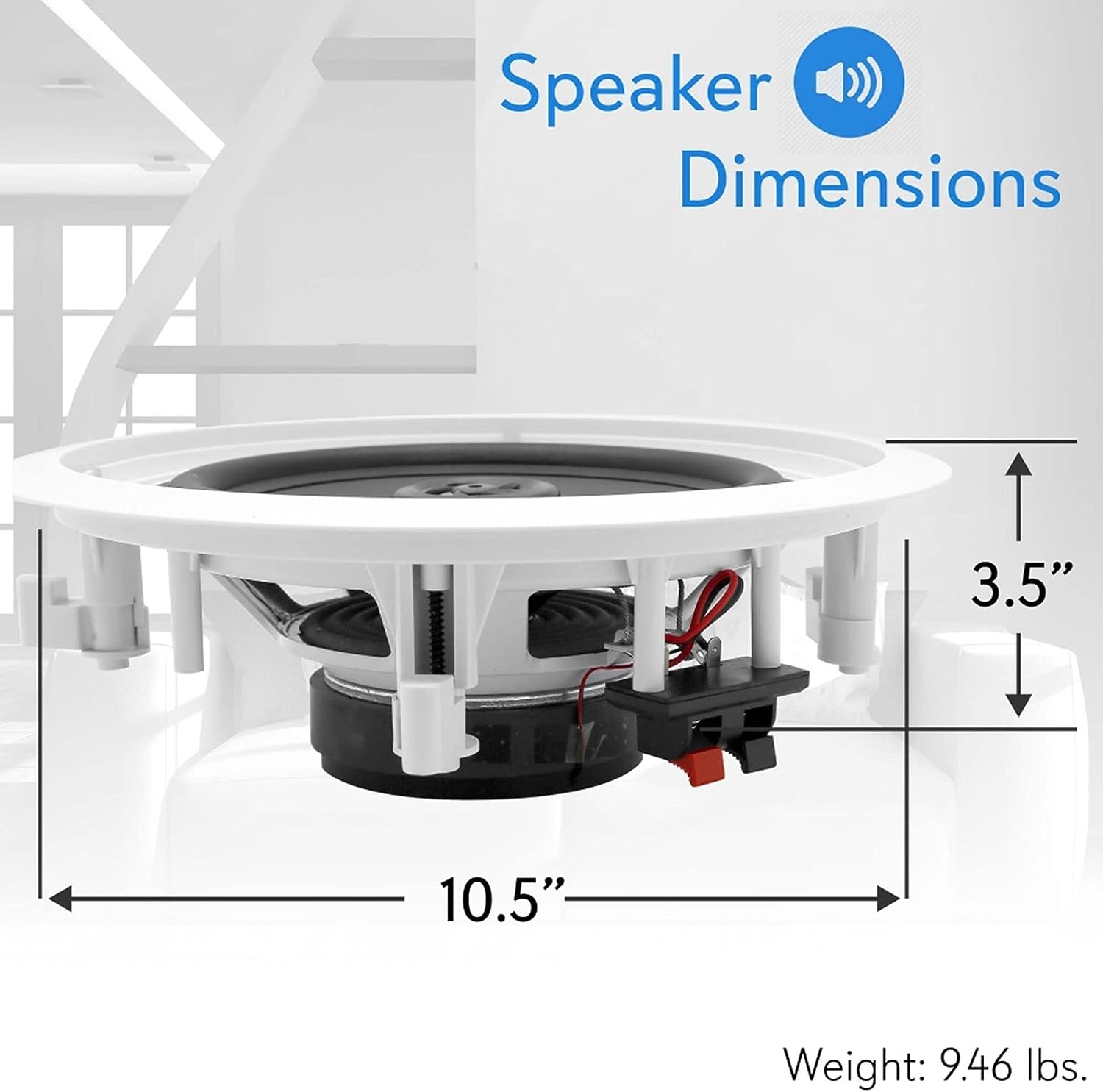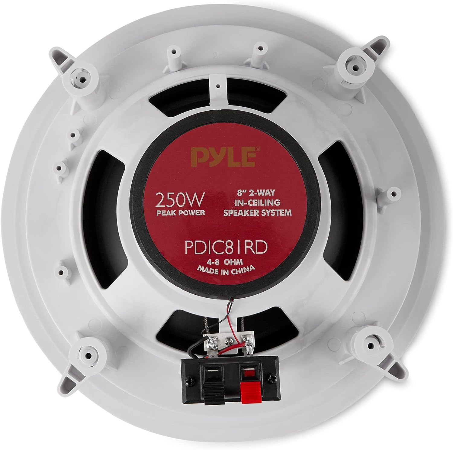 This 4-Pack of Pyle Home PDIC speaker system delivers stereo sound to any room in your home or office without cluttering floor space. This way, you can access great sound and music for entertaining guests, movie nights, karaoke contests, and more without the hassle of setting up boxy speaker systems. These pairs of 8'' speakers can be used for in-wall and in-ceiling applications as they mount flush for a clean look. Perfect for custom installations, the PDIC series speakers feature polymer dome tweeters, impressive power handling capability, high-temperature voice coils, and high-efficiency response rates, all to produce a fuller and richer sound. Additionally, the 200-watt rated peak power and directable 0.5-inch polymer dome tweeter provide sound you'll love when jamming out to your favorite tunes. With convenient speaker terminals, these in-home speakers allow for quick and hassle-free speaker wire connection. The speaker set includes a cutout template for easy installation. Achieve wide-ranged sound performance and add audio to any room with the 4-Pack of Pyle Home PDIC Ceiling Speakers.