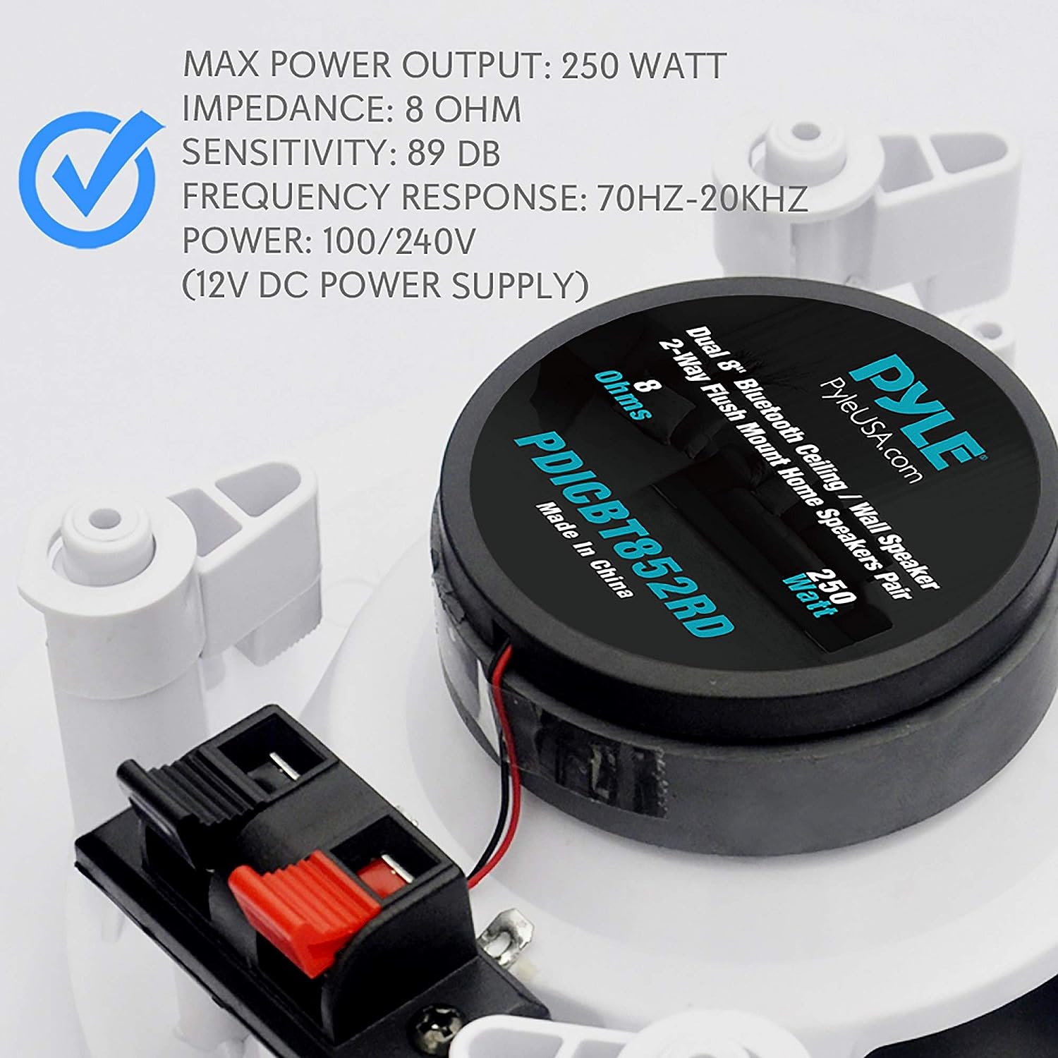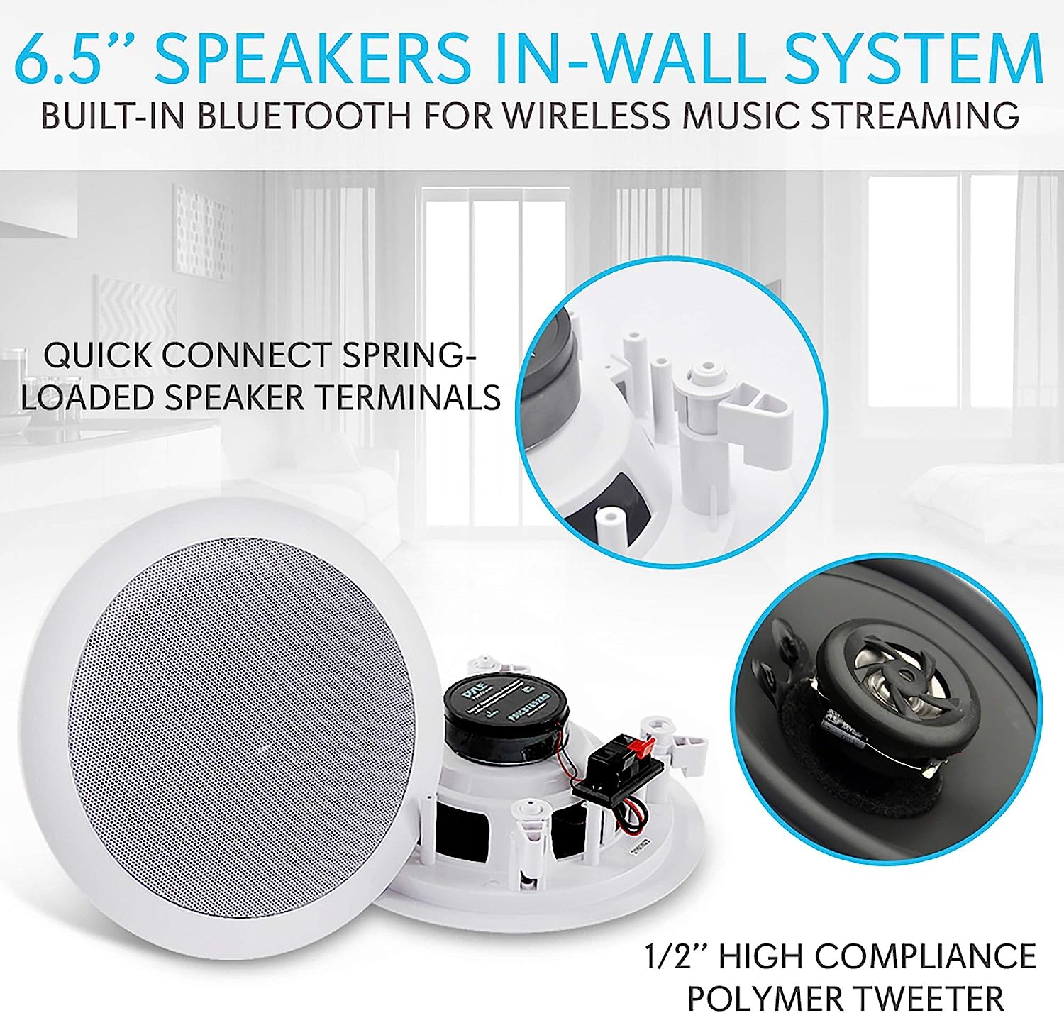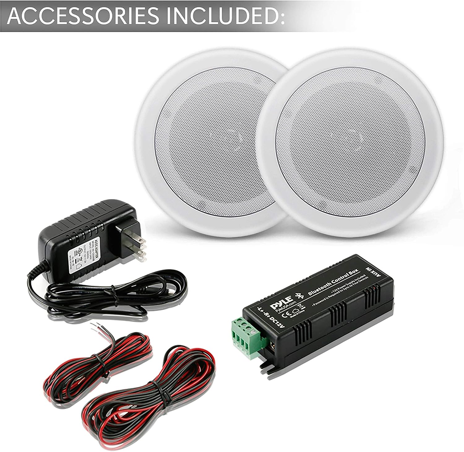 The Pyle In-Wall/Ceiling Bluetooth Speaker Kit delivers effortless stereo sound to any room in your home or office. The included Bluetooth controller allows for wireless music streaming ability and doubles as a sound processing digital amplifier. You will be able to stream audio from all of your favorite Bluetooth devices (like smartphones, tablets and computers). Each round-style speaker features a high-compliance polymer tweeter that delivers full, rich sound without cluttering floor space. They are made of environmental friendly ABS material and include a cut-out template for easy installation. Mount them in a convenient location on the wall or ceiling for a flush, clean look. Achieve wide-range sound performance and add audio to any room with the Pyle In-Wall/Ceiling Bluetooth Speaker Kit.