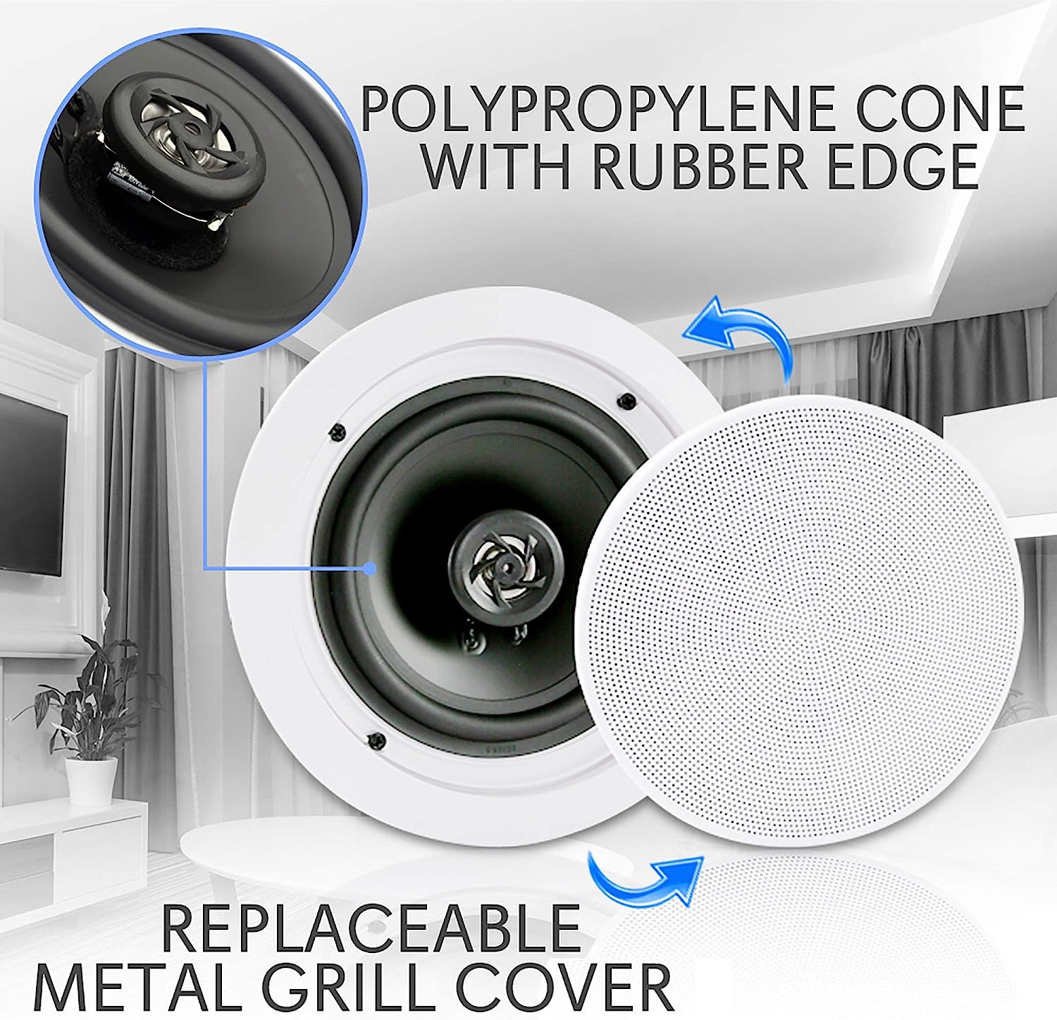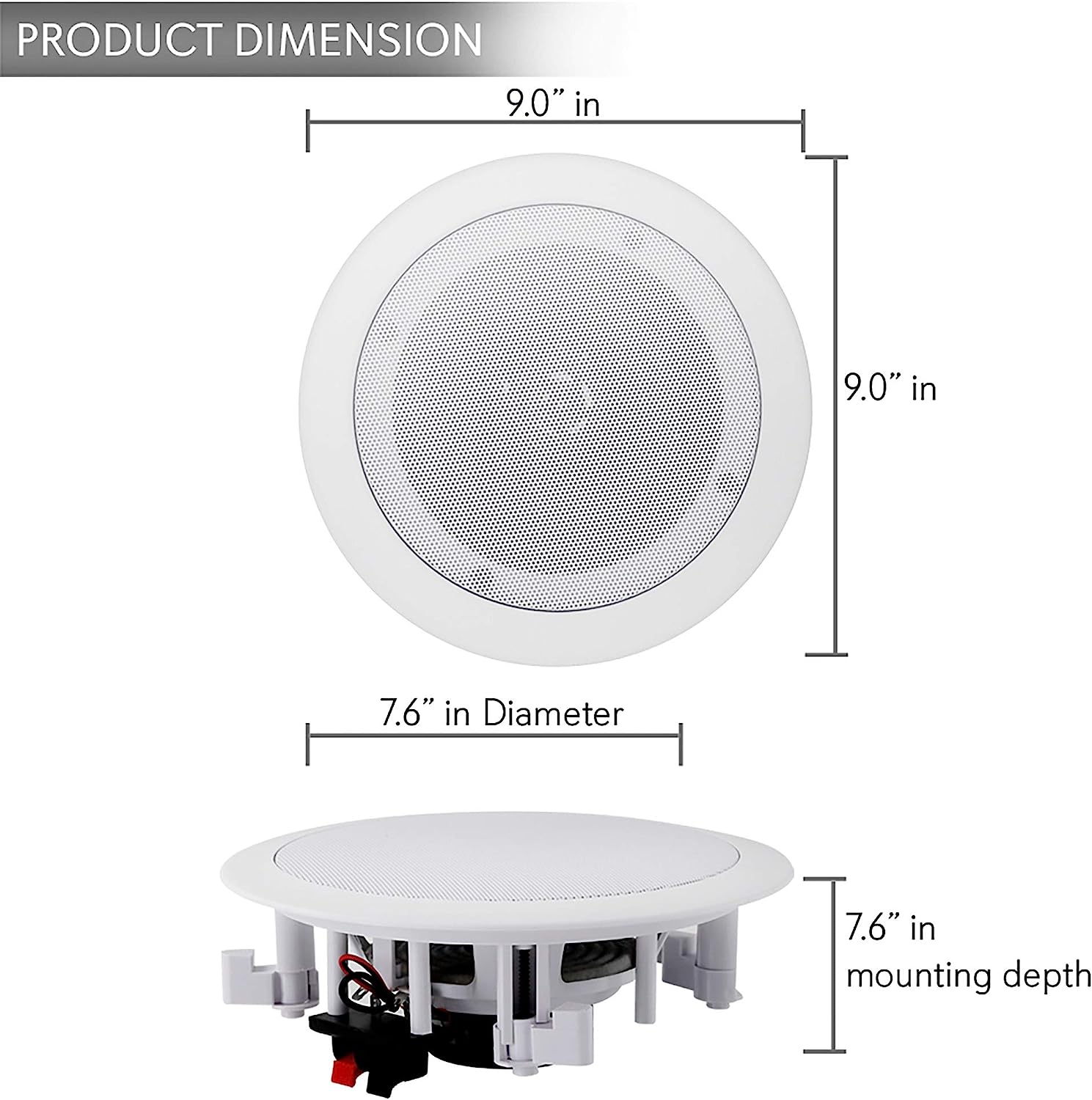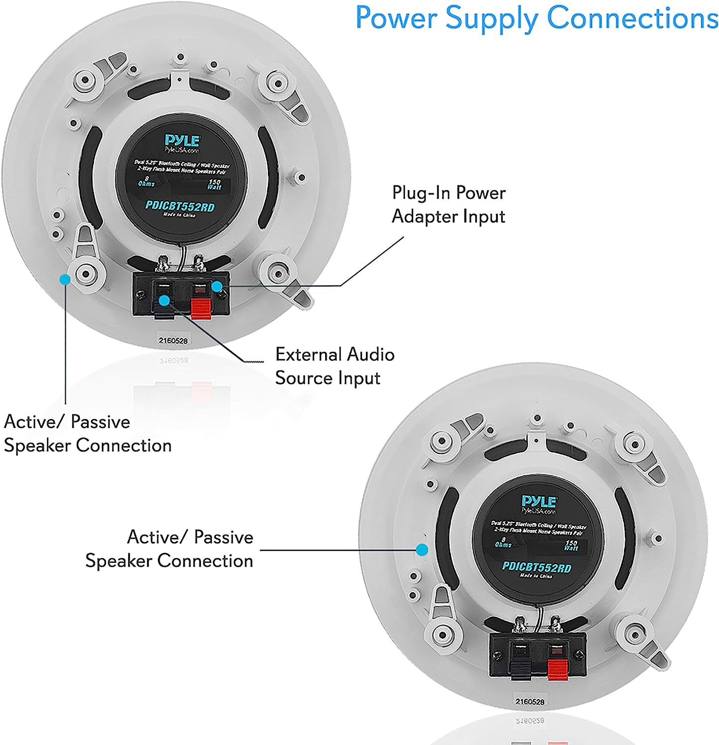 The Pyle In-Wall/Ceiling Bluetooth Speaker Kit delivers effortless stereo sound to any room in your home or office. The included Bluetooth controller allows for wireless music streaming ability and doubles as a sound processing digital amplifier. You will be able to stream audio from all of your favorite Bluetooth devices (like smartphones, tablets and computers). Each round-style speaker features a high-compliance polymer tweeter that delivers full, rich sound without cluttering floor space. They are made of environmental friendly ABS material and include a cut-out template for easy installation. Mount them in a convenient location on the wall or ceiling for a flush, clean look. Achieve wide-range sound performance and add audio to any room with the Pyle In-Wall/Ceiling Bluetooth Speaker Kit.