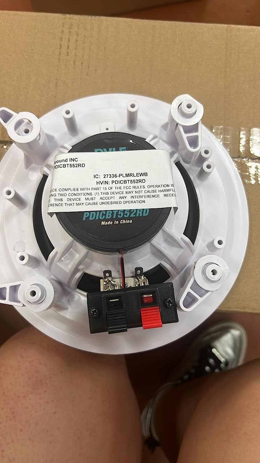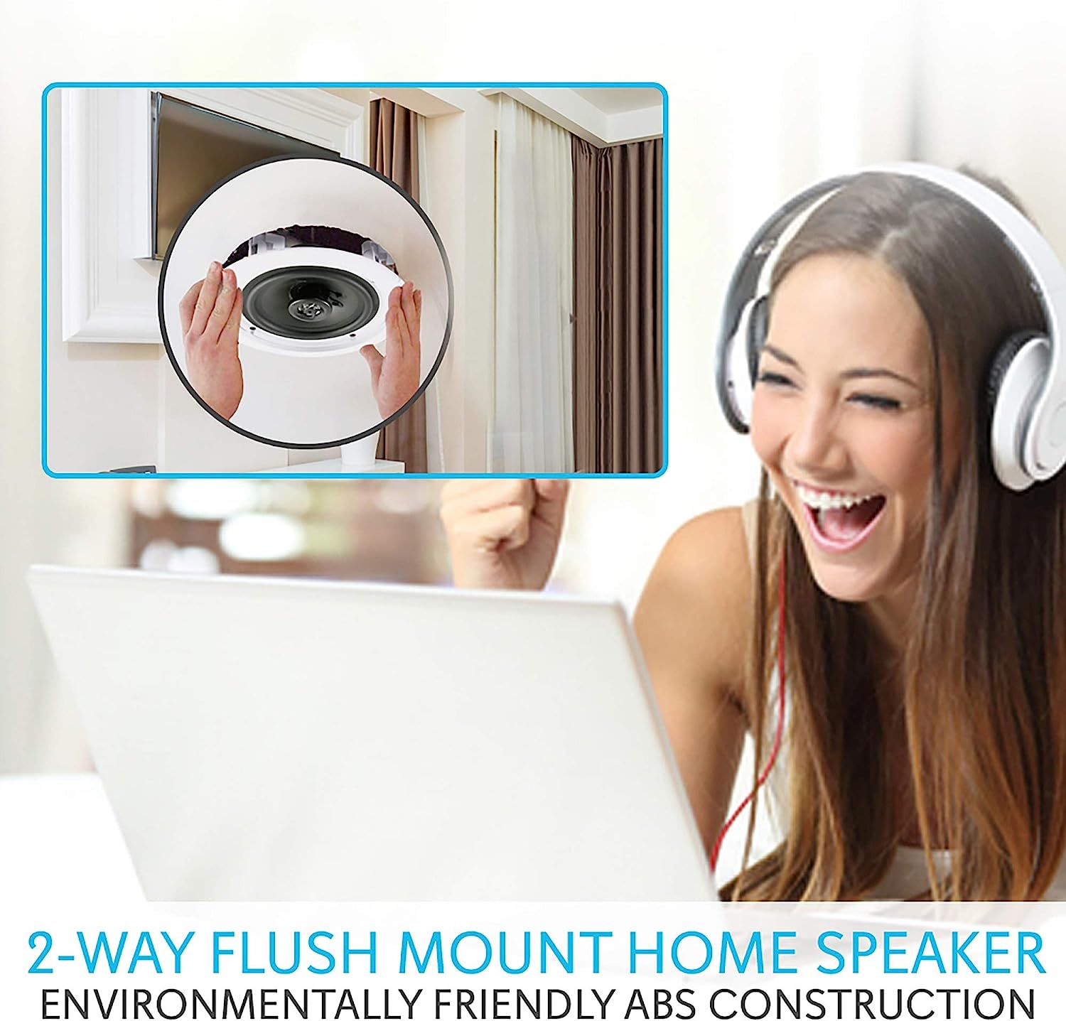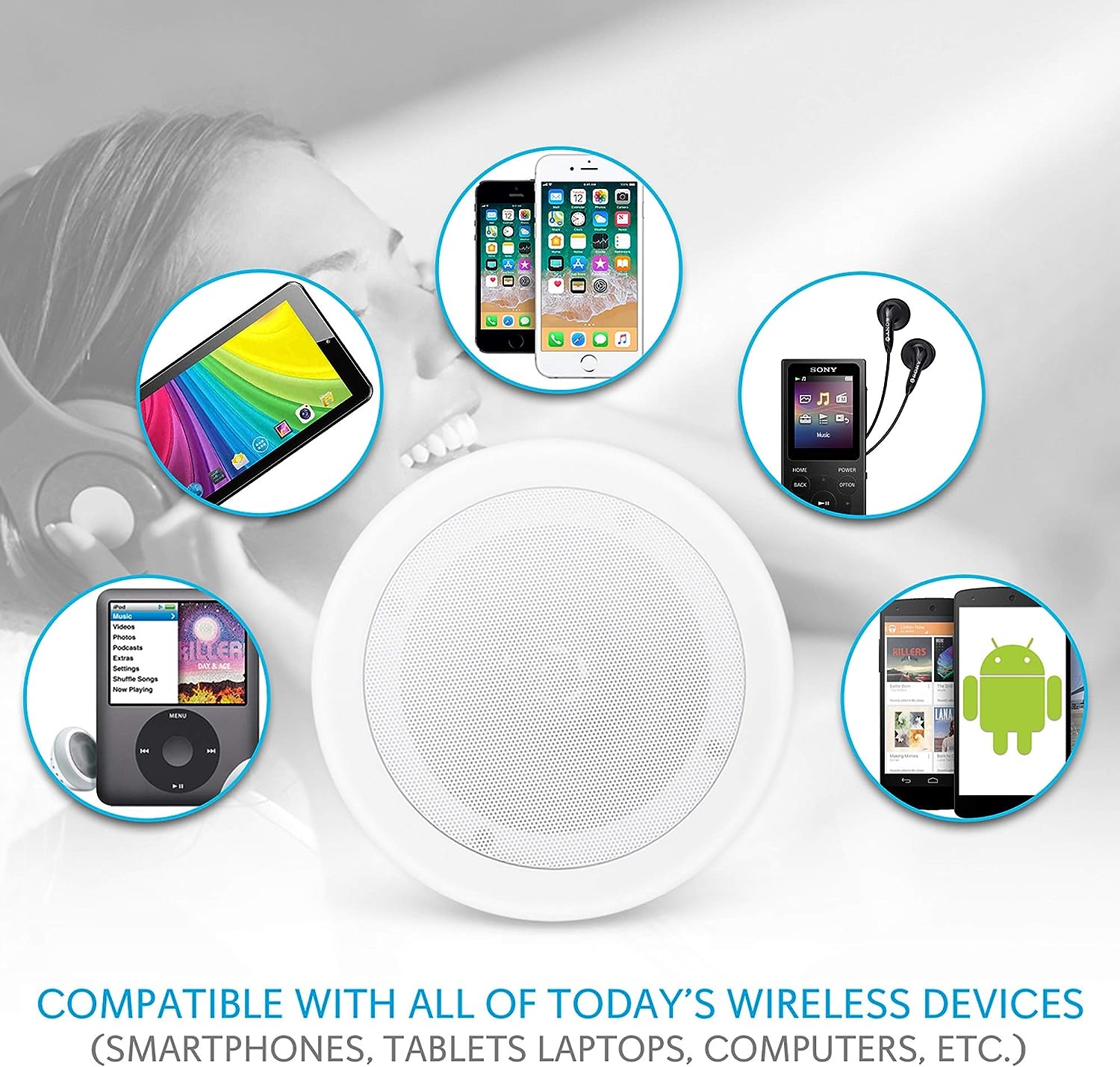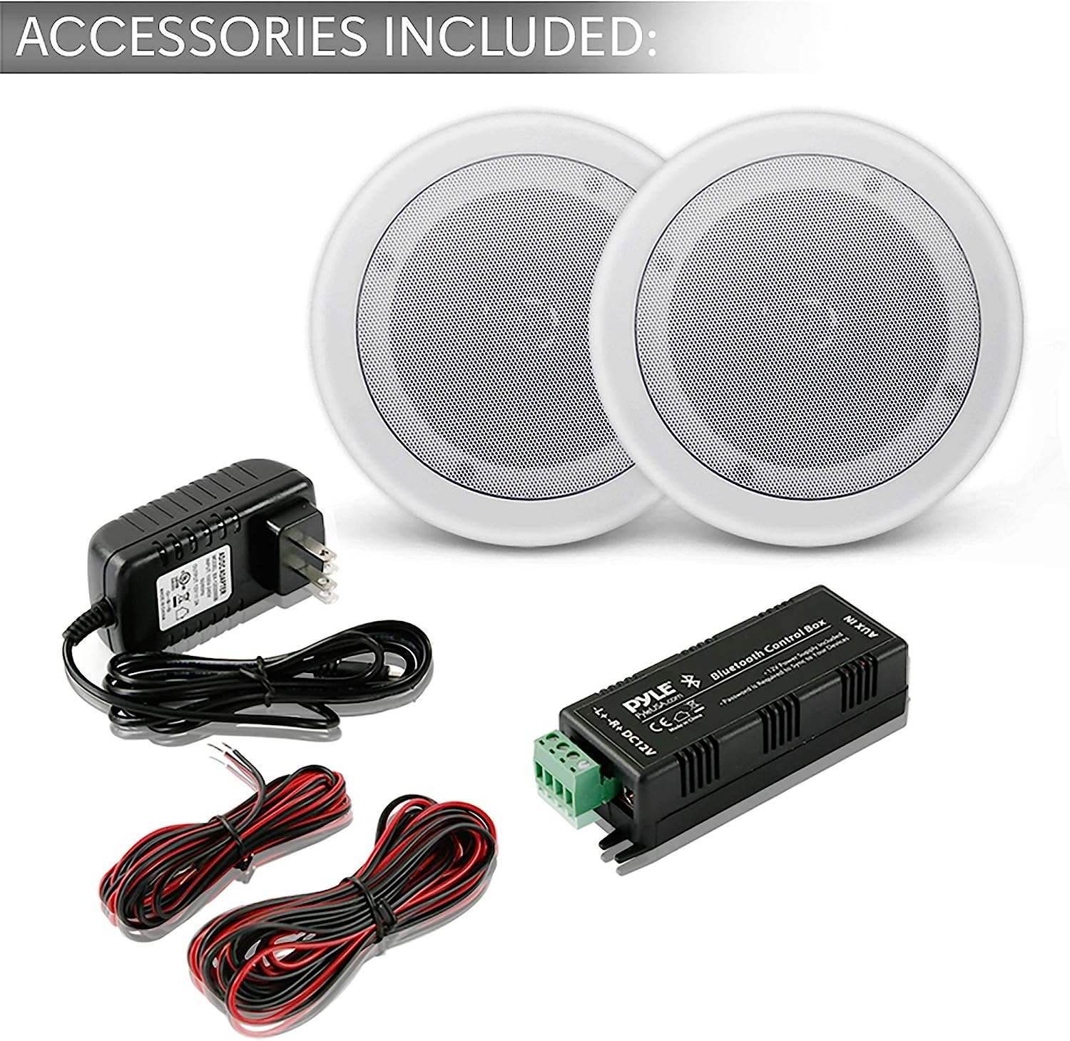 Pyle Model : PDICBT652RD6.5" Bluetooth Home Ceiling SpeakersDual 6.5’’ Bluetooth Ceiling/Wall Speakers, 2-Way Flush Mount Home Speaker Pair, 200 Watt Features:Includes (2) 6.5’’ -inch SpeakersIn-Wall/In-Ceiling SystemBuilt-in Bluetooth for Wireless Music StreamingQuick Connect Spring-Loaded Speaker Terminals1/2’’ High Compliance Polymer TweeterPolypropylene Cone with Rubber EdgeMounts Flush to Walls or CeilingsCut-Out Size Template for Easy InstallationPerfect for Custom Installations & ApplicationsBluetooth Connectivity:Includes Bluetooth Wireless Audio Control ReceiverWorks with All of Today’s Latest Devices (Smartphone, Tablet, Laptop, Computer, etc.)Bluetooth Network Name: ‘Pyle’Bluetooth Network Password: ‘0000’ (4 Zeroes)Bluetooth Version: 4.0Wireless Range: 30’+ ft. What’s in the Box:(2) 6.5’’ SpeakersSpeaker Connection WireBluetooth Control ReceiverPower SupplyTechnical Specs:MAX Power Output: 200 WattImpedance: 8 OhmSensitivity: 88 dBFrequency Response: 70Hz-20kHzPower: 100/240V (12V DC Power Supply)Total Unit Dimensions (Diameter x Depth): 9.0’’ x 3.1’’Cutout Diameter: 7.6’’, Cutout Mounting Depth: 2.8’’Single Speaker Weight: 3.3 lbs.The Pyle In-Wall/Ceiling Bluetooth Speaker Kit delivers effortless stereo sound to any room in your home or office. The included Bluetooth controller allows for wireless music streaming ability and doubles as a sound processing digital amplifier. You will be able to stream audio from all of your favorite Bluetooth devices (like smartphones, tablets and computers). Each round-style speaker features a high-compliance polymer tweeter that delivers full, rich sound without cluttering floor space. They include a cut-out template for easy installation. Mount them in a convenient location on the wall or ceiling for a flush, clean look. Achieve wide-range sound performance and add audio to any room with the Pyle In-Wall/Ceiling Bluetooth Speaker Kit.