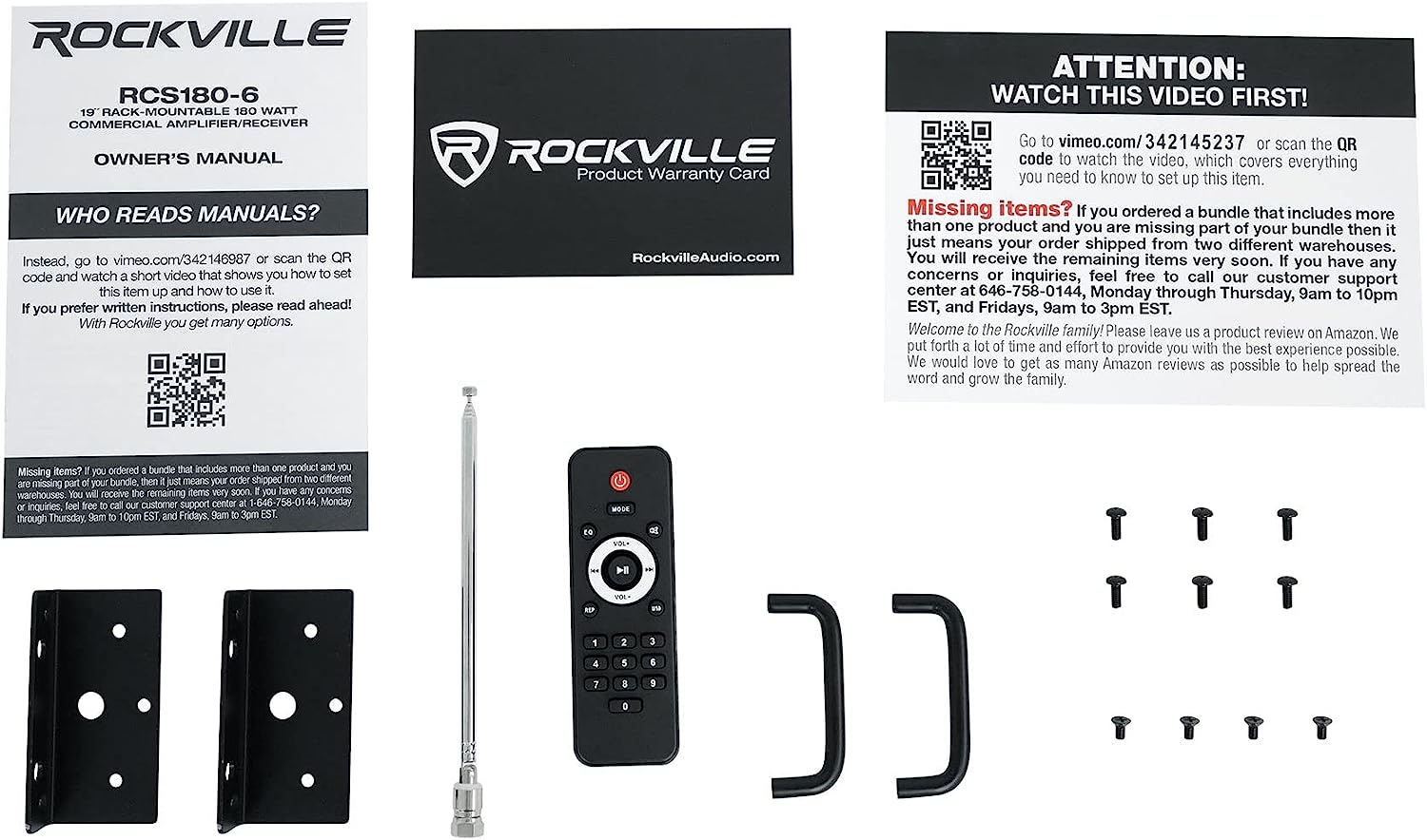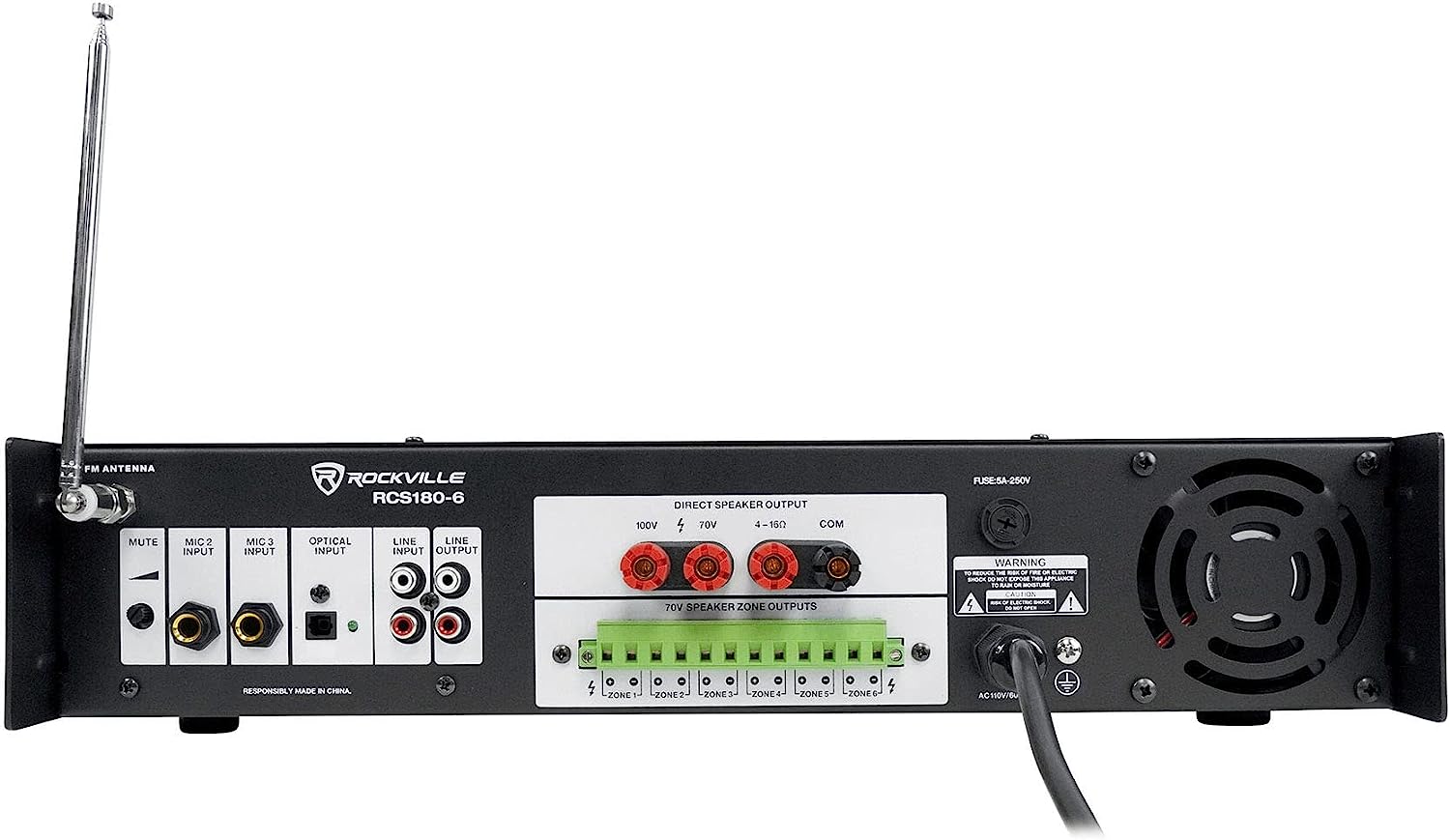 • Rockville RCS180-6350 Watt commercial/restaurant amplifier 19" rack mountable (removable rack brackets) digital hybrid amplifier/receiver. Capable of 70 volt, 100 volt, 8ohm, and 4 ohm. 70/100 volt RMS Power: 184 Watts. 4-16 ohm binding post speaker output. 6-Zones of speaker outputs - each zone has a separate volume control. 70 and 100 volt binding post outputs for single zone playback of all 180 watts. Built in Bluetooth audio streaming. FM radio tuner