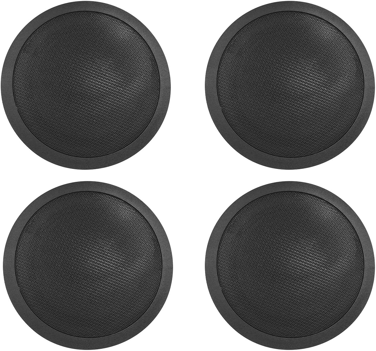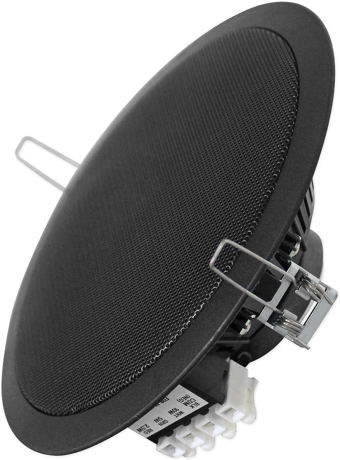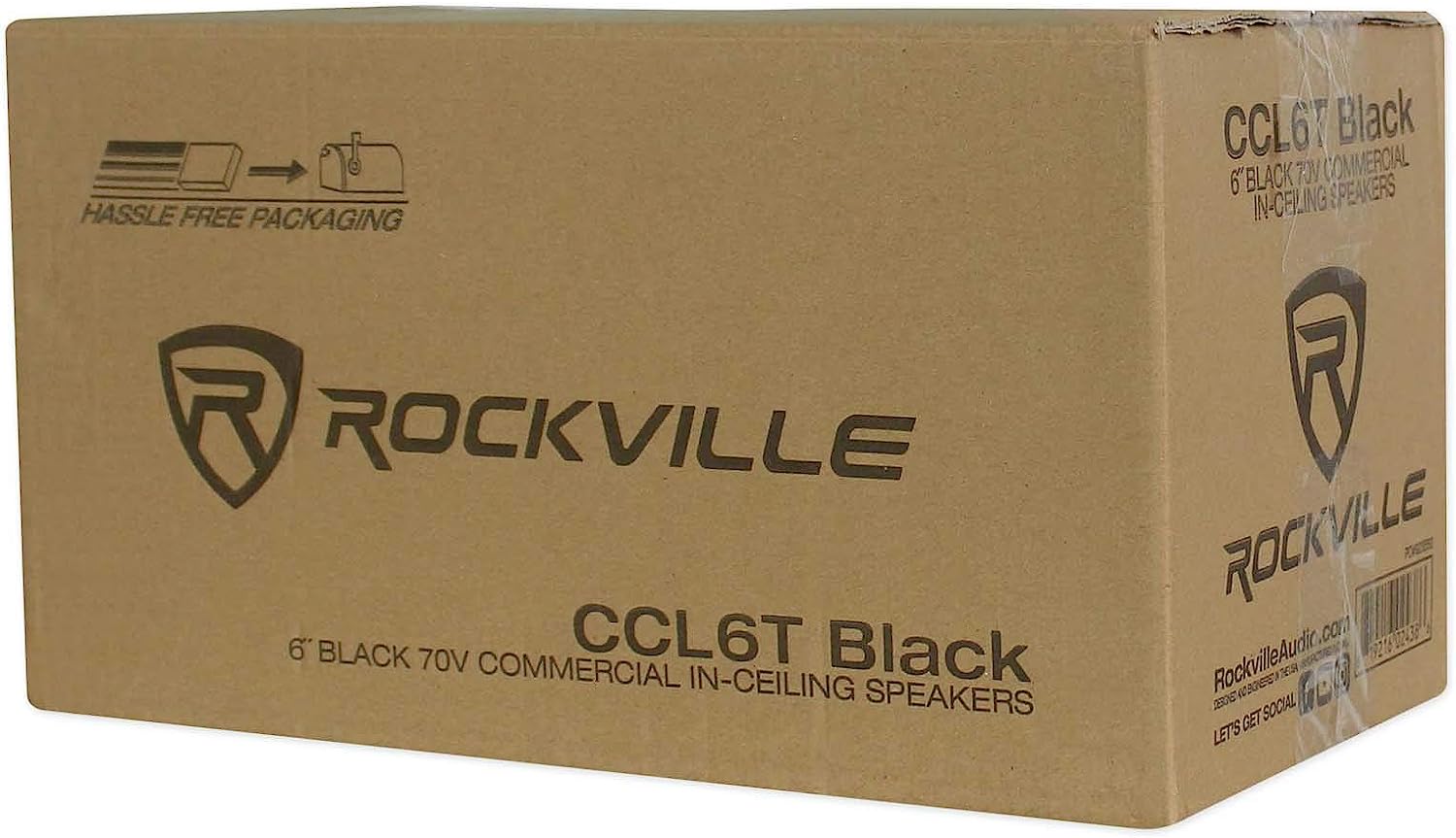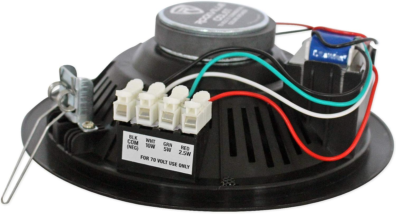 (4) Rockville CCL6T BLACK 70V 6" Commercial ceiling speakers. Perfect for PA announcements or background music or any other applications where you want many speakers installed. Transformer with terminals for 10 watts, 5 watts, or 2.5 watts. Perfect for restaurants, offices, schools churches, buildings, and other commercial applications. Double paper cone. 0.75” voice coil. 3.5 oz ferrite magnet. 6” woofer. Fireproof screw terminal block. High quality spring loaded push terminals. Paintable flush mount grills. Frequency response: 80Hz – 15kHz. Sensitivity: 88dB @ 1W/ 1M. Impedance: 1K, 2K, 4K ohms. Mounting depth: 2.36”. cut-out diameter: 6.5”. color: Black (paintable) .