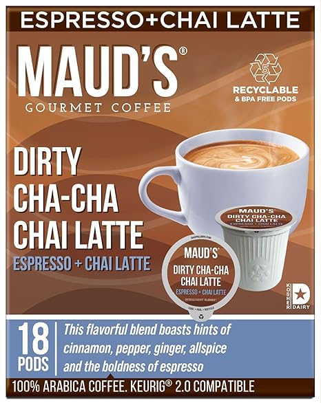 Maud's Espresso Chai Tea Latte Tea Pods, 18 ct - Dirty Cha Cha Chai Latte Flavored Tea, Solar Energy Produced Recyclable Single Serve Chai Latte Pods Compatible with Keurig K-Cup Brewers
