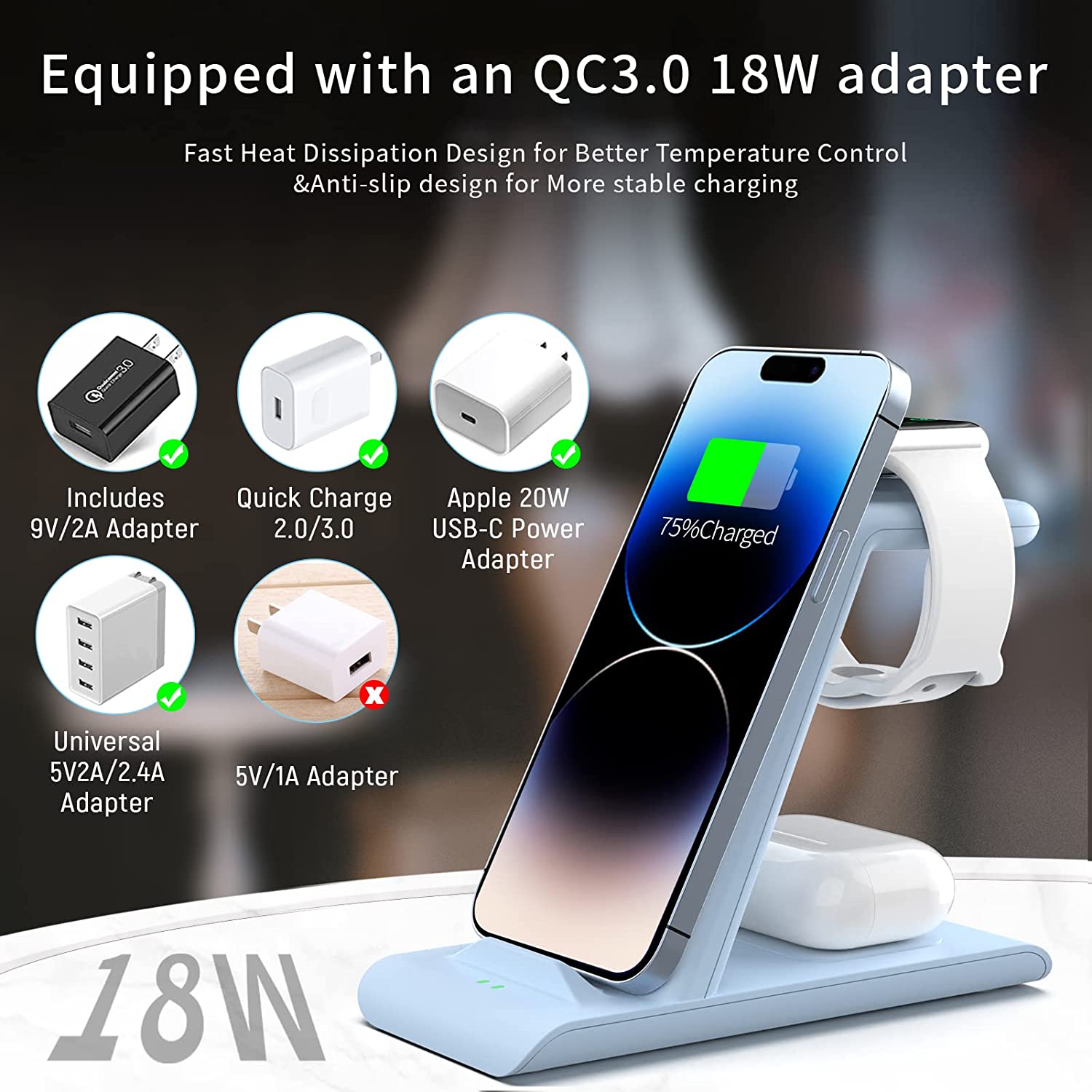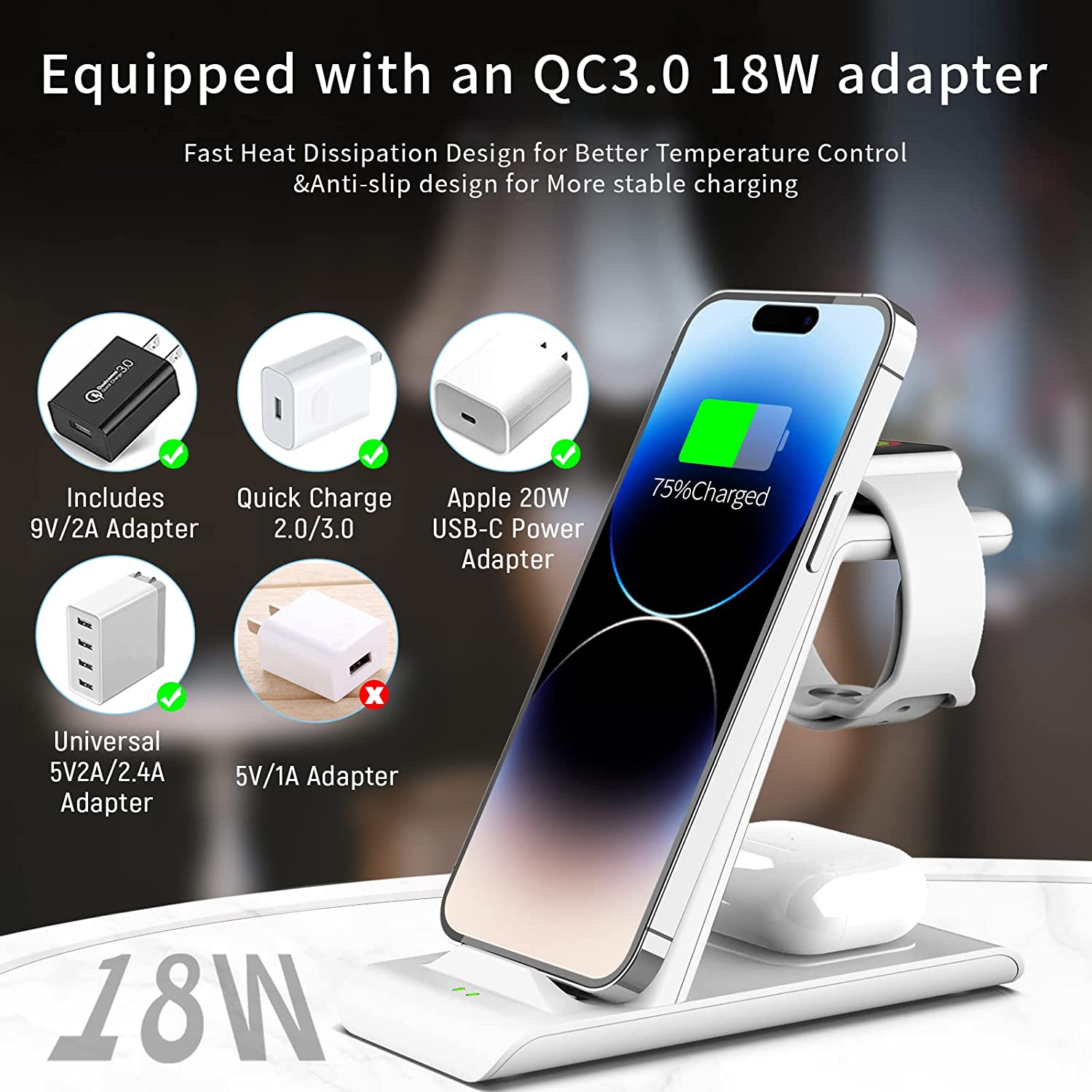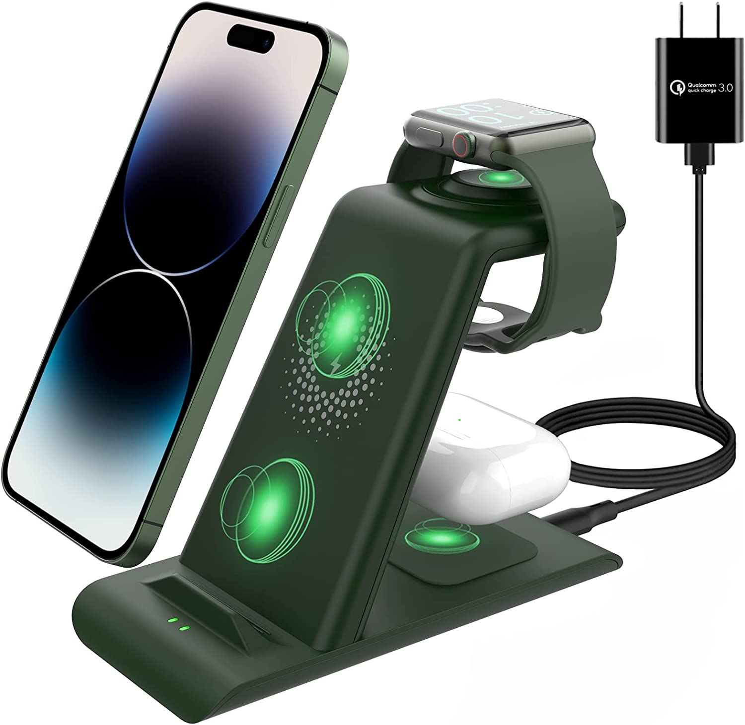• 【Package & 1 year warranty】1* 3 in 1 Apple charging station wireless charger+1*QC3.0 adapter +1*USB charging cable. We are free to replace it or make a refund for you if there is any quality problem of the Apple wireless charging stand when using, please contact us feel free,we always here to solve problem for our customer,thanks.(update: this charger charge AirPods 3rd generation 2021 and iphone 13 series)