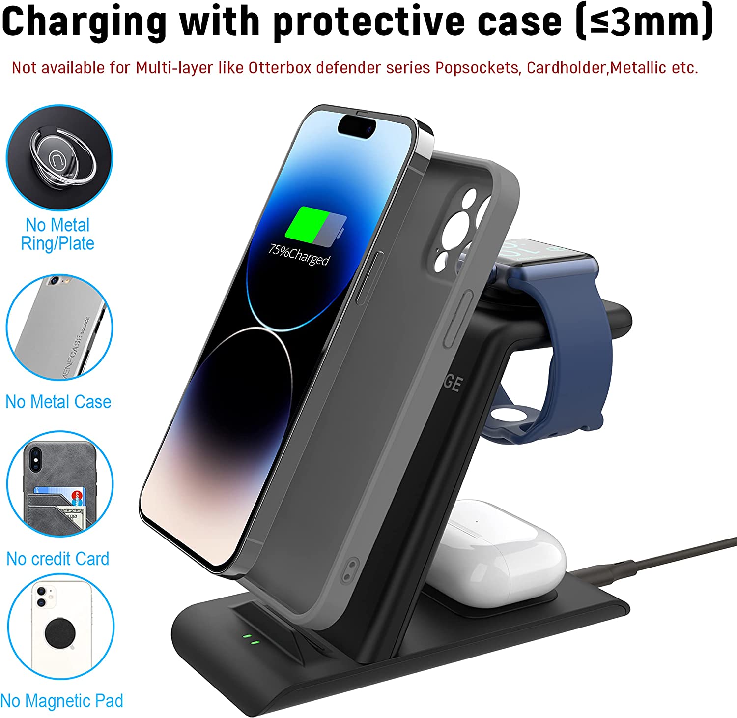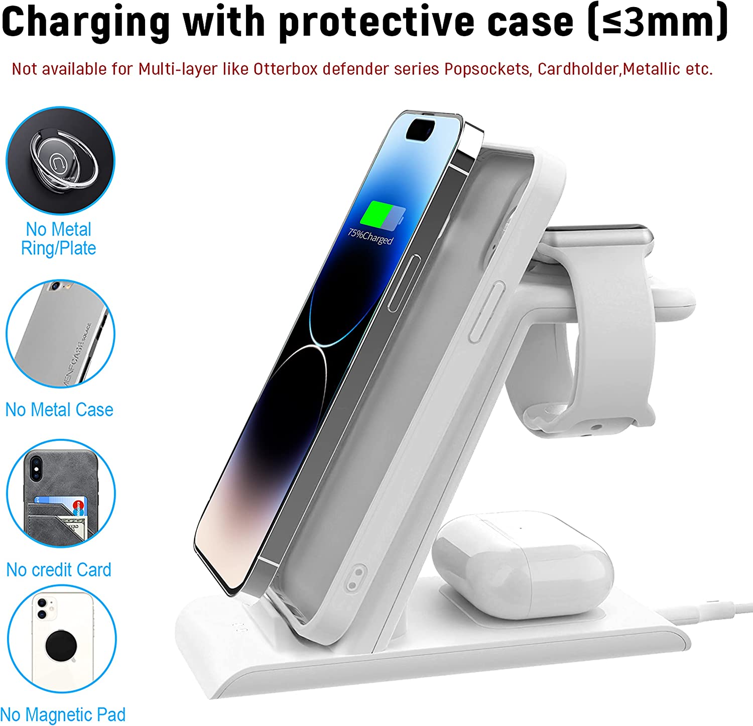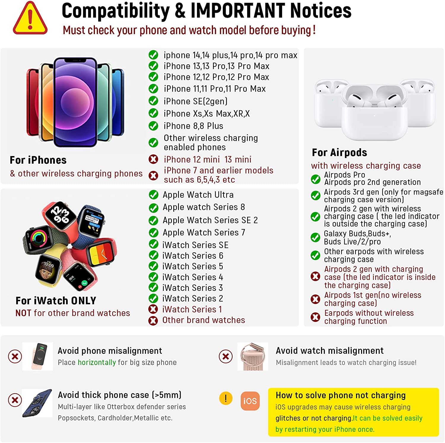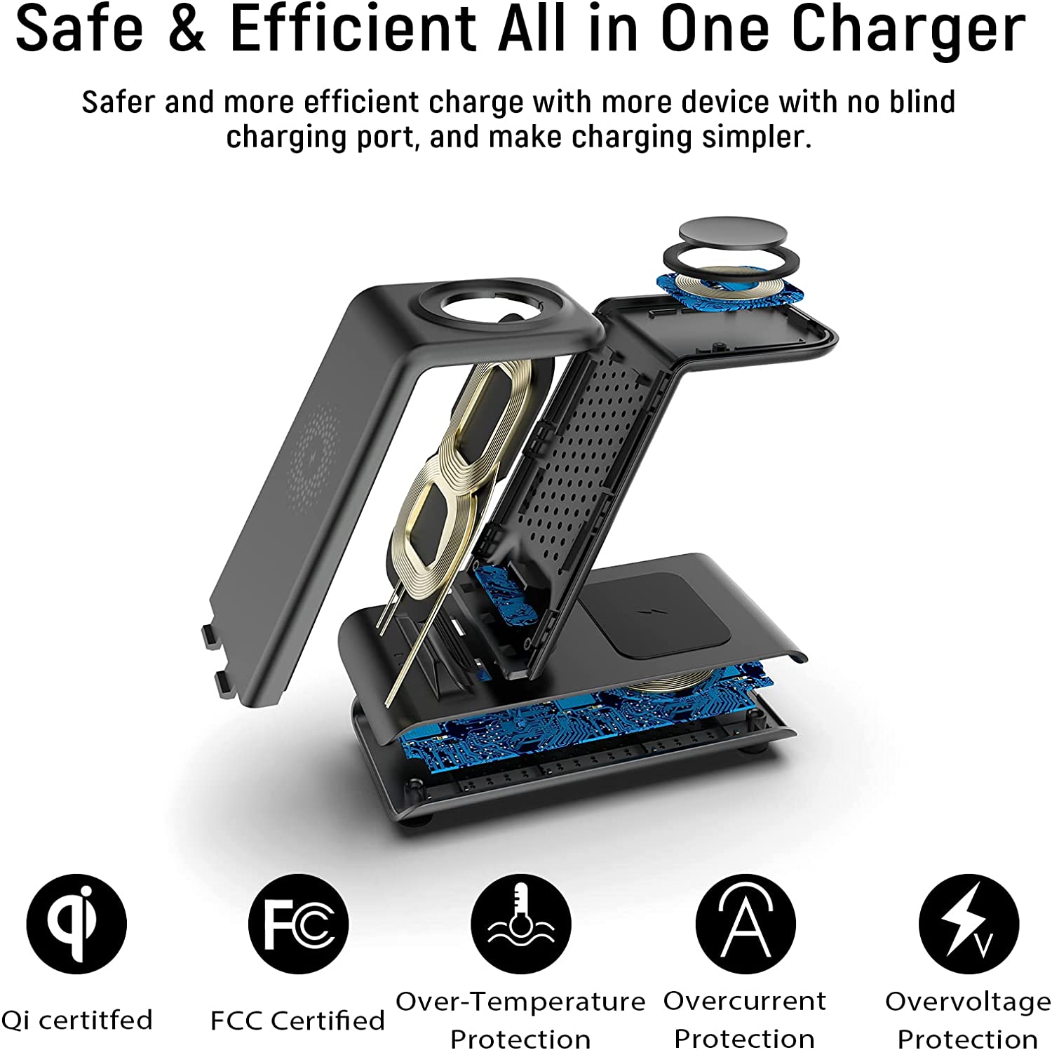 • 【Efficiency & Smart 】Qi-Certified standard : WPC Qi 1.2.4 wireless charging Regulation,intelligent match charging 4-coil design,smart match apple watch charger /iphone/airpods according to the different power requirements of devices,and greatly increases the devices high efficiency wireless charging at speeds up to 1.7A and low power consumption in stand by mode,safely maintain the battery. It Work with a wireless charger inside the phone/watch cover.