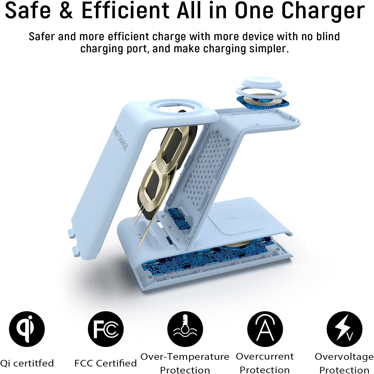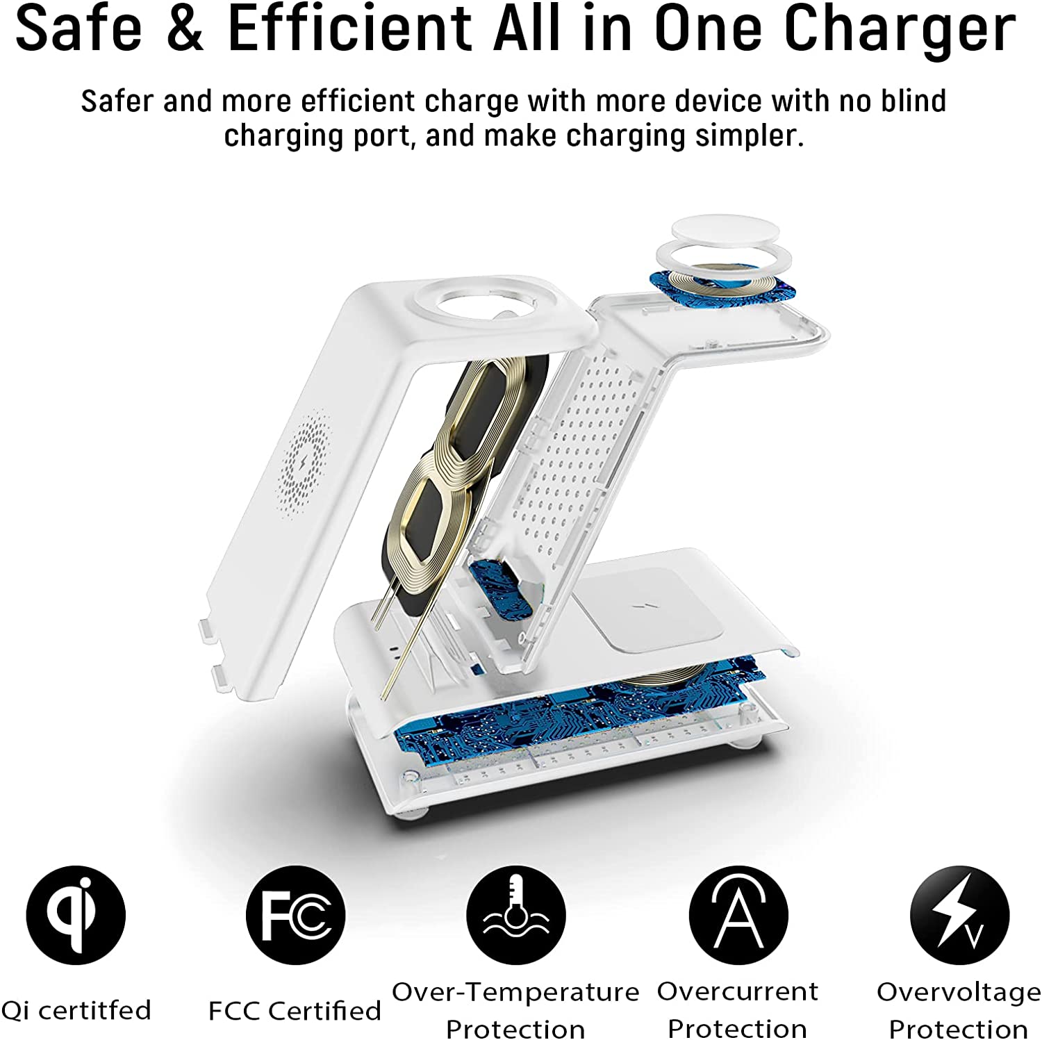 • 【Multiple Certified Safe Wireless Charging Station】Approved by QI,CE,FCC,ROHS.This 3 in 1 Wireless charging station for apple products multiple devices,it's made by ABS+PC & Purity Copper Wire,sturdy yet lightweight,this apple watch charger iphone charging station is built with Over-current,over-voltage,over-temperature,short circuit protection, foreign substance examination,valid identification of metallism disturbance protection,this wireless charger offer you safe charging protection.