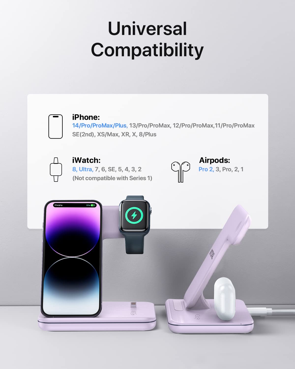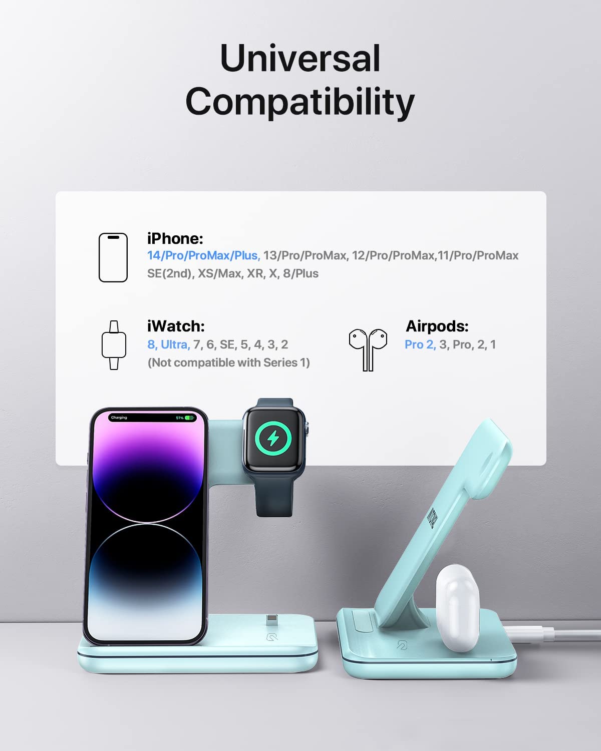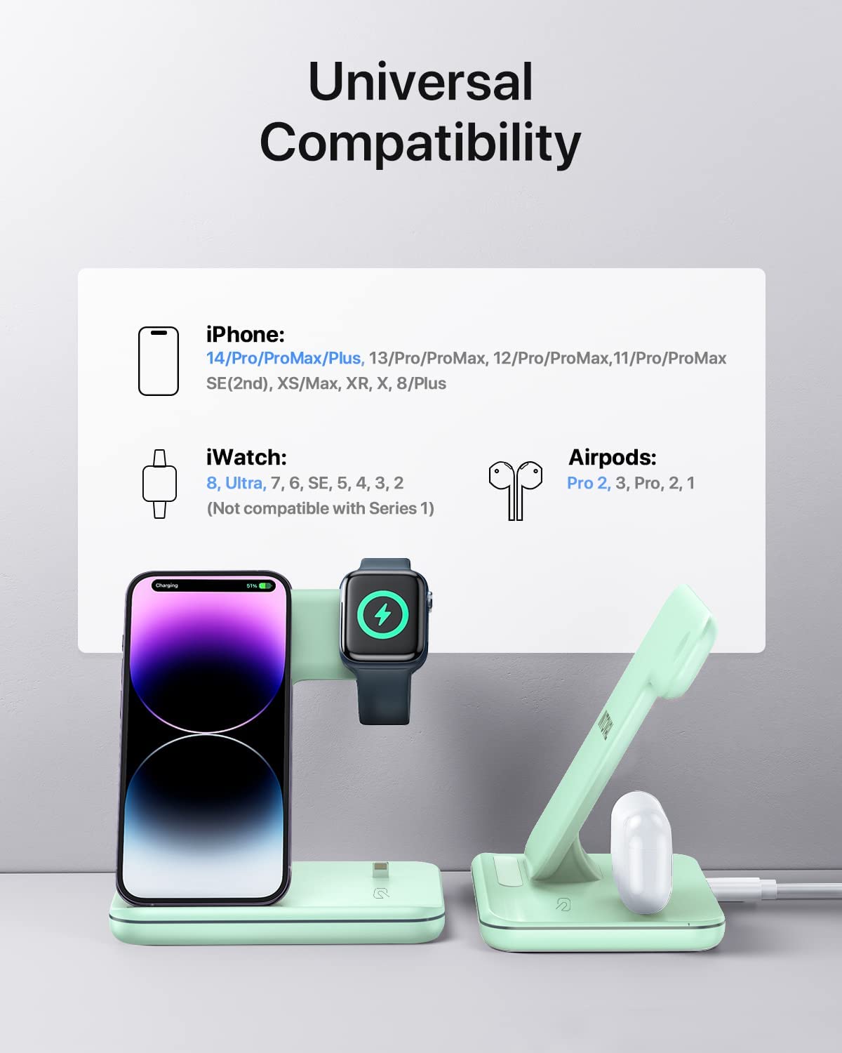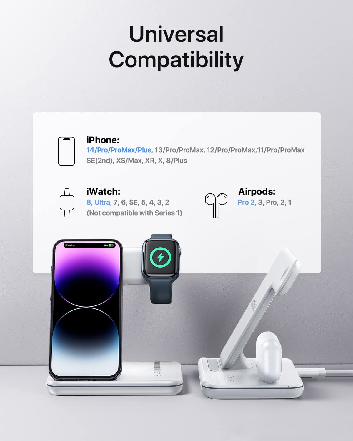 • 【Universal Compatibility】 Qi-standard works with iPhone 13/13 Pro/13 Pro Max/13 Mini/12/12 Pro/12 Pro Max/12 Mini/11/11 Pro/11 Pro Max/XS/XR/XS MAX/X/8/8Plus, iWatch series 7/6/SE/5/4/3/2 (series 1/original not supported) and AirPods Pro/3/2/1, and other 100+ popular wireless charging phones.