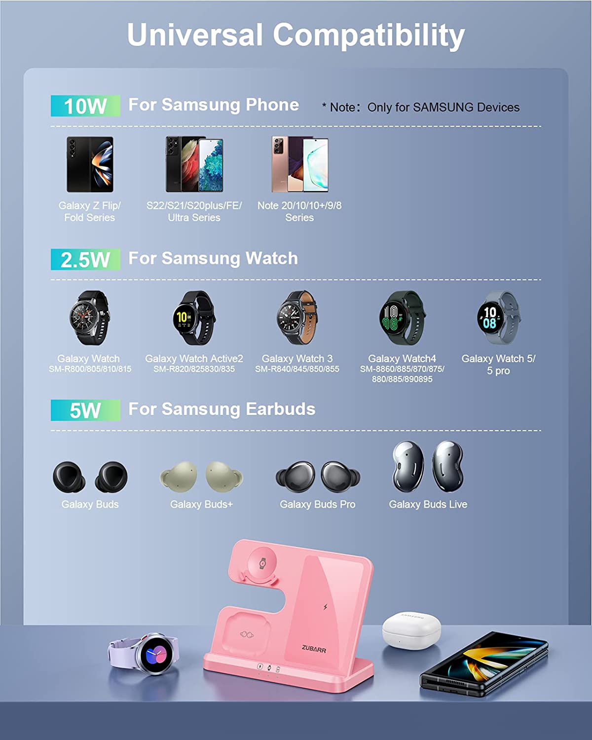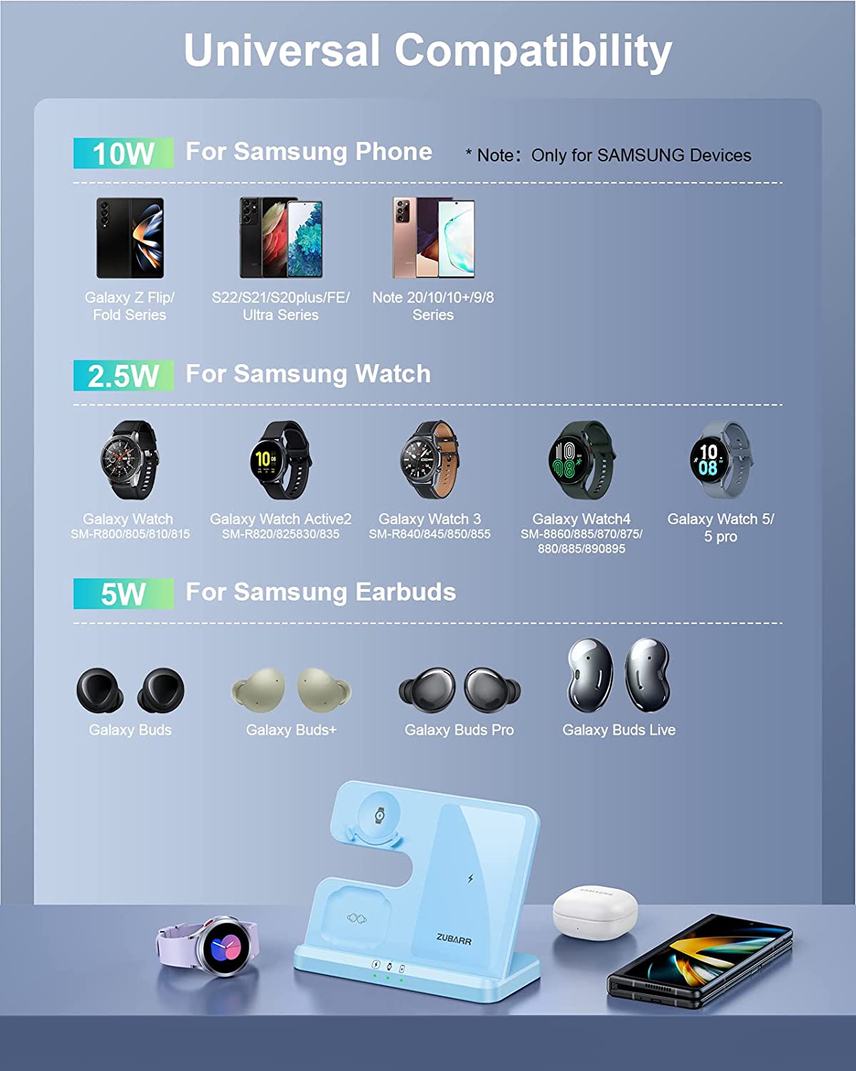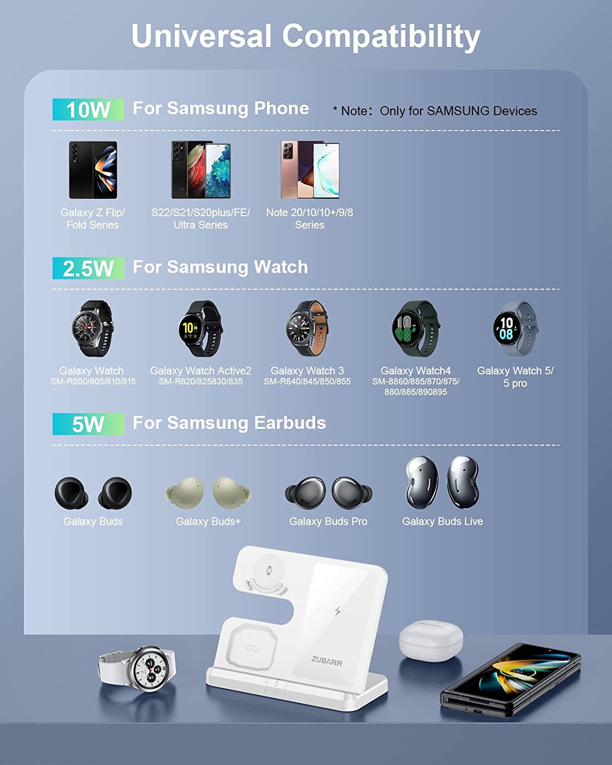 • 【Compatible with Samsung Multiple Devices】 This ZUBARR Wireless Charging Station for 3 in 1 is specifically designed for your Samsung devices, for Samsung Galaxy Z Flip/Fold Series, for Galaxy S22/S21/S20 plus/FE/Ultra, Samsung Note20/10/10+/9/8, for Galaxy Watch 5/4/3, for Galaxy Buds/Buds Pro/Live. (Attention: Not for Apple.)