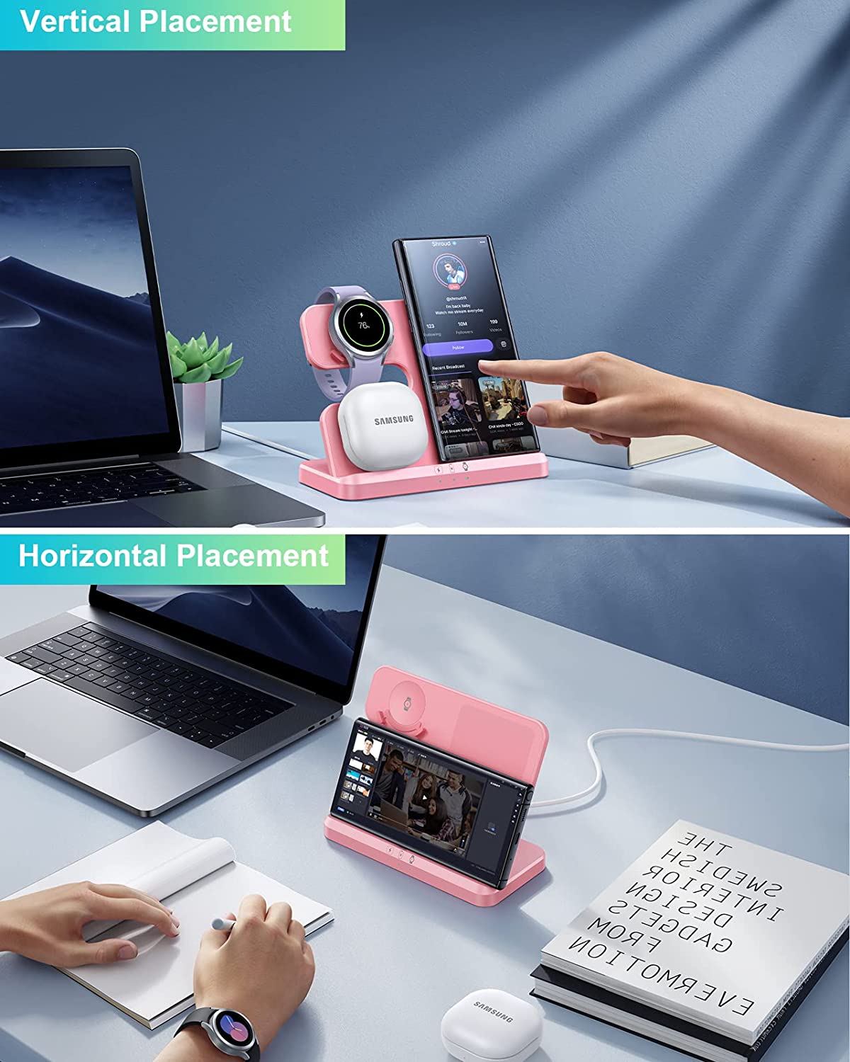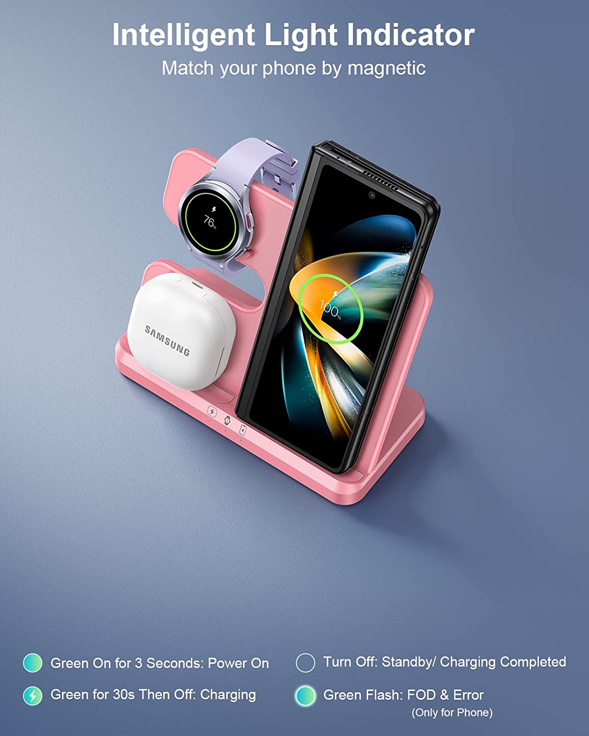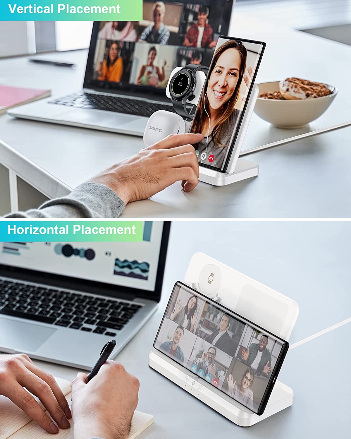 • 【Friendly Charging LED Indicator Lights 】Independent LED indicator lights on the of this wireless charger station dock stand for Samsung devices provide clear charging indication for each Samsung devices, phone/galaxy watch/earbuds and it will let you quickly know the charging status of your Samsung multi-device.