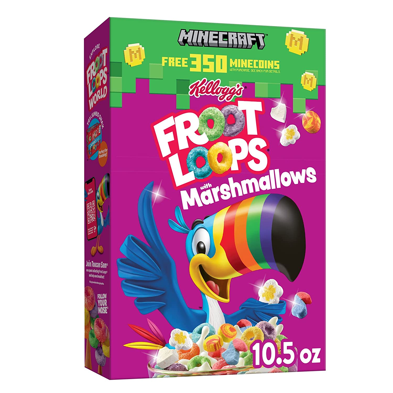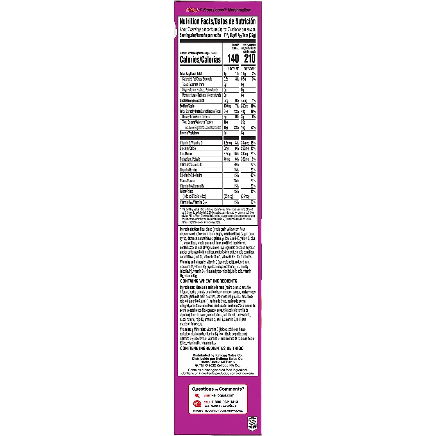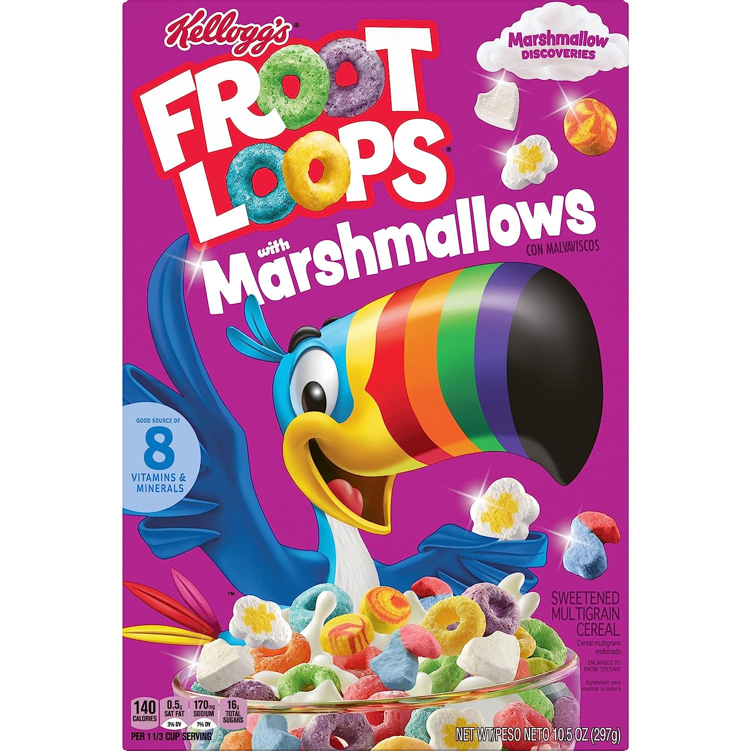Follow your nose to tasty bursts of fruity flavor in Kellogg's Froot Loops Marshmallows sweetened multi-grain breakfast cereal. Dig into marshmallows and colorful crunchy O's made with natural fruit flavors. It's like a rainbow in every bowl, with grains as the first ingredient. A low-fat cereal for adults and kids, and good source of 8 vitamins and minerals per serving. Your family can enjoy it with milk or dairy alternative in the morning, afternoon or as a late-night treat; great for snacking by the handful at work, at school, in the car, and simply on the go. Add fruity goodness to any lunch box, tote bag or backpack so you always have this sweet cereal treat handy. Any time you want to include a flavorful pick-me-up in your day, reach for a box of Kellogg's Froot Loops Marshmallows cereal.