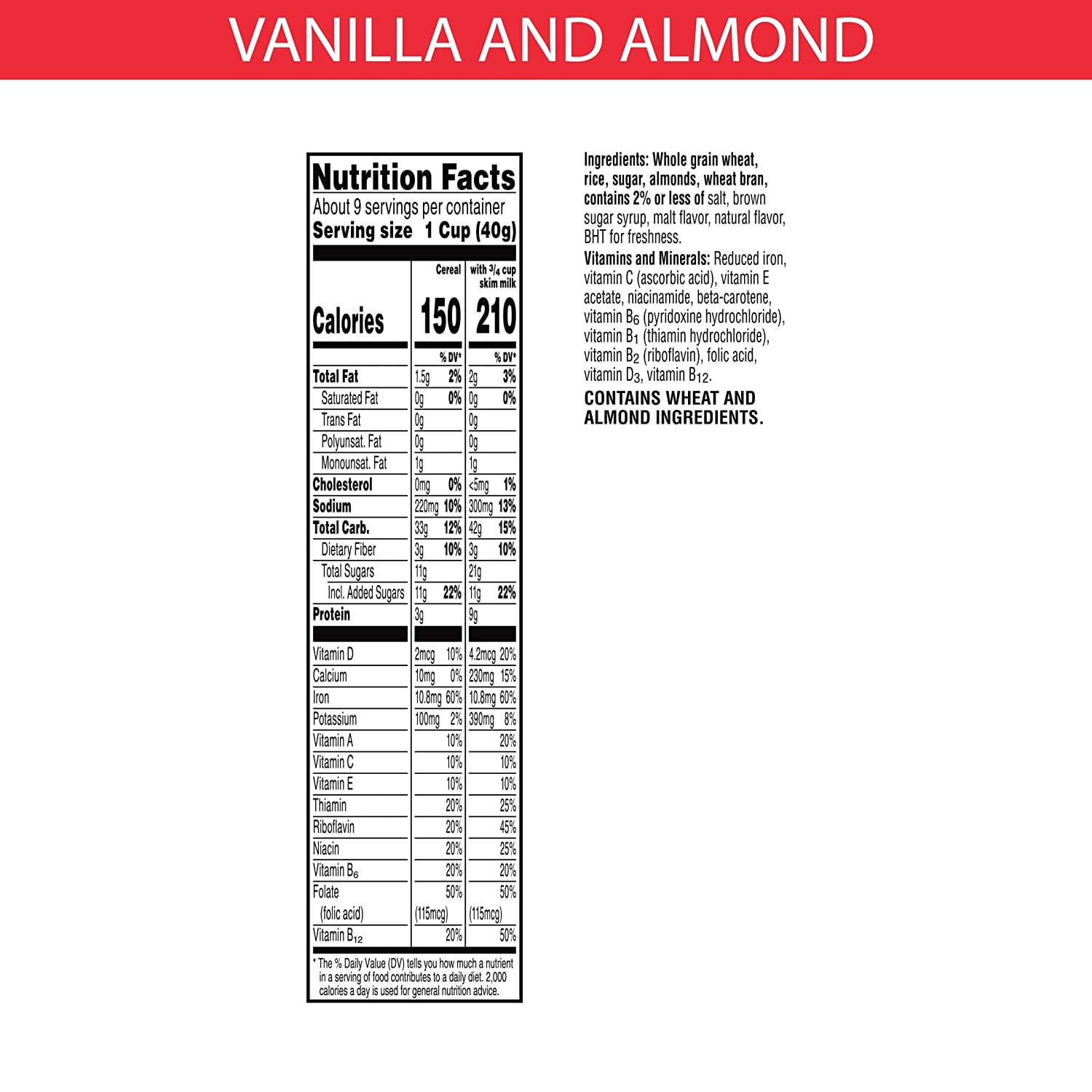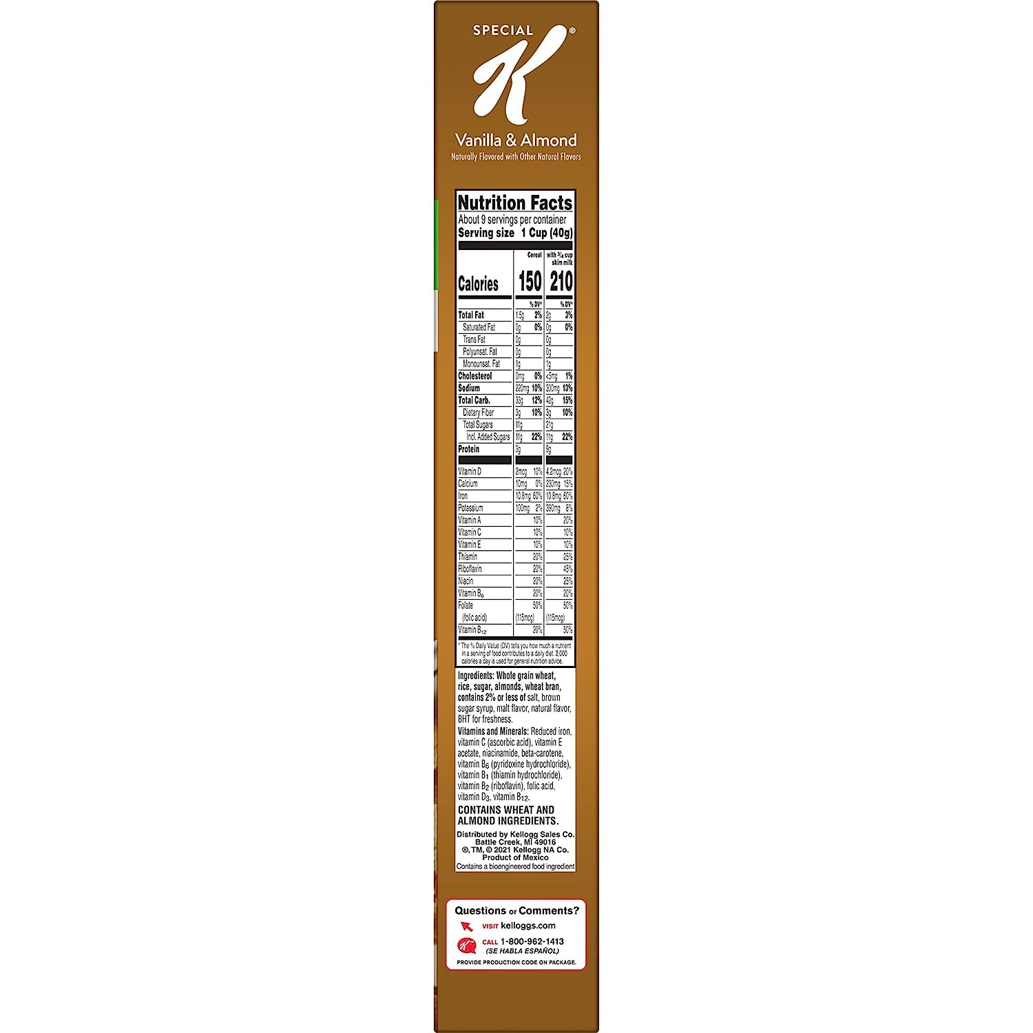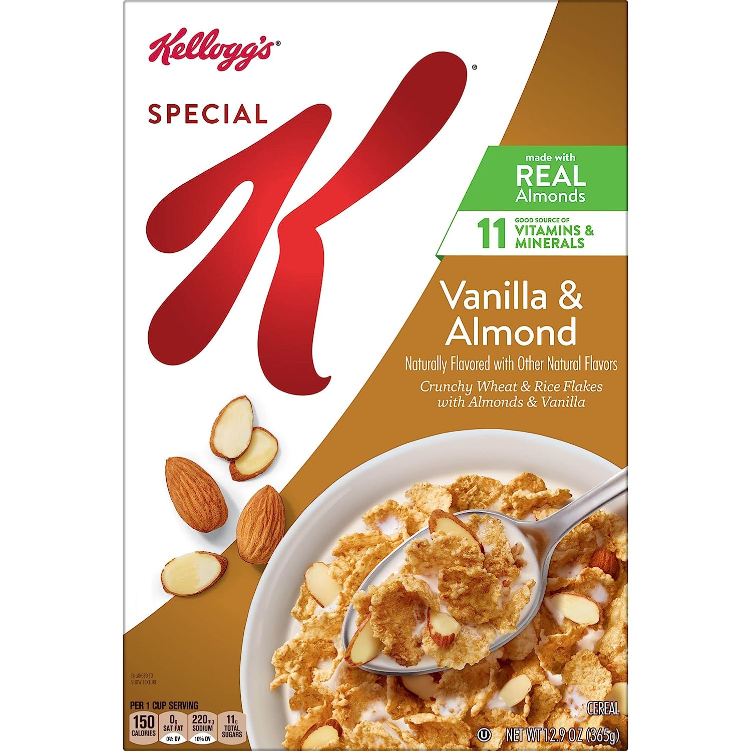 Do what's delicious with Special K Vanilla and Almond. Includes 1, 12.9-ounce box of wholesome breakfast cereal made from tasty ingredients. Crisp, toasted wheat and rice flakes paired with vanilla and sliced real almonds help you stay on track for the day ahead. Nutritious and delicious, every bowl provides a good source of 11 vitamins and minerals. Made with fiber (contains 1.5g total fat per serving), B vitamins, and iron, plus Vitamins A, C, and E as antioxidants women need (beta-carotene (source of vitamin A)); no artificial colors or flavors. Make it an irresistible, low-fat part of your lunch, dinner or late-night snack. Try it as a convenient work day or between-meal treat. Enjoy Special K with dairy or nut-milk. Add it to your favorite yogurt, smoothie, or trail mix recipe. Morning time or any time, Kellogg's Special K Vanilla Almond cereal is a flavorful choice the whole family can feel good about.