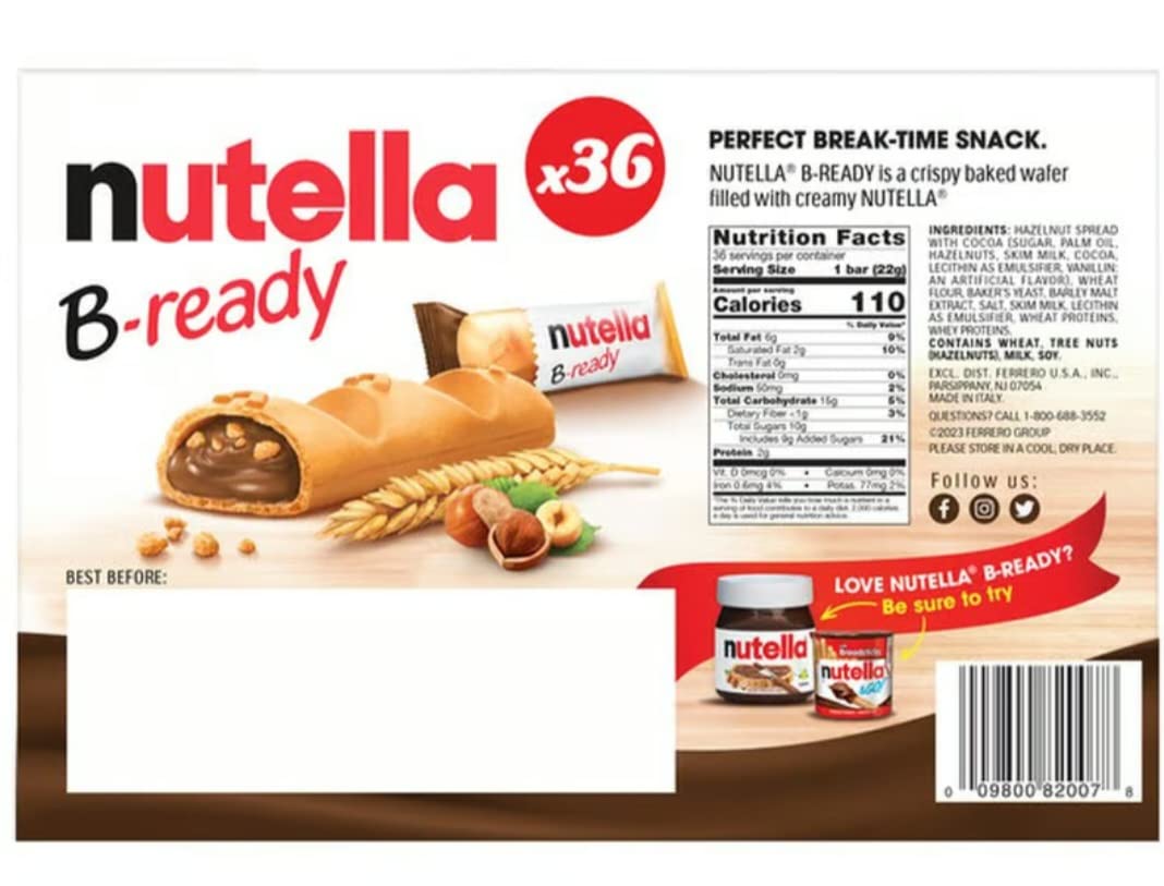 Nutella B-ready, 36Ct, packaged with BRYANT DESAI SUPPLIES pen Crispy Wafers Filled with Nutella Hazulnut spread with cocoa Perfact breaktime Snack made in italy