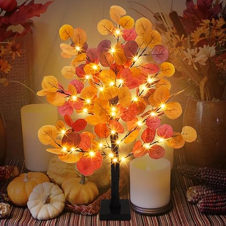 Artificial Tree, 24 inches Eucalyptus Leaves, 60 LED Lights with Timer, Battery Operated, Tabletop Decor for Home, Wedding, Thanksgiving