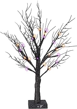 FUNPENY Lighted Black Birch Spooky Tree, 2FT Halloween Battery Operated Tree Lights with Spider Web and Spider, Indoor Table Desktop Holiday Decorations (Purple & Orange)
