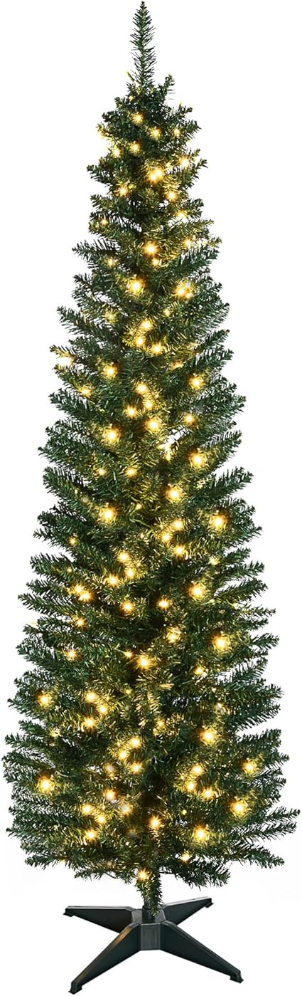 HOMCOM 6' Tall Pre-Lit Slim Noble Fir Artificial Christmas Tree with Realistic Branches, 200 Warm White LED Lights and 390 Tips, Green