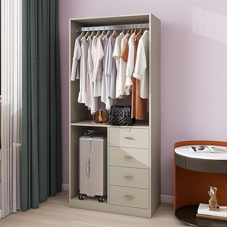 Wood Closet Systems for Built in Closets: Closet organizers and Storage Stand-alone with Garment Rack Shelves 4 Drawers and Hanging Rod Closet Gray 31.5"W x 15.7"D x 70.8"H
