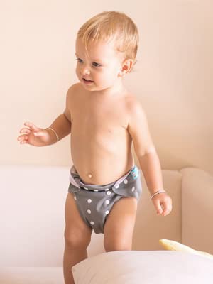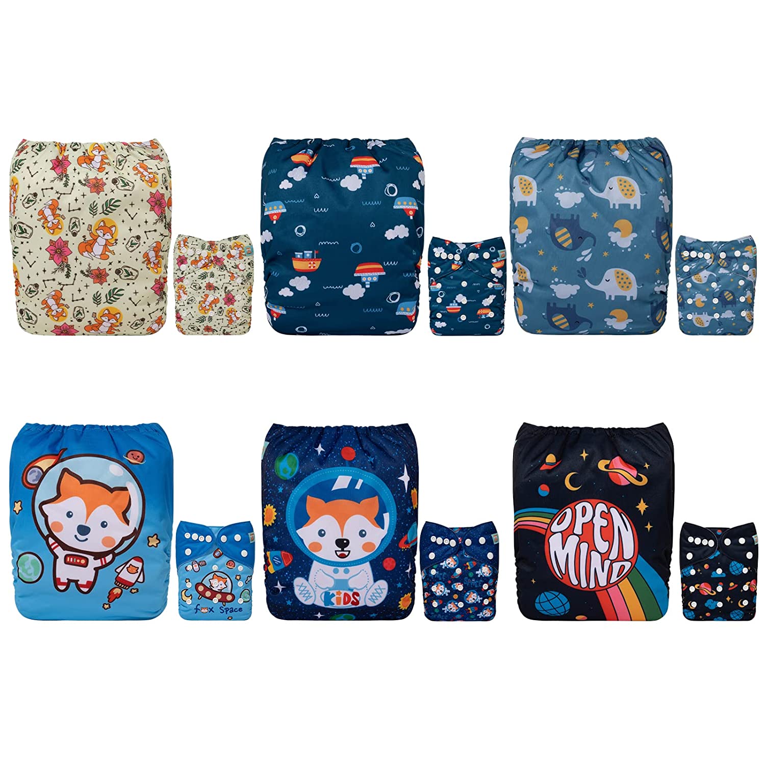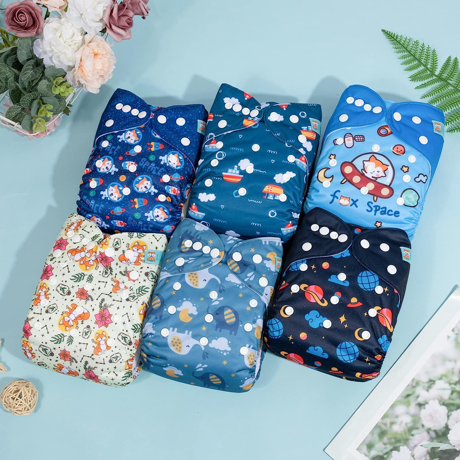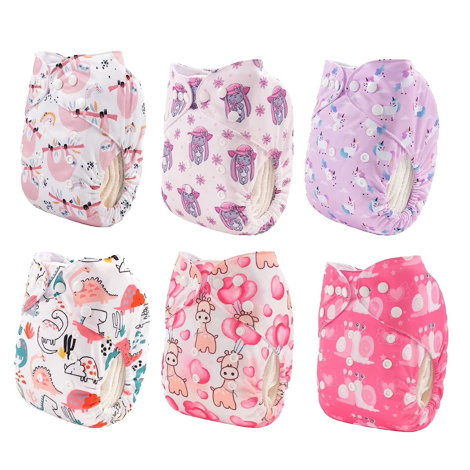 • HAPPY BABY -Hip snaps and crossover snaps to prevent “wing droop”. Washable, waterproof and breathable.Comfortable elastic legging area to prevent leaking. Package included: 6 diapers + 12 inserts.