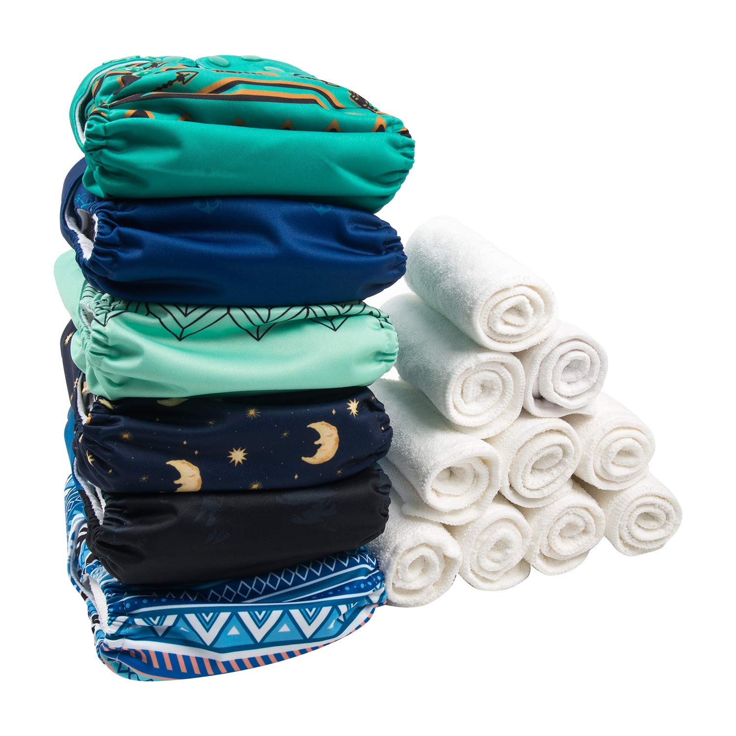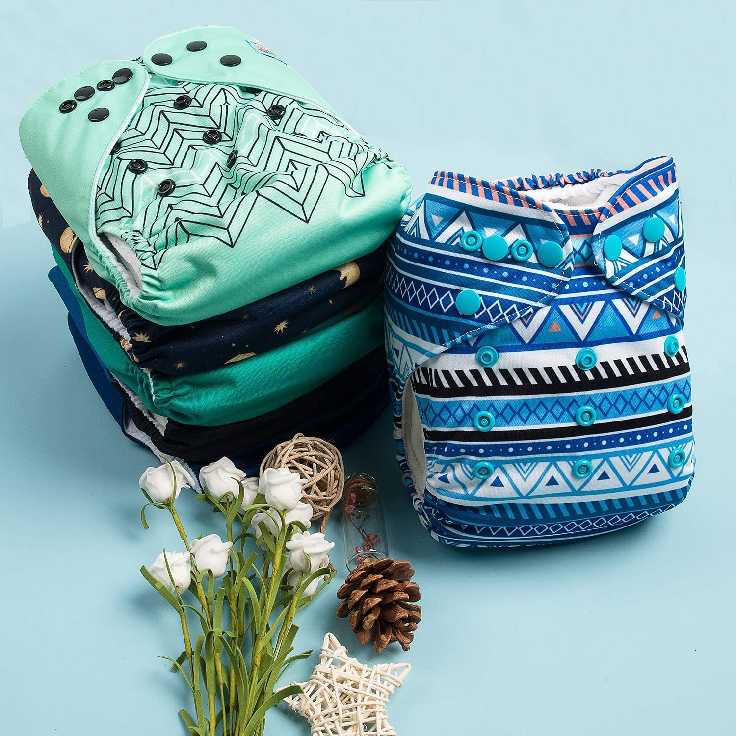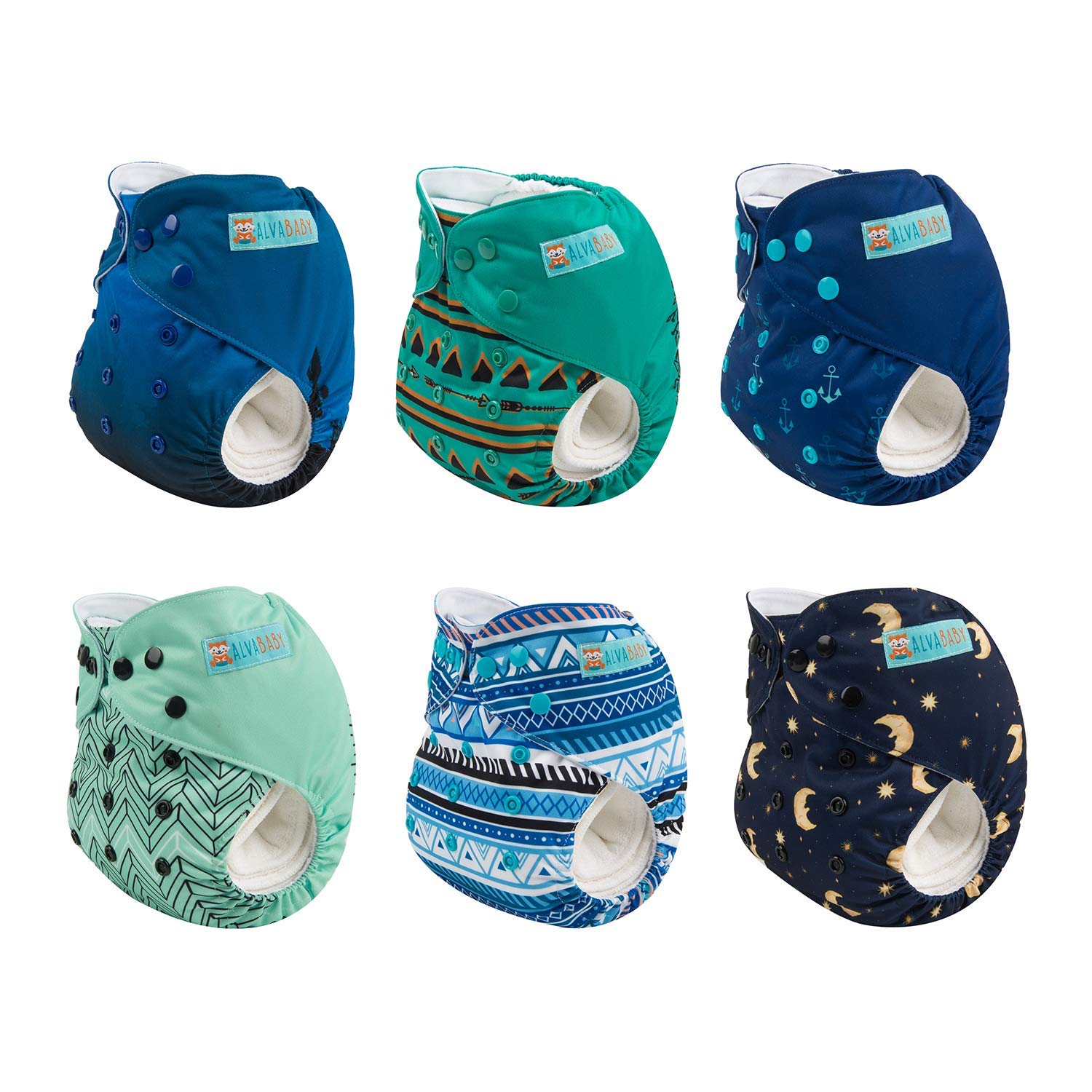 • ENJOY -Hip snaps and crossover snaps to prevent “wing droop”. Washable, waterproof and breathable.Comfortable elastic legging area to prevent leaking. Package included: 6 diapers + 12 inserts.