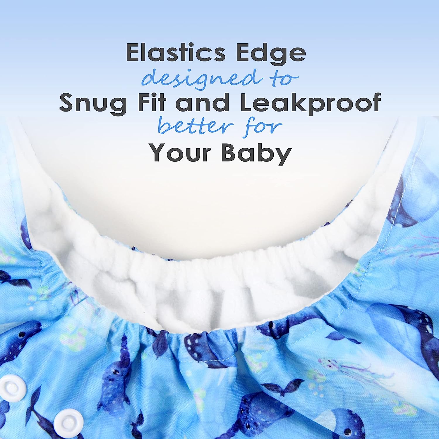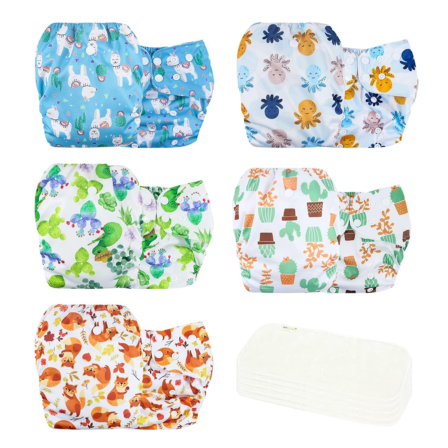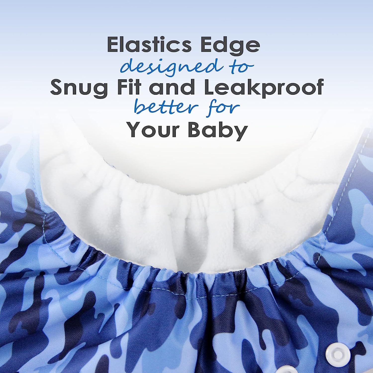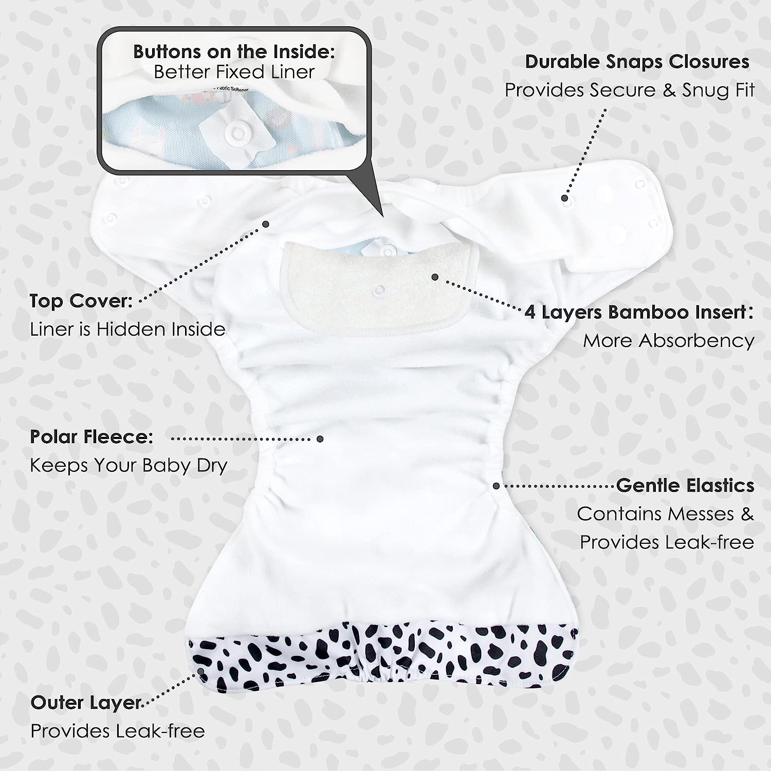 • Soft Exterior: Polyester, leek-free and breathable PUL, this kind of soft materials, breathe and better construction diapers help keep your baby comfortable. Double Rows of snaps fit well, the leg gusset can keep off the leaks.